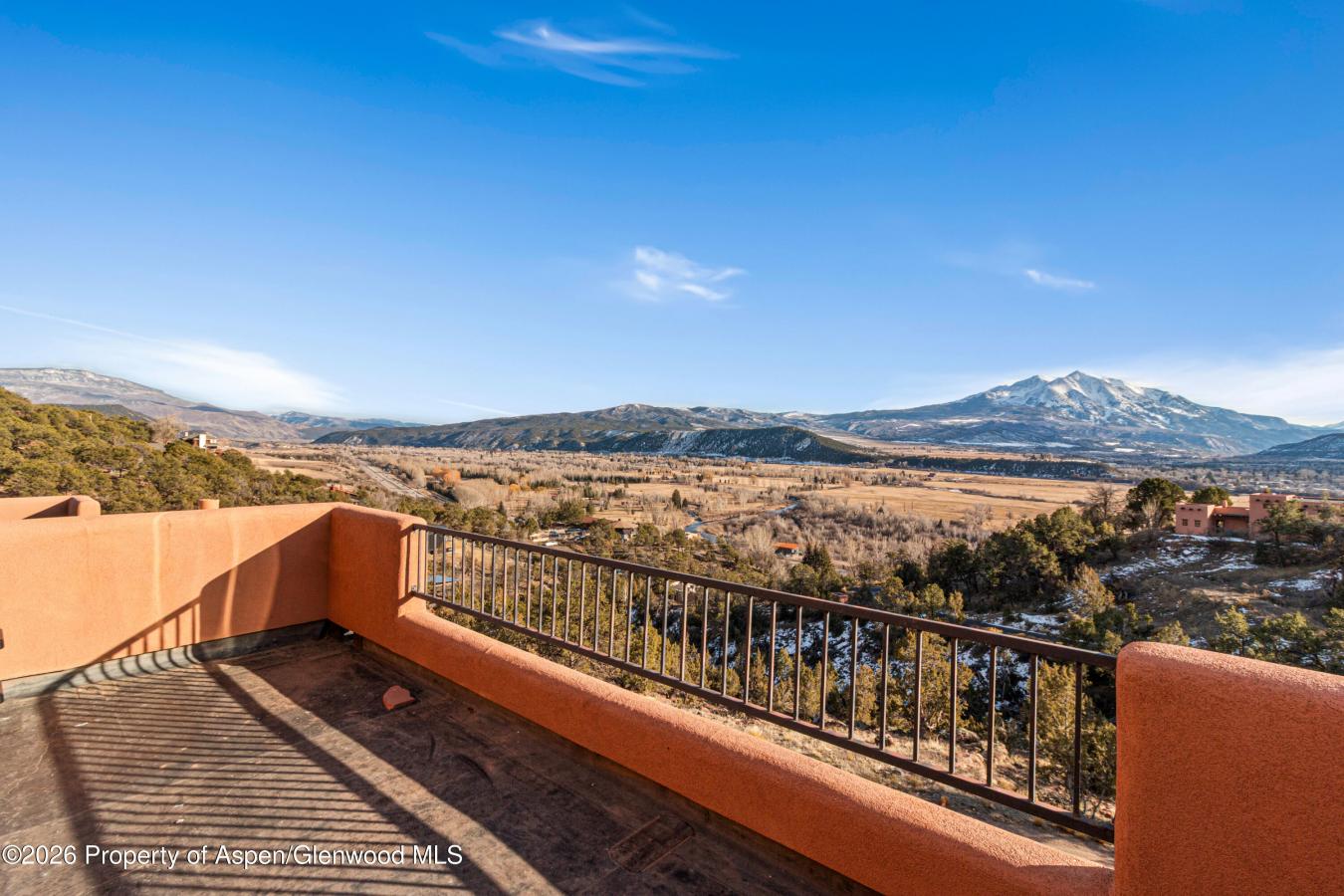 Welcome to an extraordinary luxury retreat in the coveted Los Adobes neighborhood, just five minutes from downtown Carbondale. Privately positioned on 2.2 hillside acres, this exceptional residence is framed by mature pinyon trees and captures panoramic views of Mt. Sopris and the Roaring Fork River from every level, as well as from expansive patios and decks designed for seamless indoor-outdoor living. Thoughtfully crafted in timeless Southwestern adobe style, this 4-bedroom, 3.5-bath home with a 2-car garage blends architectural character with modern comfort. The main level unfolds with a welcoming foyer leading to open-concept kitchen, dining, and living spaces filled with natural light. The primary suite offers a walk-in closet, spa-inspired steam shower, and direct access to a private patio with Jacuzzian ideal setting for sunset evenings and starlit skies. An additional bedroom or office and a full bath complete the main level with flexibility and convenience. The lower level provides two spacious bedrooms, a full bath, laundry room, and an expansive recreation or family room. A bonus room is perfectly suited for a theater or music studio, while a distinctive rock-climbing wall adds a unique and playful touch. The top floor features a private office or creative studio with its own deck, offering inspiring views and quiet separation. Outdoor living is equally compelling, with abundant year-round sunshine on the south-facing patio and a shaded lawn area tucked behind the home for relaxed entertaining and privacy. Rich, authentic finishes define the interior, including a traditional Kiva wood-burning fireplace, exposed barnwood beams, Venetian plaster walls, stained concrete floors, and beautifully crafted knotty alder doors and trim throughout. The gourmet kitchen is equipped with Bosch appliances, generous cabinetry, and a beverage cooler, creating a functional yet refined culinary space. Additional highlights include (3) wall-mounted air conditioning units, a private outdoor hot tub, low-maintenance exterior and landscaping, and a paved driveway with ample guest parking. Ideally located just minutes from hiking and biking at Red Hill, premier golf at Aspen Glen, River Valley Ranch, and Ironbridge, vibrant downtown Carbondale, and only thirty minutes to the world-class skiing, dining, and culture of Aspen and Snowmass Village.