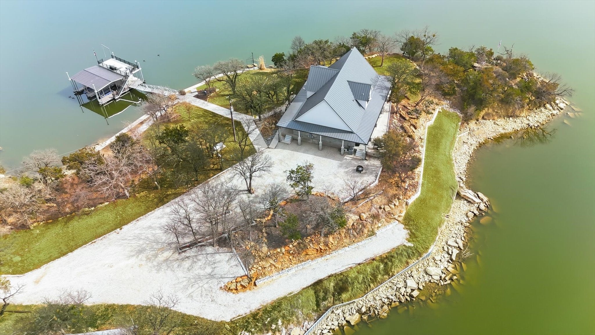 Set on the peaceful west side of PK, this property sits on 1.5 acres of secluded waterfront providing outstanding privacy, calm DEEP waters and expansive open lake views. The property is thoughtfully arranged to highlight outdoor living with tiered terraces, shaded gathering areas and stone pathways that lead naturally to the waters edge, a multilevel private dock serves as the centerpiece of lake life. The dock features 2 boat slips, 1 personal watercraft slips & generous covered, open areas designed for relaxing or entertaining family & friends, Completed in 2022, the custom built home offer a modern open layout that connects seamlessly to the outdoors. The main living area features soaring ceilings, expansive windows framing the lake, statement lighting and a centrally located wood-burning stove. The chefs kitchen is designed for gathering after long days on the water & includes premium stainless steel appliances double refrigerator & ovens, abundant cabinetry & ample storage. The main level includes a spacious primary suite with a soaking tub, walk-in shower & separate closets, along with a guest bedroom full bath & utility room. Upstairs, a loft overlooks the living area accompanied by 2 additional bedrooms, a full bath and generous storage. An unfinished attic space offers flexibility for future expansion. This private peninsula property delivers a rare opportunity to enjoy P K Lake at its finest- combining privacy, modern luxury, protected waterfront & spaces designed for true lake living.
