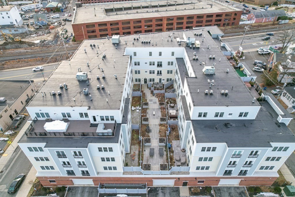 Rare opportunity to own a corner unit at Wakefield Station! Conveniently located within walking distance to shops, restaurants, Lake Quannapowitt, & the commuter rail. Built in 2018, this exceptional 2 bed 2 bath unit offers luxurious comfort and amenities you would expect from a modern condo. Upon entering, a hallway separates the entrance from the rest of the living & entertaining areas. The open-concept entertaining area is filled with natural sunlight, featuring a modern kitchen overlooking the living room. Primary bedroom features en-suite bath with double sinks and fully tiled walk-in shower. In-unit laundry, gas stove & heat, designer California Closets built-in. Crown molding, wide-plank wood flooring, and recessed lighting throughout unit. Residents enjoy a private gym, bike room, heated garage parking, ground level retail with a local favorite restaurant. Beautiful common areas include a lobby with concierge office, mail & package areas, courtyard with grill and fire pit.