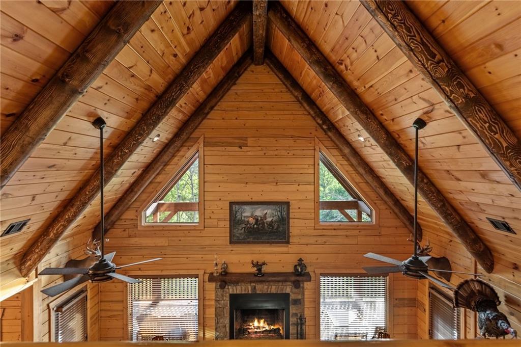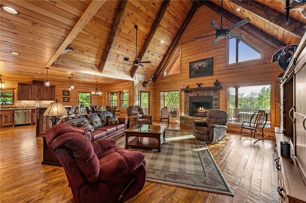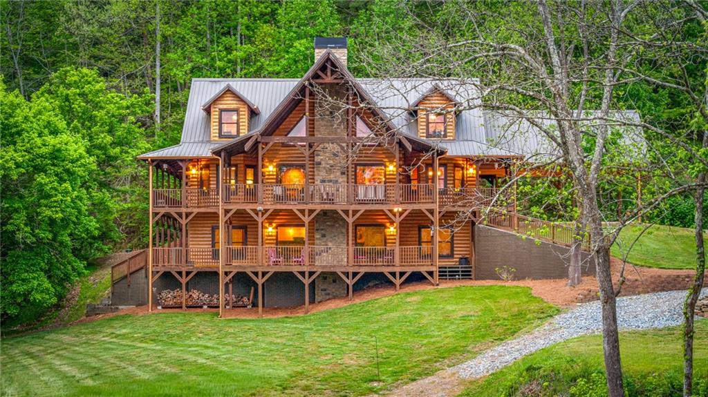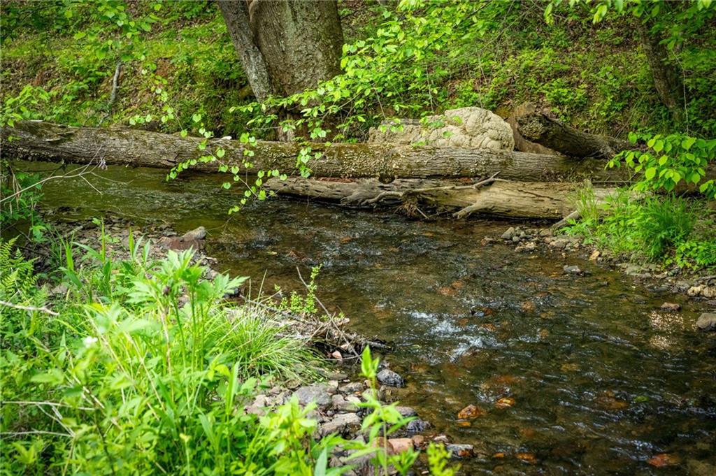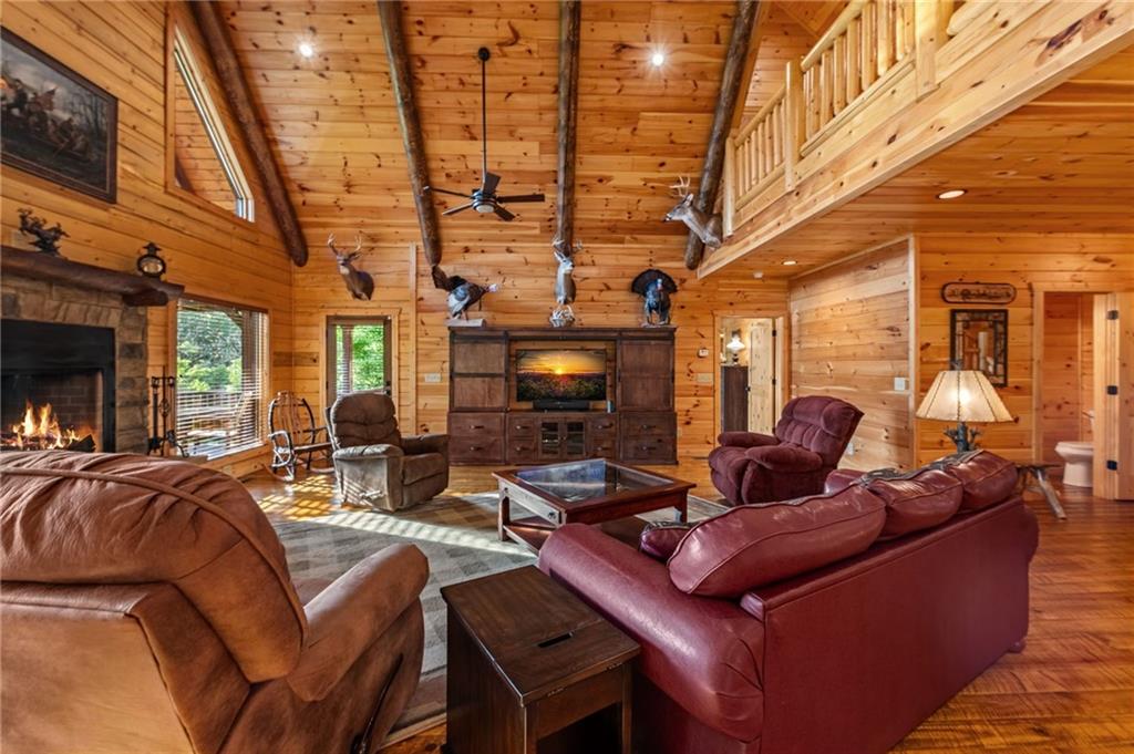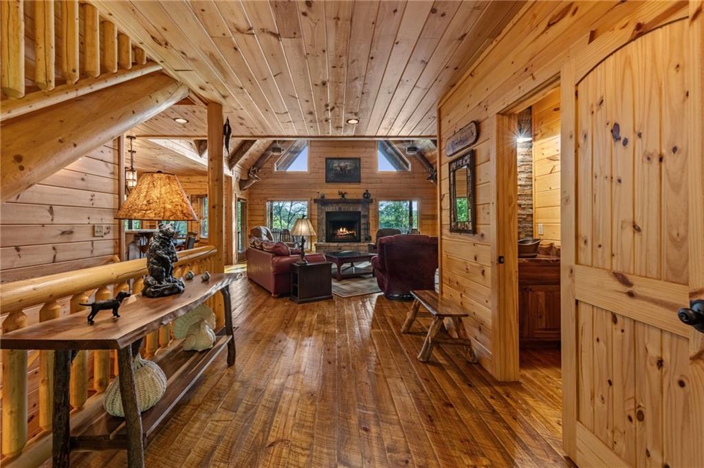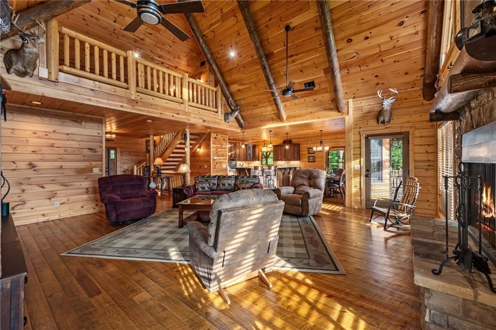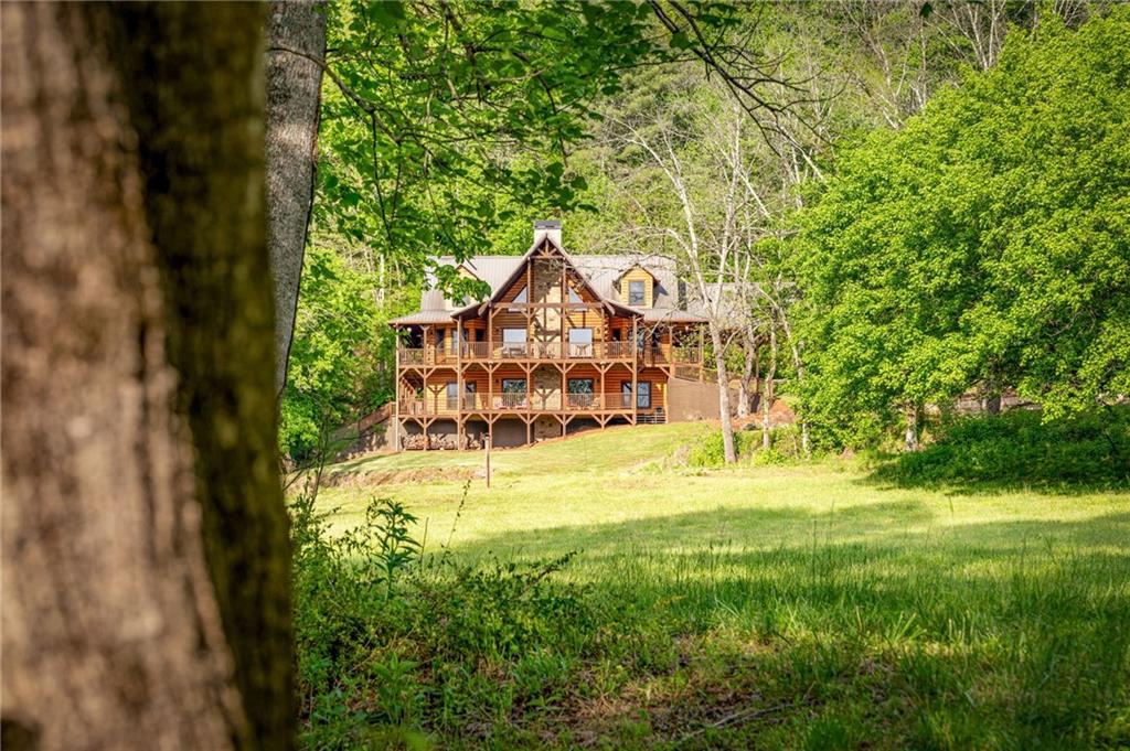 RARE opportunity to own a truly one-of-a-kind Ellijay retreat76.68 acres within the city limits, yet completely private, peaceful, and off-grid, all just a short walk to Downtown! This exceptional Satterwhite Log Home offers 5BR/4.5BA across three levels of living, with Ellijay River frontage, a beautiful year-round flowing creek, multiple springs, and a perfect blend of open pasture and wooded terrain. Private off-road trails wind throughout the propertyideal for UTV and Jeep adventures. Inside, youll find a warm all-wood interior with a welcoming foyer, soaring cathedral ceilings with exposed beams, and a wood-burning fireplace anchoring the great room. The well-appointed kitchen features granite countertops, stainless appliances, gas range, tumbled marble backsplash, pantry, and a mudroom/laundry combo, along with sought-after Blue Buggy wood accents that add character throughout. The main-level primary suite is generously sized, while the upper level offers two private ensuites and a spacious loft overlooking the creek and pasture. The finished terrace level is designed for entertaining or guests, featuring a large family room with gas log fireplace, wet bar, two additional bedrooms, full bath, and ample storage. Enjoy outdoor living on the full wraparound porch and lower-level covered deck, plus a 2-car carport/portico, outbuilding for storage, and fenced dog area. Built with true quality, this home also offers underground power, fiber internet, private well, buried propane tank, and two HVAC units. With no HOA and endless room to explorewhether riding, gardening, or relaxing by the waterthis is the perfect blend of privacy, acreage, and in-town convenience a legacy property families hold for generations!