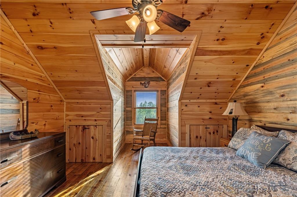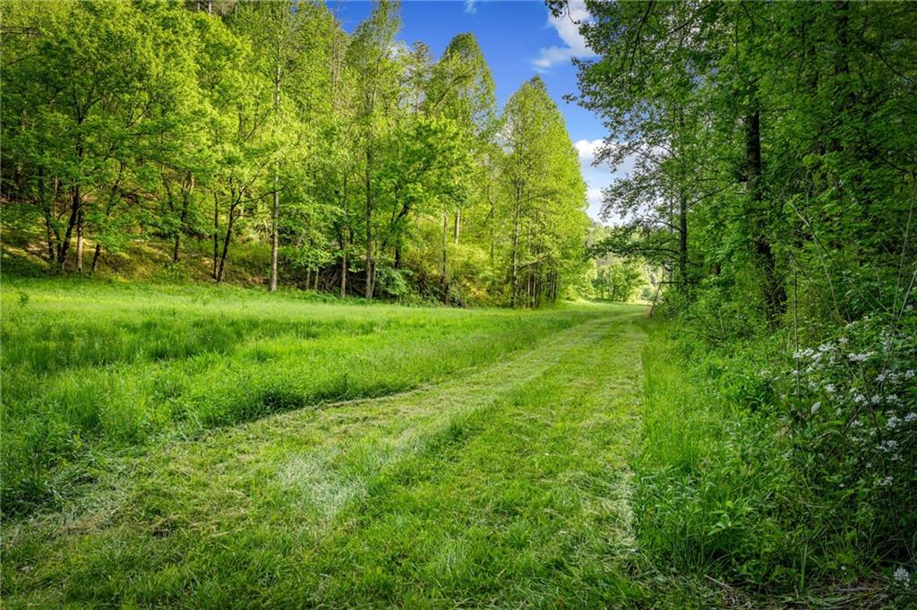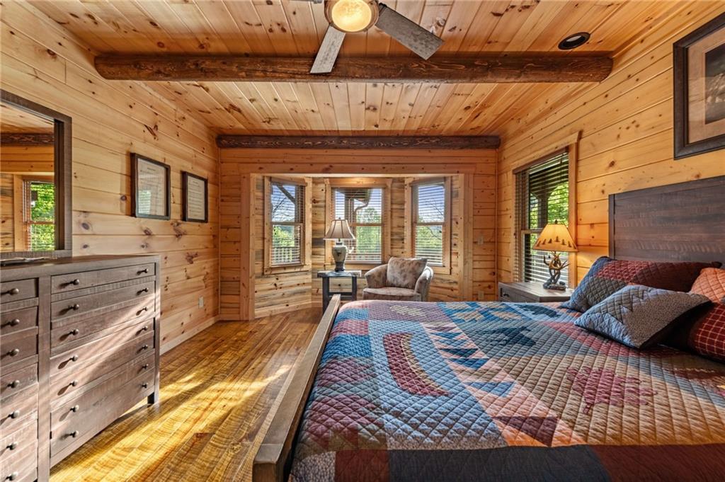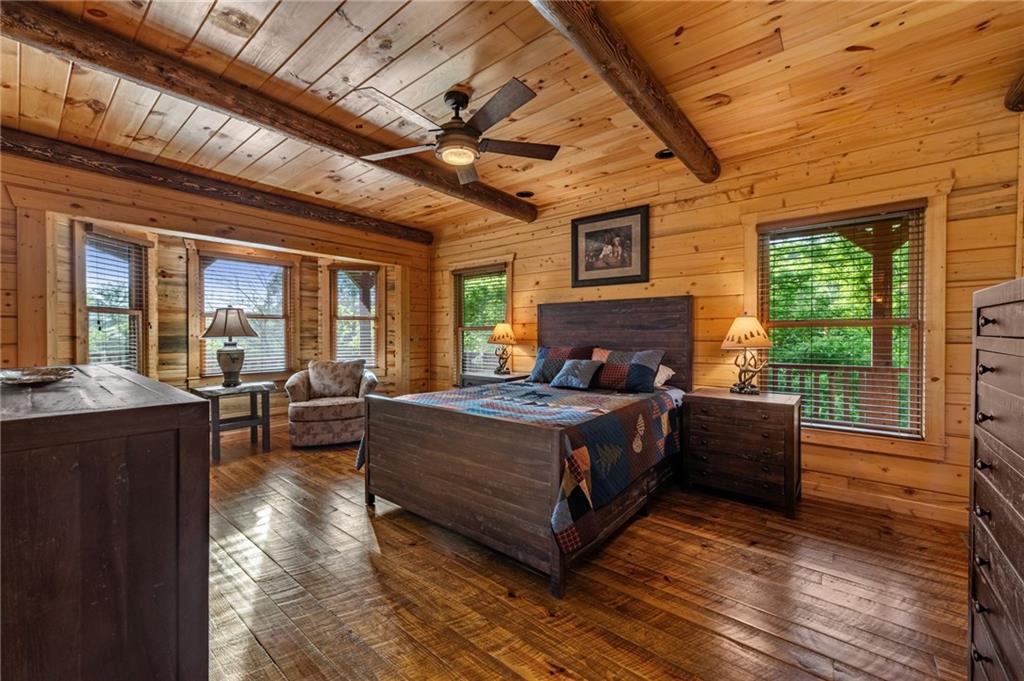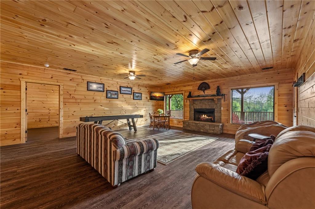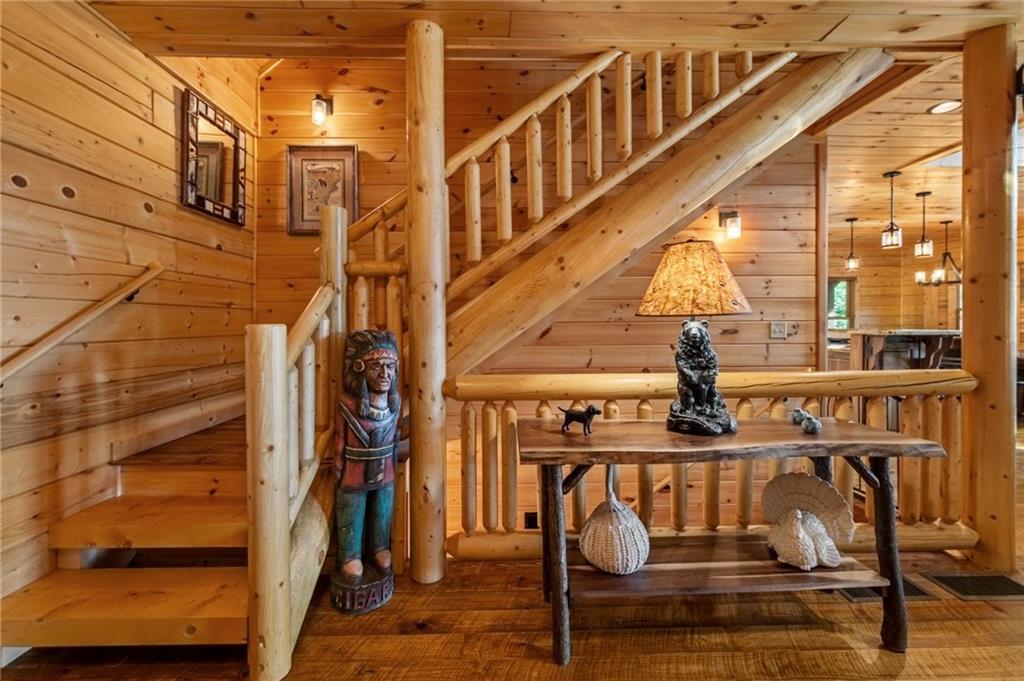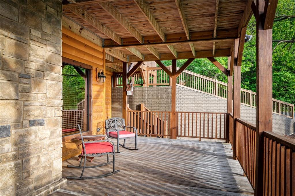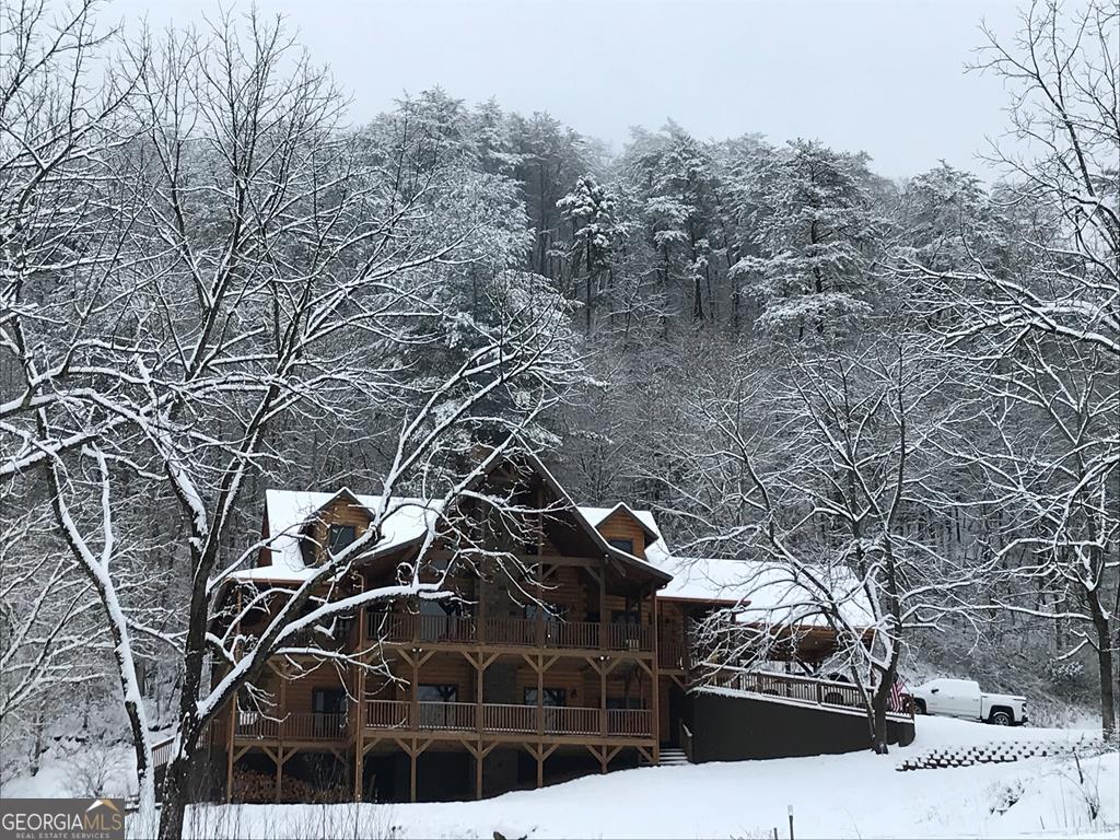 RARE opportunity to own a truly one-of-a-kind Ellijay retreat76.68 acres within the city limits, yet completely private, peaceful, and off-grid, all just a short walk to Downtown! This exceptional Satterwhite Log Home offers 5BR/4.5BA across three levels of living, with Ellijay River frontage, a beautiful year-round flowing creek, multiple springs, and a perfect blend of open pasture and wooded terrain. Private off-road trails wind throughout the propertyideal for UTV and Jeep adventures. Inside, youll find a warm all-wood interior with a welcoming foyer, soaring cathedral ceilings with exposed beams, and a wood-burning fireplace anchoring the great room. The well-appointed kitchen features granite countertops, stainless appliances, gas range, tumbled marble backsplash, pantry, and a mudroom/laundry combo, along with sought-after Blue Buggy wood accents that add character throughout. The main-level primary suite is generously sized, while the upper level offers two private ensuites and a spacious loft overlooking the creek and pasture. The finished terrace level is designed for entertaining or guests, featuring a large family room with gas log fireplace, wet bar, two additional bedrooms, full bath, and ample storage. Enjoy outdoor living on the full wraparound porch and lower-level covered deck, plus a 2-car carport/portico, outbuilding for storage, and fenced dog area. Built with true quality, this home also offers underground power, fiber internet, private well, buried propane tank, and two HVAC units. With no HOA and endless room to explorewhether riding, gardening, or relaxing by the waterthis is the perfect blend of privacy, acreage, and in-town convenience a legacy property families hold for generations!