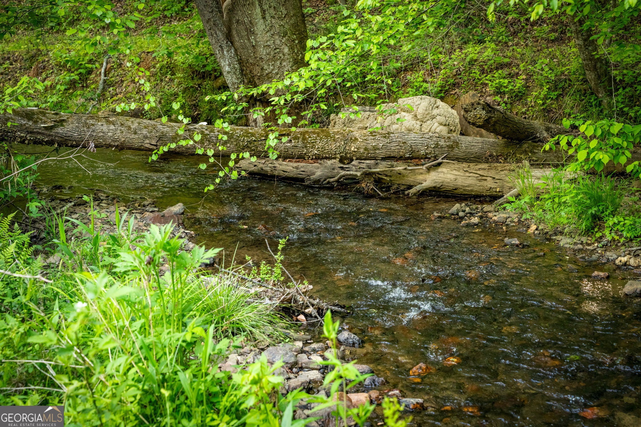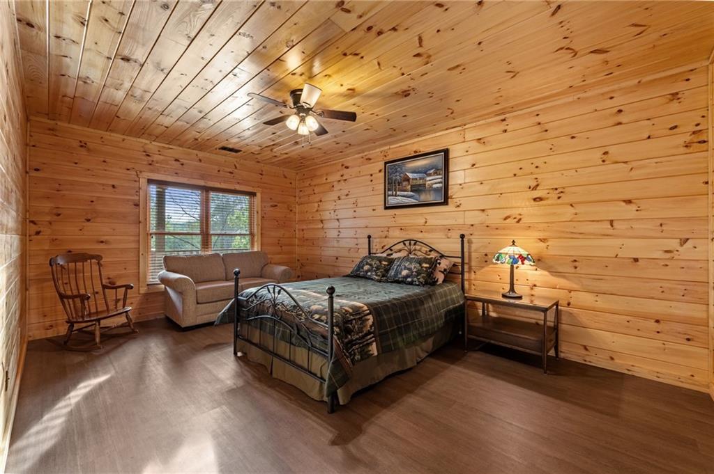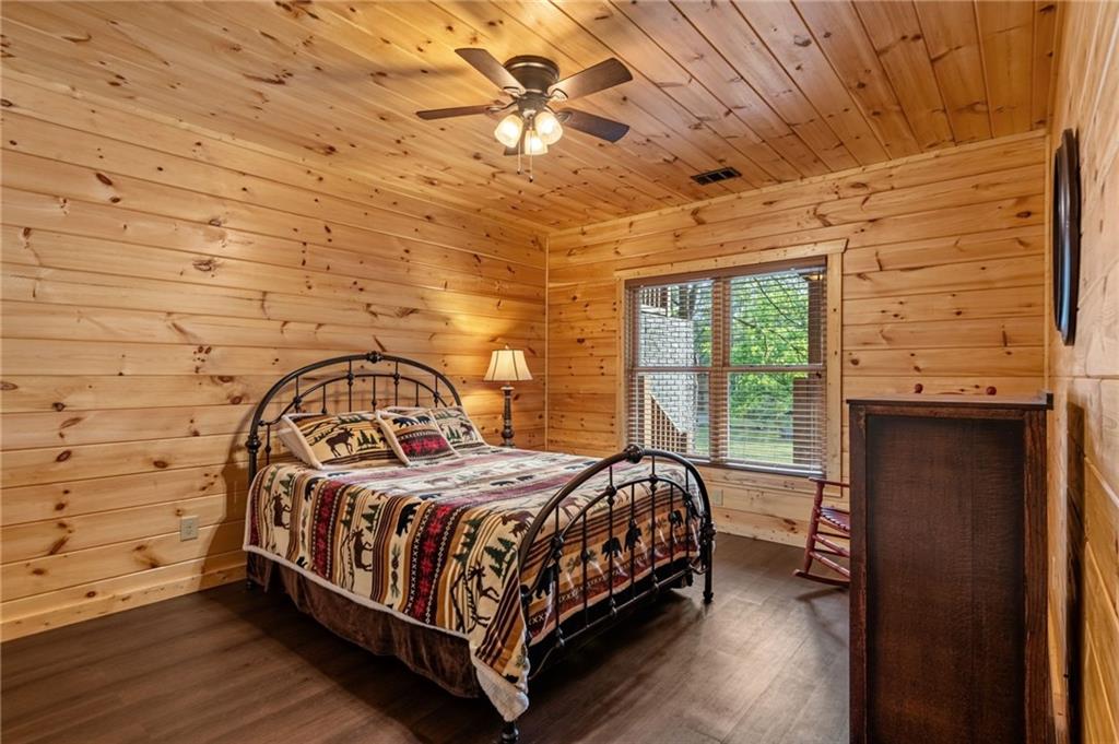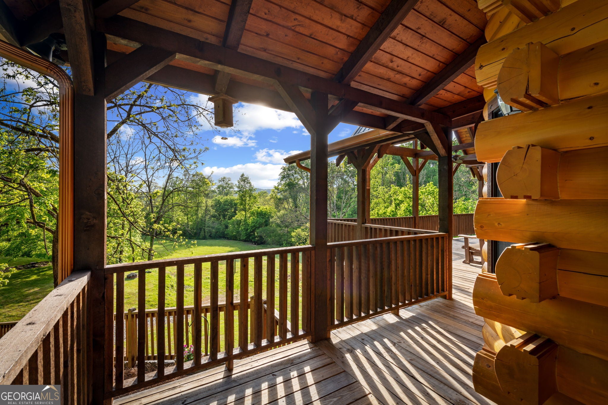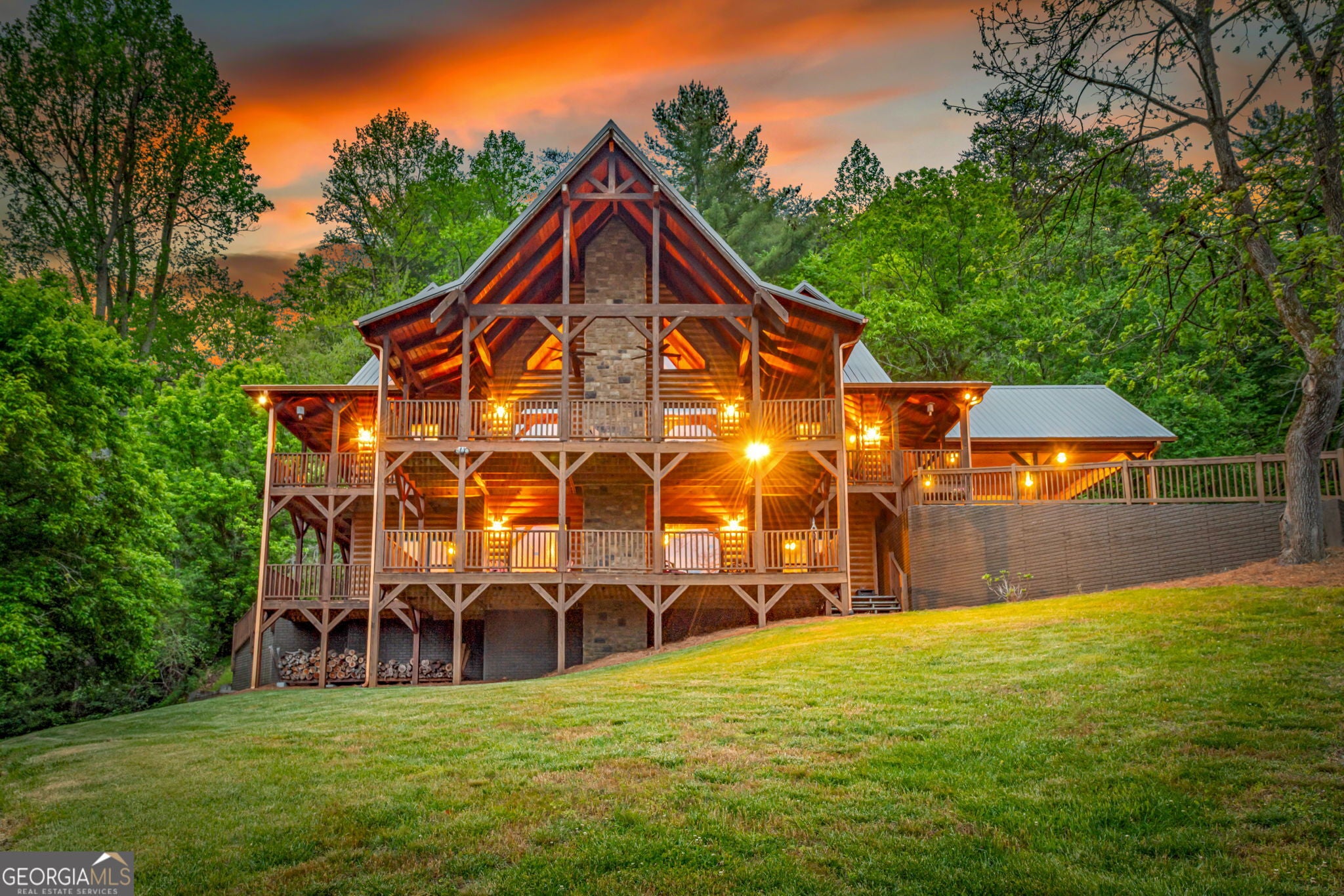 RARE opportunity to own a truly one-of-a-kind Ellijay retreat76.68 acres within the city limits, yet completely private, peaceful, and off-grid, all just a short walk to Downtown! This exceptional Satterwhite Log Home offers 5BR/4.5BA across three levels of living, with Ellijay River frontage, a beautiful year-round flowing creek, multiple springs, and a perfect blend of open pasture and wooded terrain. Private off-road trails wind throughout the propertyideal for UTV and Jeep adventures. Inside, youll find a warm all-wood interior with a welcoming foyer, soaring cathedral ceilings with exposed beams, and a wood-burning fireplace anchoring the great room. The well-appointed kitchen features granite countertops, stainless appliances, gas range, tumbled marble backsplash, pantry, and a mudroom/laundry combo, along with sought-after Blue Buggy wood accents that add character throughout. The main-level primary suite is generously sized, while the upper level offers two private ensuites and a spacious loft overlooking the creek and pasture. The finished terrace level is designed for entertaining or guests, featuring a large family room with gas log fireplace, wet bar, two additional bedrooms, full bath, and ample storage. Enjoy outdoor living on the full wraparound porch and lower-level covered deck, plus a 2-car carport/portico, outbuilding for storage, and fenced dog area. Built with true quality, this home also offers underground power, fiber internet, private well, buried propane tank, and two HVAC units. With no HOA and endless room to explorewhether riding, gardening, or relaxing by the waterthis is the perfect blend of privacy, acreage, and in-town convenience a legacy property families hold for generations!