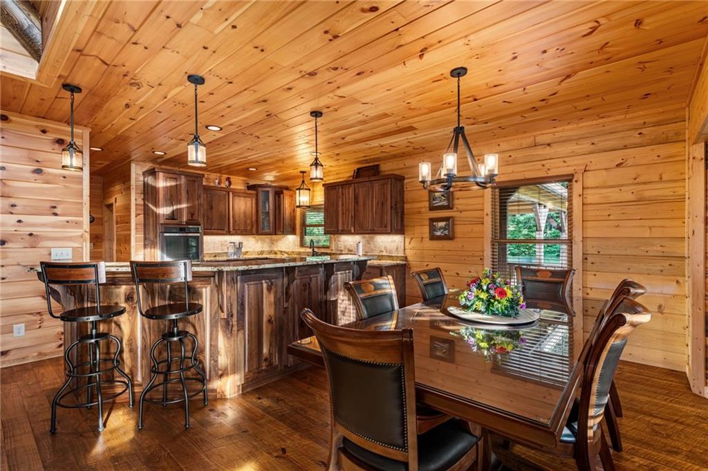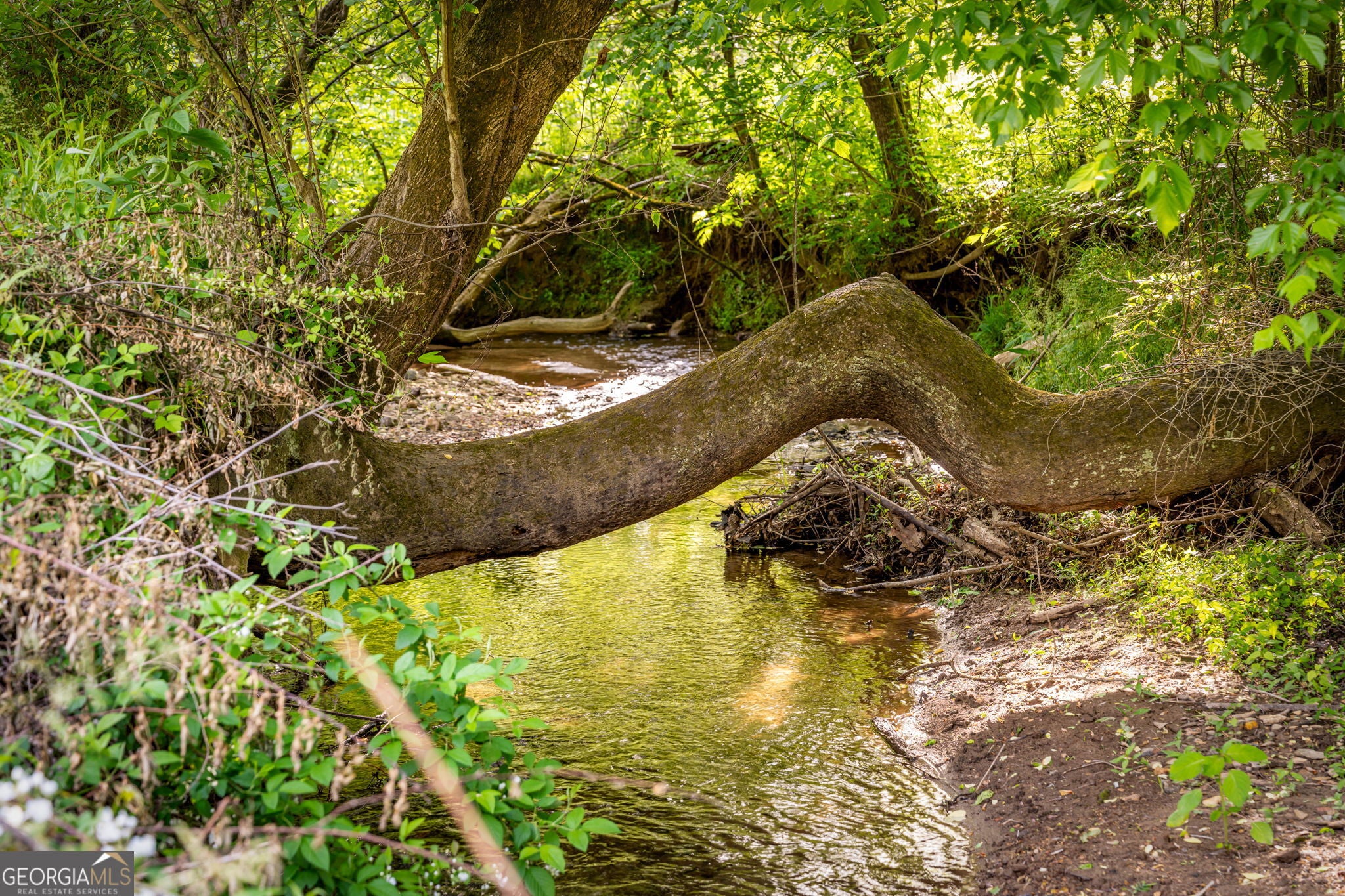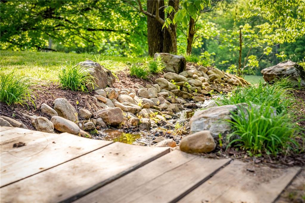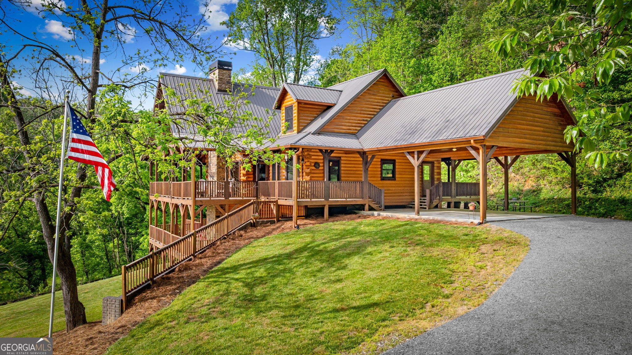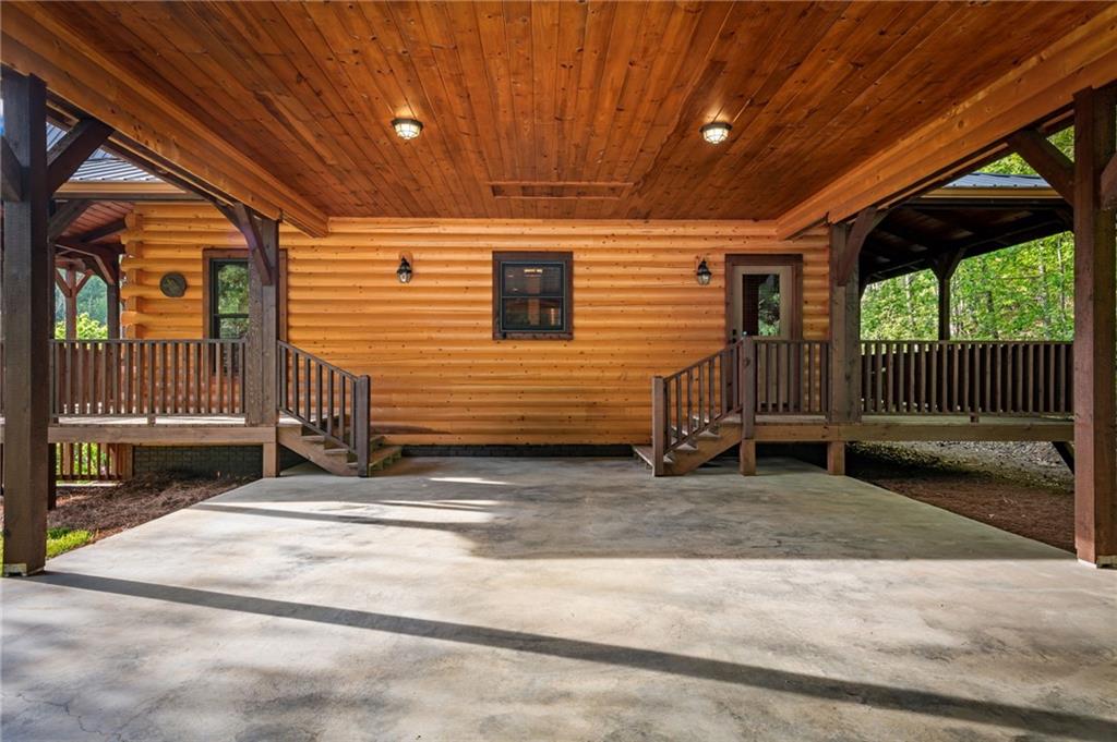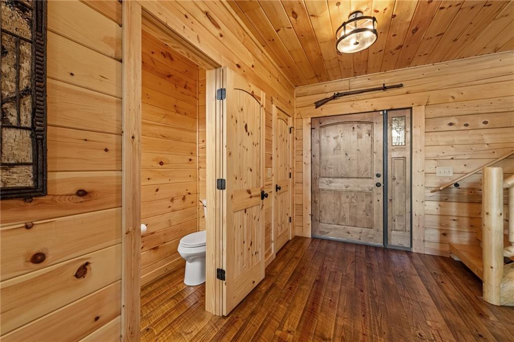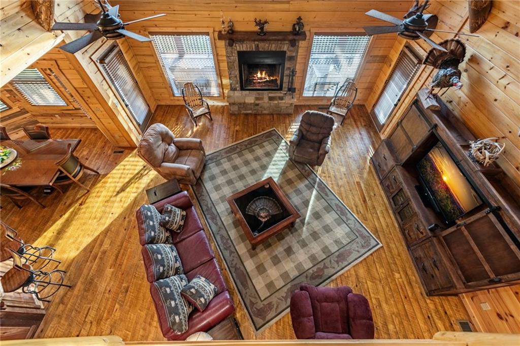 RARE opportunity to own a truly one-of-a-kind Ellijay retreat76.68 acres within the city limits, yet completely private, peaceful, and off-grid, all just a short walk to Downtown! This exceptional Satterwhite Log Home offers 5BR/4.5BA across three levels of living, with Ellijay River frontage, a beautiful year-round flowing creek, multiple springs, and a perfect blend of open pasture and wooded terrain. Private off-road trails wind throughout the propertyideal for UTV and Jeep adventures. Inside, youll find a warm all-wood interior with a welcoming foyer, soaring cathedral ceilings with exposed beams, and a wood-burning fireplace anchoring the great room. The well-appointed kitchen features granite countertops, stainless appliances, gas range, tumbled marble backsplash, pantry, and a mudroom/laundry combo, along with sought-after Blue Buggy wood accents that add character throughout. The main-level primary suite is generously sized, while the upper level offers two private ensuites and a spacious loft overlooking the creek and pasture. The finished terrace level is designed for entertaining or guests, featuring a large family room with gas log fireplace, wet bar, two additional bedrooms, full bath, and ample storage. Enjoy outdoor living on the full wraparound porch and lower-level covered deck, plus a 2-car carport/portico, outbuilding for storage, and fenced dog area. Built with true quality, this home also offers underground power, fiber internet, private well, buried propane tank, and two HVAC units. With no HOA and endless room to explorewhether riding, gardening, or relaxing by the waterthis is the perfect blend of privacy, acreage, and in-town convenience a legacy property families hold for generations!