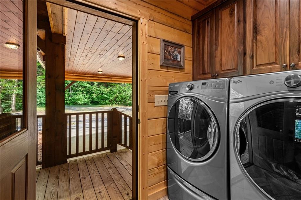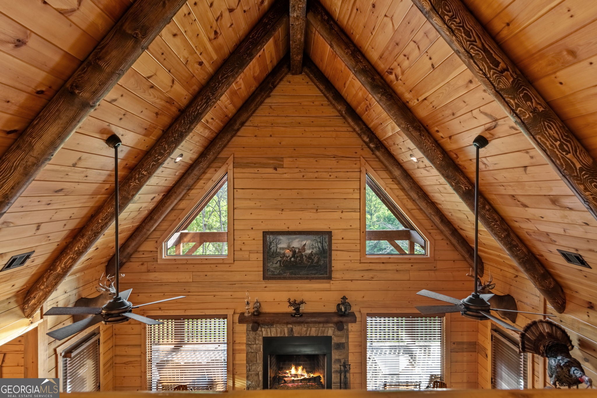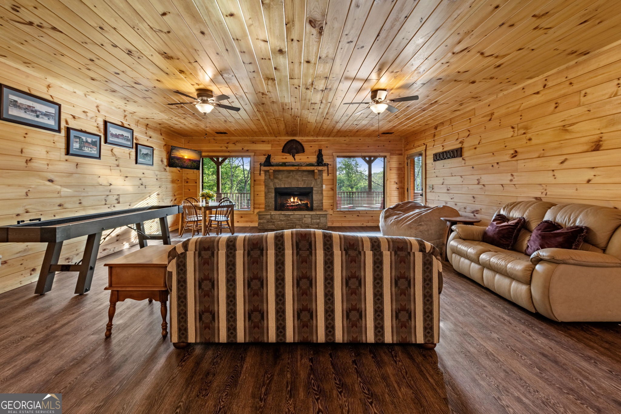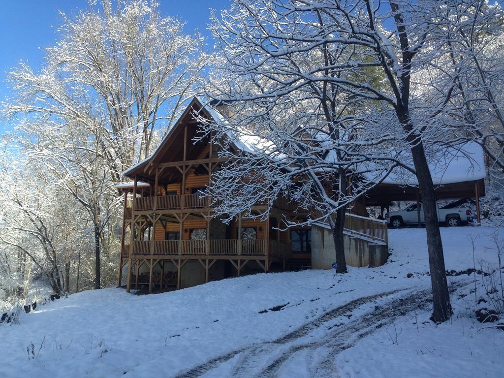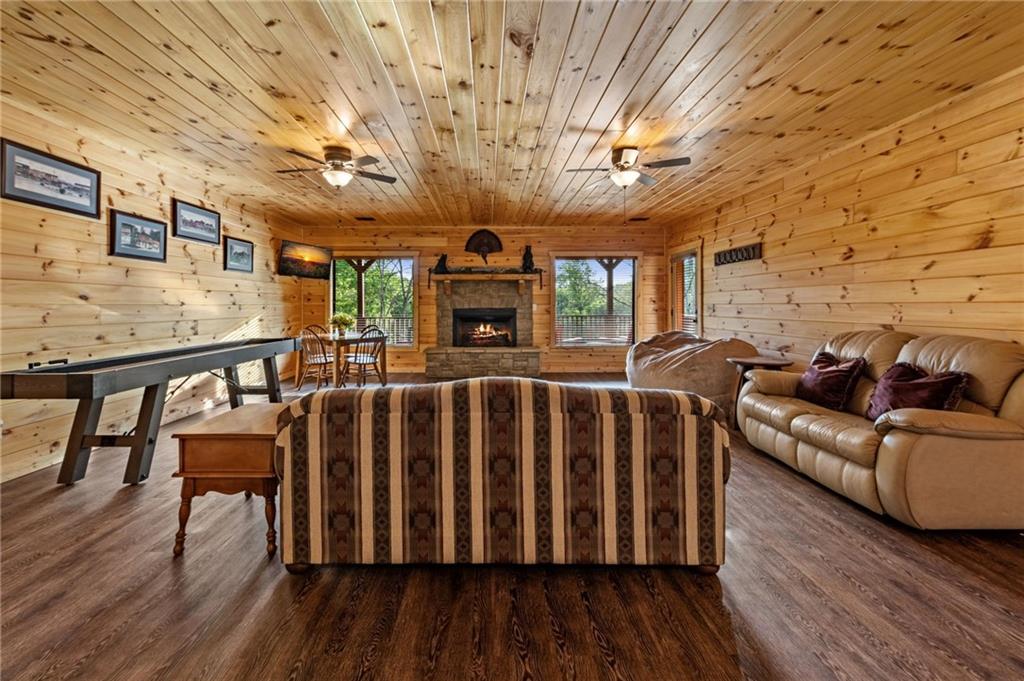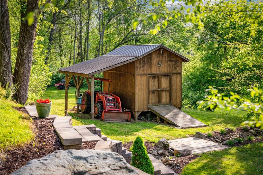 RARE opportunity to own a truly one-of-a-kind Ellijay retreat76.68 acres within the city limits, yet completely private, peaceful, and off-grid, all just a short walk to Downtown! This exceptional Satterwhite Log Home offers 5BR/4.5BA across three levels of living, with Ellijay River frontage, a beautiful year-round flowing creek, multiple springs, and a perfect blend of open pasture and wooded terrain. Private off-road trails wind throughout the propertyideal for UTV and Jeep adventures. Inside, youll find a warm all-wood interior with a welcoming foyer, soaring cathedral ceilings with exposed beams, and a wood-burning fireplace anchoring the great room. The well-appointed kitchen features granite countertops, stainless appliances, gas range, tumbled marble backsplash, pantry, and a mudroom/laundry combo, along with sought-after Blue Buggy wood accents that add character throughout. The main-level primary suite is generously sized, while the upper level offers two private ensuites and a spacious loft overlooking the creek and pasture. The finished terrace level is designed for entertaining or guests, featuring a large family room with gas log fireplace, wet bar, two additional bedrooms, full bath, and ample storage. Enjoy outdoor living on the full wraparound porch and lower-level covered deck, plus a 2-car carport/portico, outbuilding for storage, and fenced dog area. Built with true quality, this home also offers underground power, fiber internet, private well, buried propane tank, and two HVAC units. With no HOA and endless room to explorewhether riding, gardening, or relaxing by the waterthis is the perfect blend of privacy, acreage, and in-town convenience a legacy property families hold for generations!