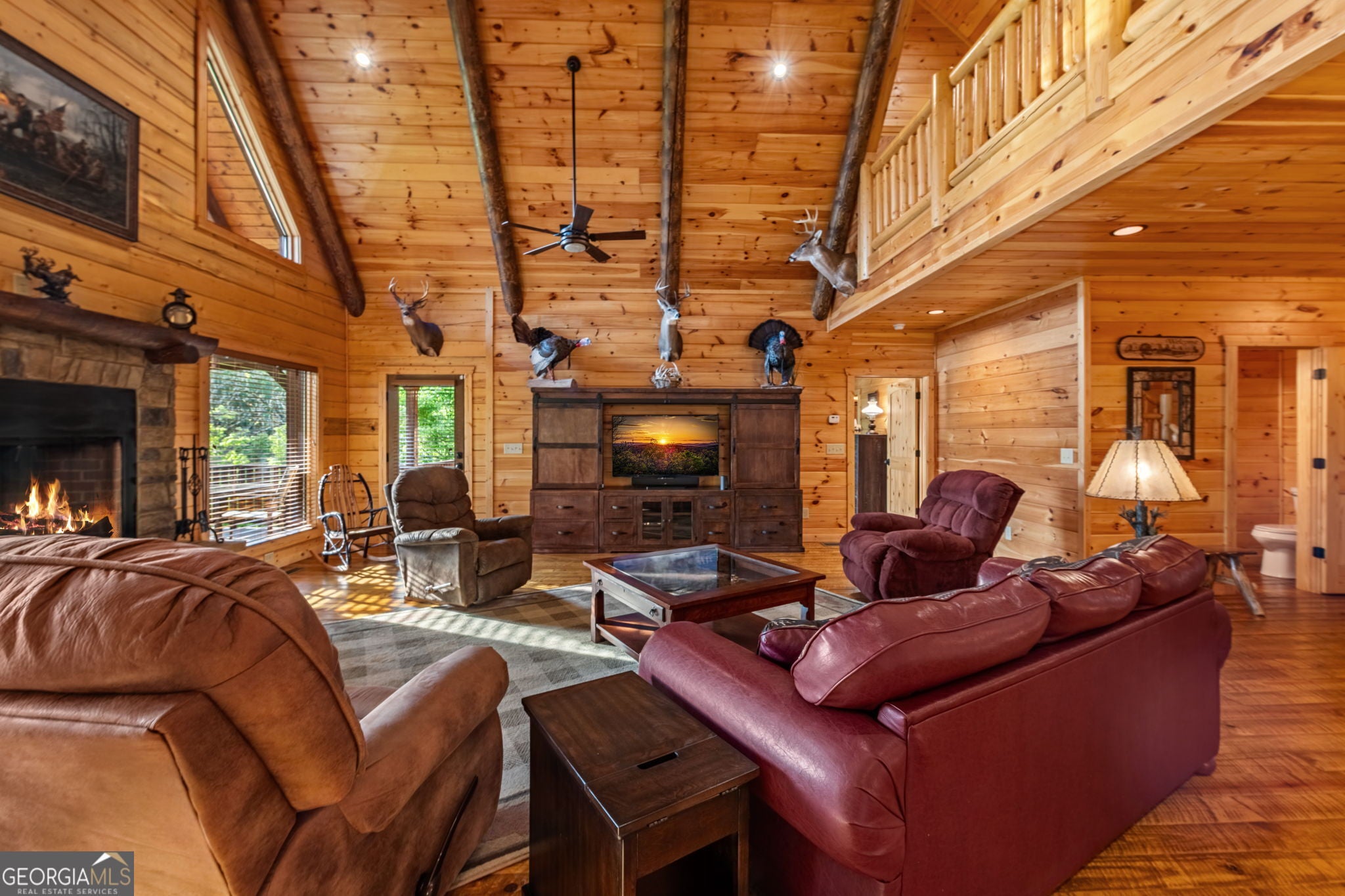 RARE opportunity to own a truly one-of-a-kind Ellijay retreat-76.68 acres within the city limits, yet completely private, peaceful, and off-grid, all just a short walk to Downtown! This exceptional Satterwhite Log Home offers 5BR/4.5BA across three levels of living, with Ellijay River frontage, a beautiful year-round flowing creek, multiple springs, and a perfect blend of open pasture and wooded terrain. Private off-road trails wind throughout the property-ideal for UTV and Jeep adventures. Inside, youll find a warm all-wood interior with a welcoming foyer, soaring cathedral ceilings with exposed beams, and a wood-burning fireplace anchoring the great room. The well-appointed kitchen features granite countertops, stainless appliances, gas range, tumbled marble backsplash, pantry, and a mudroom/laundry combo, along with sought-after Blue Buggy wood accents that add character throughout. The main-level primary suite is generously sized, while the upper level offers two private ensuites and a spacious loft overlooking the creek and pasture. The finished terrace level is designed for entertaining or guests, featuring a large family room with gas log fireplace, wet bar, two additional bedrooms, full bath, and ample storage. Enjoy outdoor living on the full wraparound porch and lower-level covered deck, plus a 2-car carport/portico, outbuilding for storage, and fenced dog area. Built with true quality, this home also offers underground power, fiber internet, private well, buried propane tank, and two HVAC units. With no HOA and endless room to explore-whether riding, gardening, or relaxing by the water-this is the perfect blend of privacy, acreage, and in-town convenience... a legacy property families hold for generations!