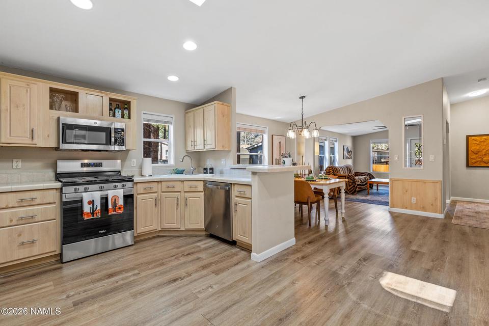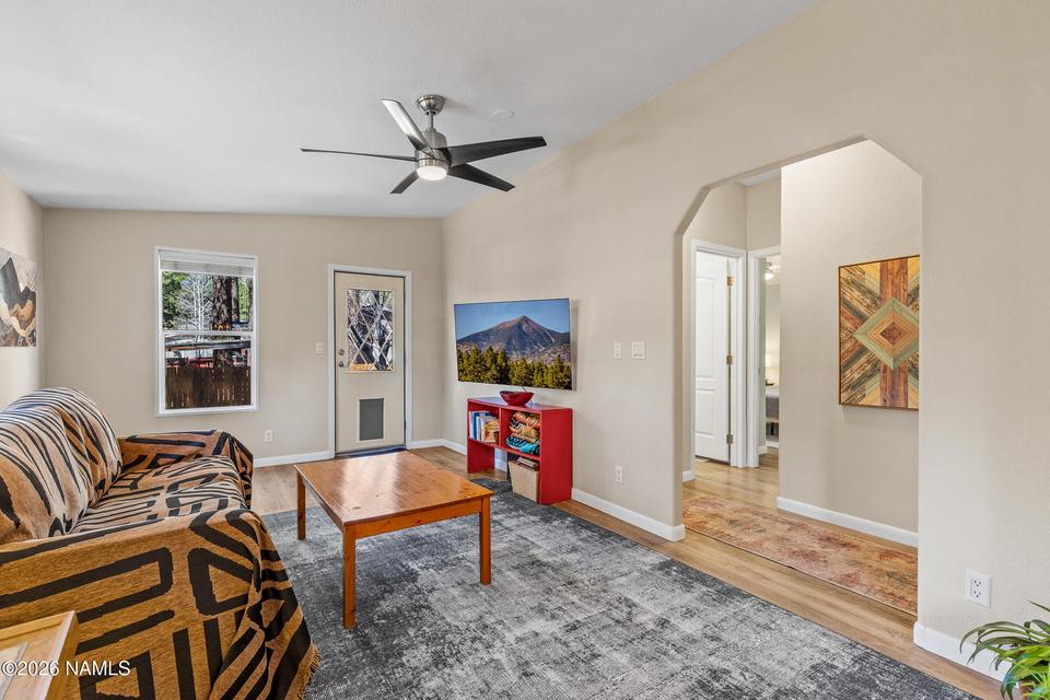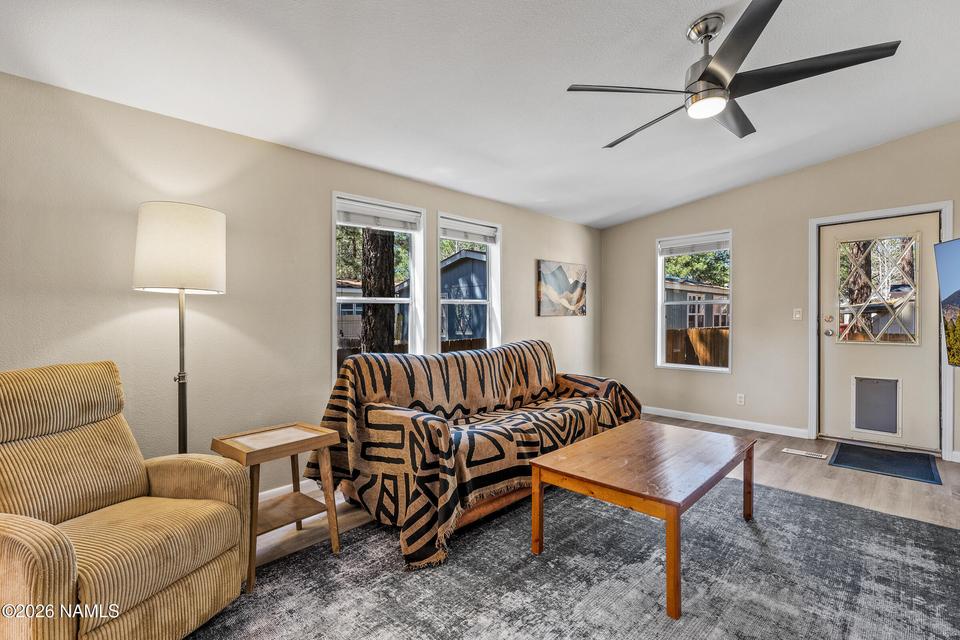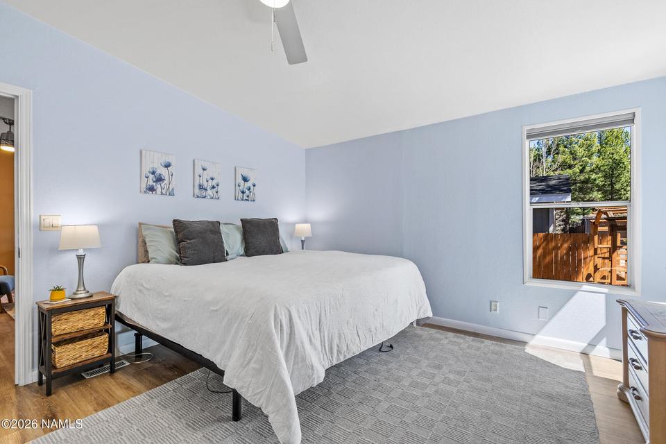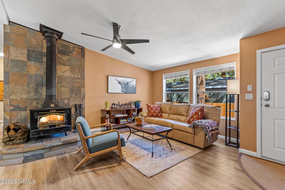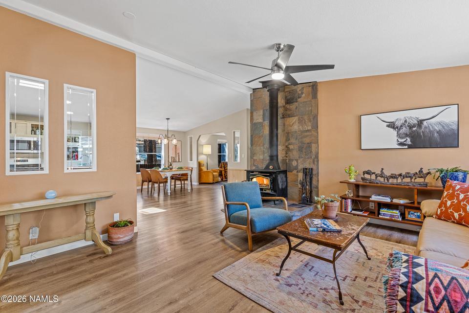 This meticulously maintained 3-bedroom, 2-bath split floor plan home in Railroad Springs offers both comfort and style. Upon entry, youre welcomed into a bright living room with vaulted ceilings, updated luxury vinyl flooring, and a cozy wood-burning stove, perfect for relaxing winter evenings. The oversized kitchen has been recently updated with new stainless steel appliances and flows seamlessly into a family room, creating an ideal space for entertaining. The primary suite features vaulted ceilings, dual closet, an oversized bathroom, and abundant natural light from multiple windows. On the opposite side of the home, youll find two guest bedrooms and a recently updated bathroom with a new tub/shower and toilet. Enjoy Flagstaffs beautiful summer days in the enclosed backyard, surrounded by towering ponderosa pines. Additional updates include new ceiling fans throughout, an updated furnace and A/C, new water heater, garage door opener, and fresh interior and exterior paint.Located just minutes from Flagstaffs top dining, shopping, and NAU, and within walking distance to a community park with a large grassy field, this home is perfect as a primary residence, investment property, or seasonal retreat. Dont let this incredible opportunity pass you by