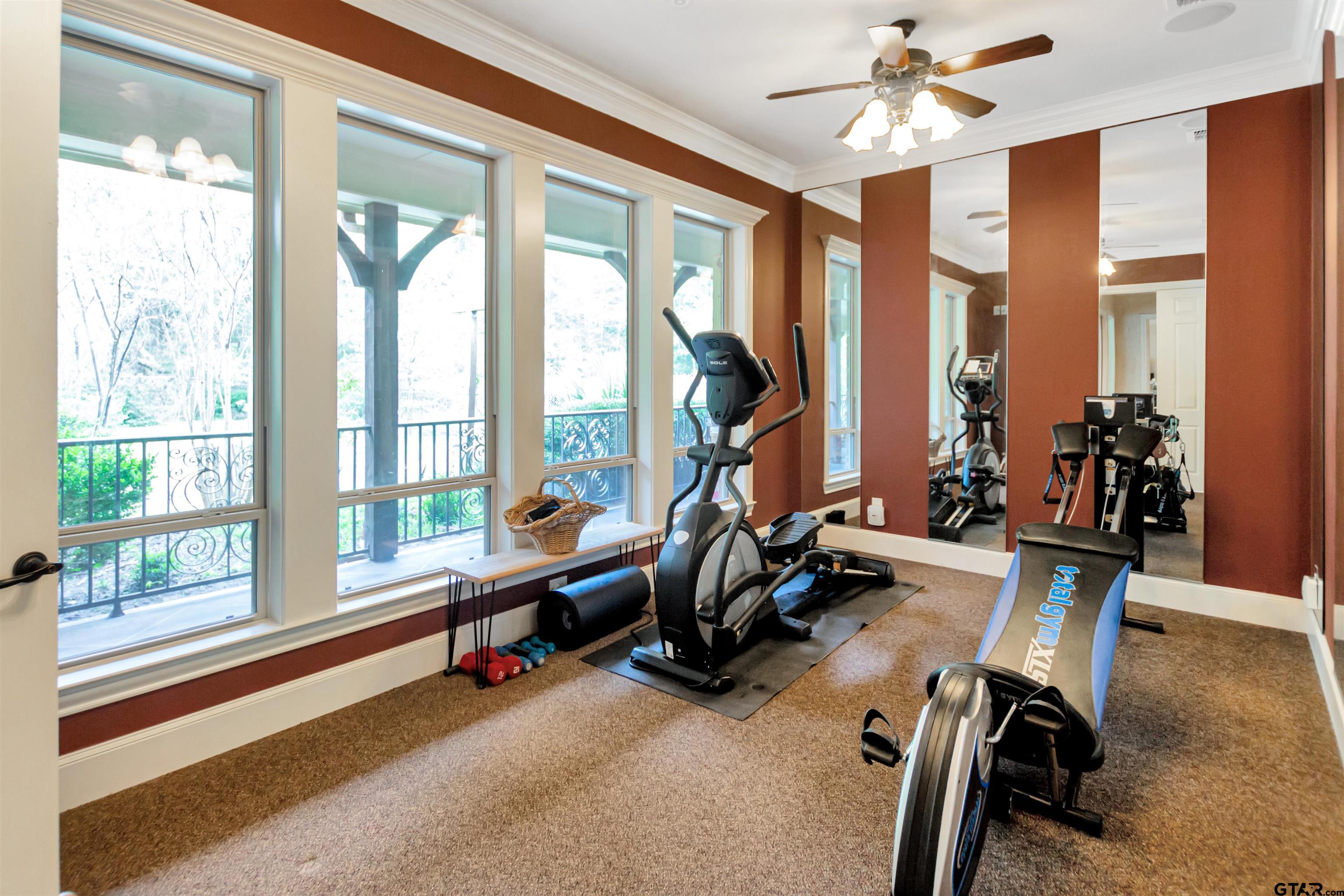 Welcome to an absolutely one-of-a-kind estate in Flint offering 4 bedrooms, 5.5 bathrooms, and a 3-car garage across 6,247 square feet, all set on expansive acreage. Tucked away in a private, serene setting, this home offers unmatched character while still being minutes from Tyler and Bullard. This home comes with a brand new composite roof and energy-efficient features including geothermal HVAC, 33kW paid solar panels, and propane backup systems. Inside, a grand entry welcomes you with a stunning fireplace and intricate details throughout. The spacious kitchen features beautiful countertops, custom cabinetry, and opens to the main living area with another fireplace and backyard views. Additional features include central vacuum, wired audio, intercom, LED cove lighting, and video security. A flexible office space and entertainment room with wet bar offer versatility, along with a dedicated gym and library. The primary suite is a true retreat with direct sunroom access, while the ensuite bath offers ample space to unwind. The sunroom includes an outdoor kitchen and furnace for year-round use. Bedrooms and bathrooms are generously sized, including a private suite with its own kitchen and exterior accessideal for guests or multigenerational living. The home includes two wood/gas fireplaces and one gas-only. Outside, enjoy agriculturally exempt acreage with chain-link and barbed wire fencing, a barn with tack room, and a private well for irrigation. A water softener and reverse osmosis system add convenience. The garage includes two EV chargers, a Tesla Gateway, and storage rooms. Additional highlights include 5G internet, tankless propane water heaters, foam insulation, zoned geothermal heating, and tile flooring throughout. This exceptional property offers space, efficiency, and privacy in a truly unique setting.