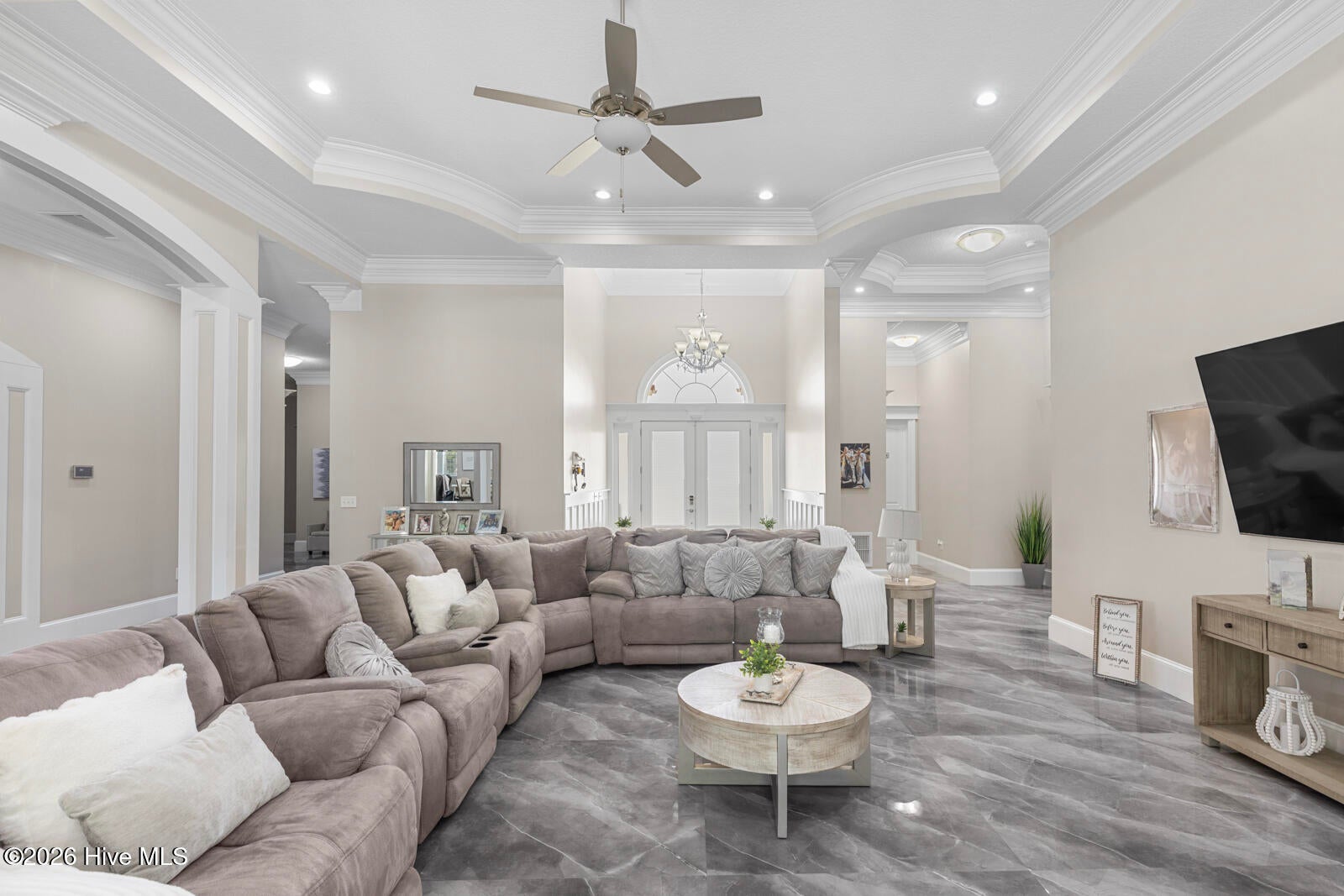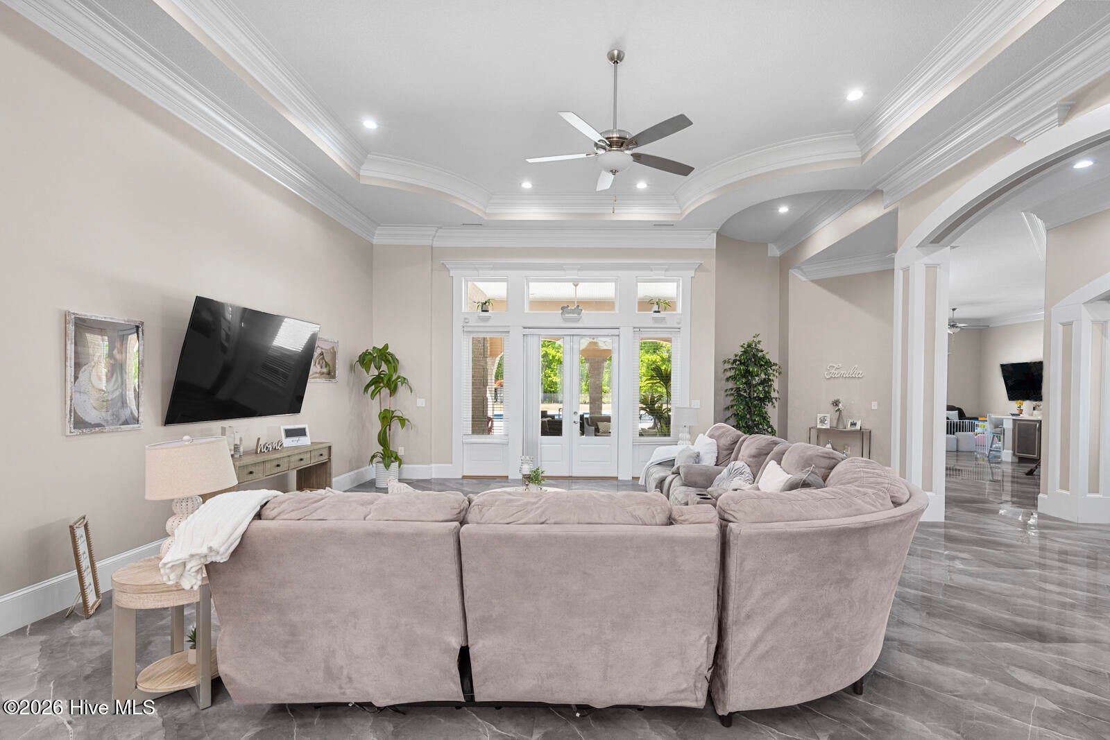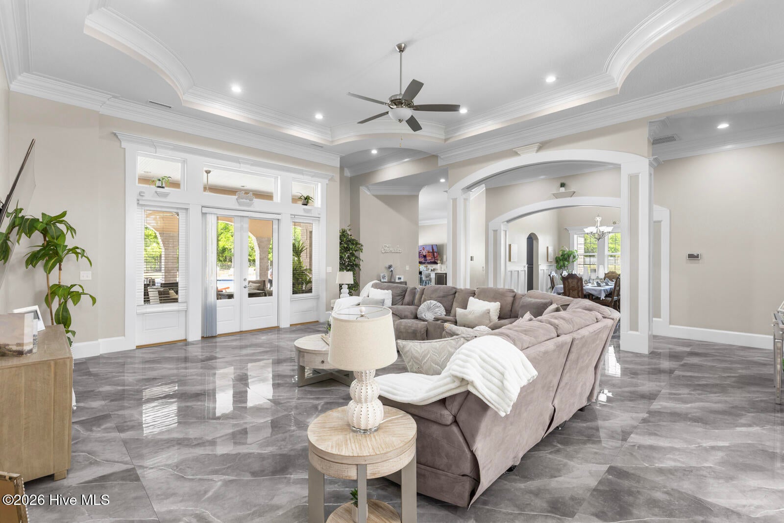Custom California Ranch-Style Estate featuring a symmetrical faade, circular paver driveway, stacked-stone accents, and meticulous landscaping. Double iron-and-glass entry doors opens to a light-filled interior framed by floor-to-ceiling windows and wood-trimmed architectural columns, leading seamlessly into the formal living and dining rooms.