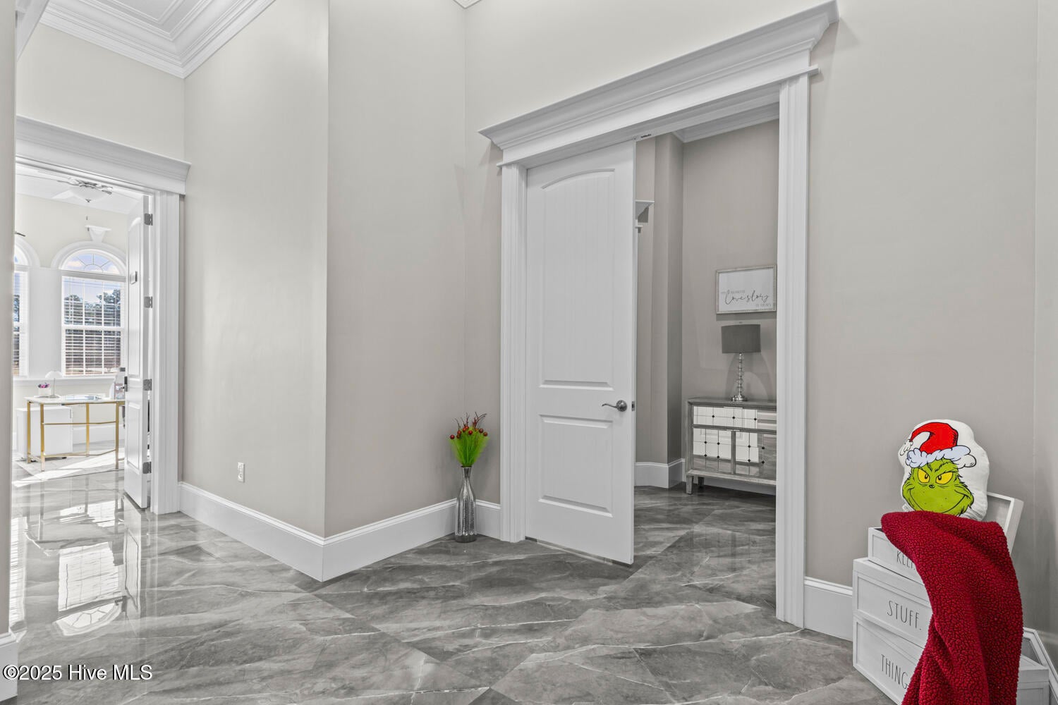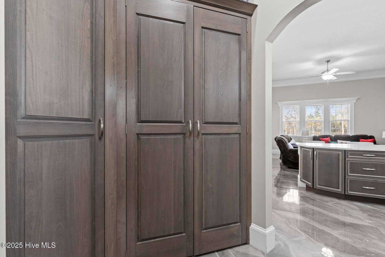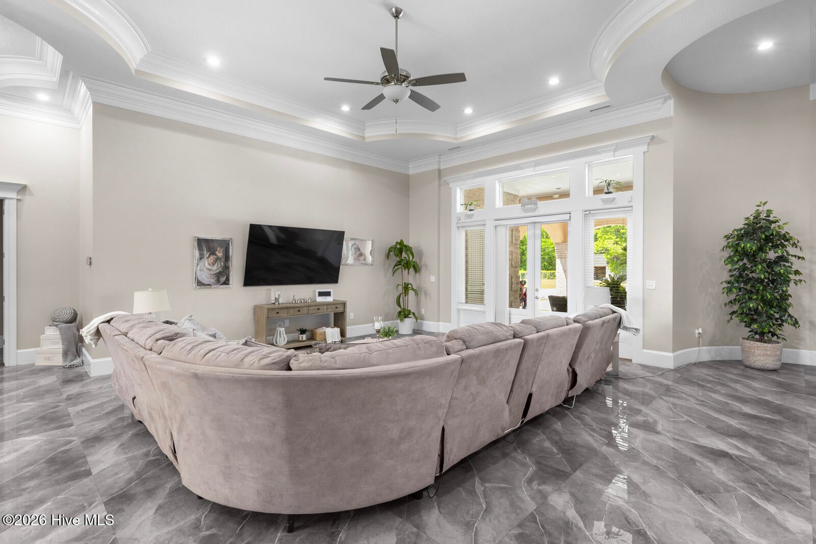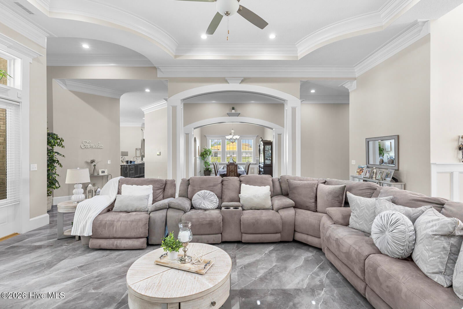 Custom California Ranch-Style Estate featuring a symmetrical faade, circular paver driveway, stacked-stone accents, and meticulous landscaping. Double iron-and-glass entry doors opens to a light-filled interior framed by floor-to-ceiling windows and wood-trimmed architectural columns, leading seamlessly into the formal living and dining rooms.