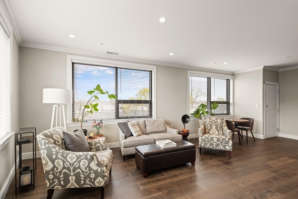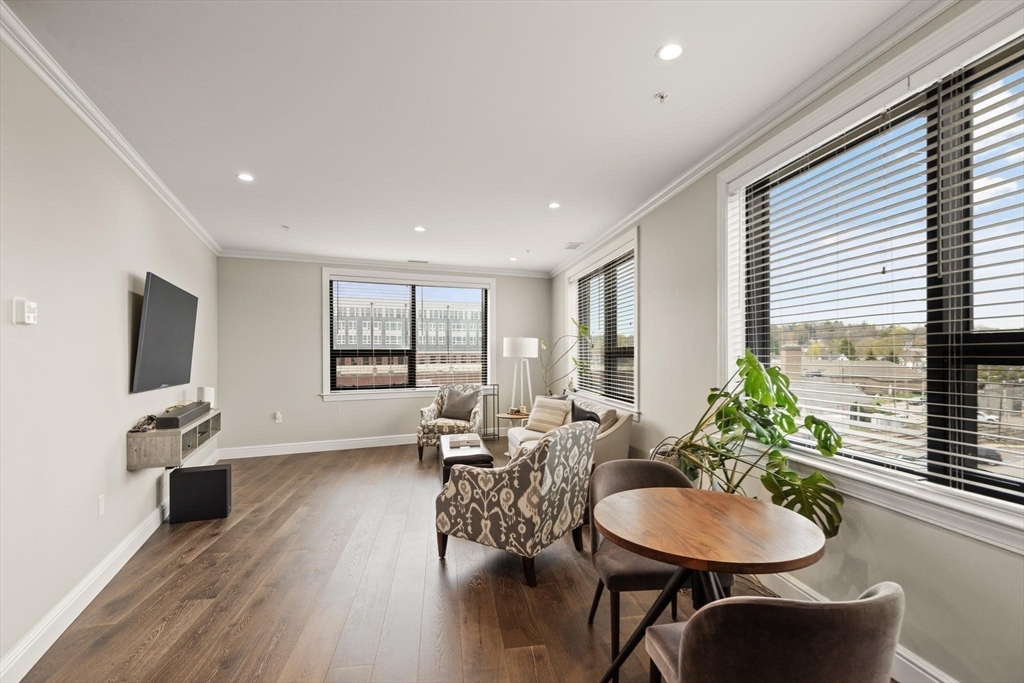 Rare opportunity to own a corner unit at Wakefield Station! Conveniently located within walking distance to shops, restaurants, Lake Quannapowitt, & the commuter rail. Built in 2018, this exceptional 2 bed 2 bath unit offers luxurious comfort and amenities you would expect from a modern condo. Upon entering, a hallway separates the entrance from the rest of the living & entertaining areas. The open-concept entertaining area is filled with natural sunlight, featuring a modern kitchen overlooking the living room. Primary bedroom features en-suite bath with double sinks and fully tiled walk-in shower. In-unit laundry, gas stove & heat, designer California Closets built-in. Crown molding, wide-plank wood flooring, and recessed lighting throughout unit. Residents enjoy a private gym, bike room, heated garage parking, ground level retail with a local favorite restaurant. Beautiful common areas include a lobby with concierge office, mail & package areas, courtyard with grill and fire pit.
