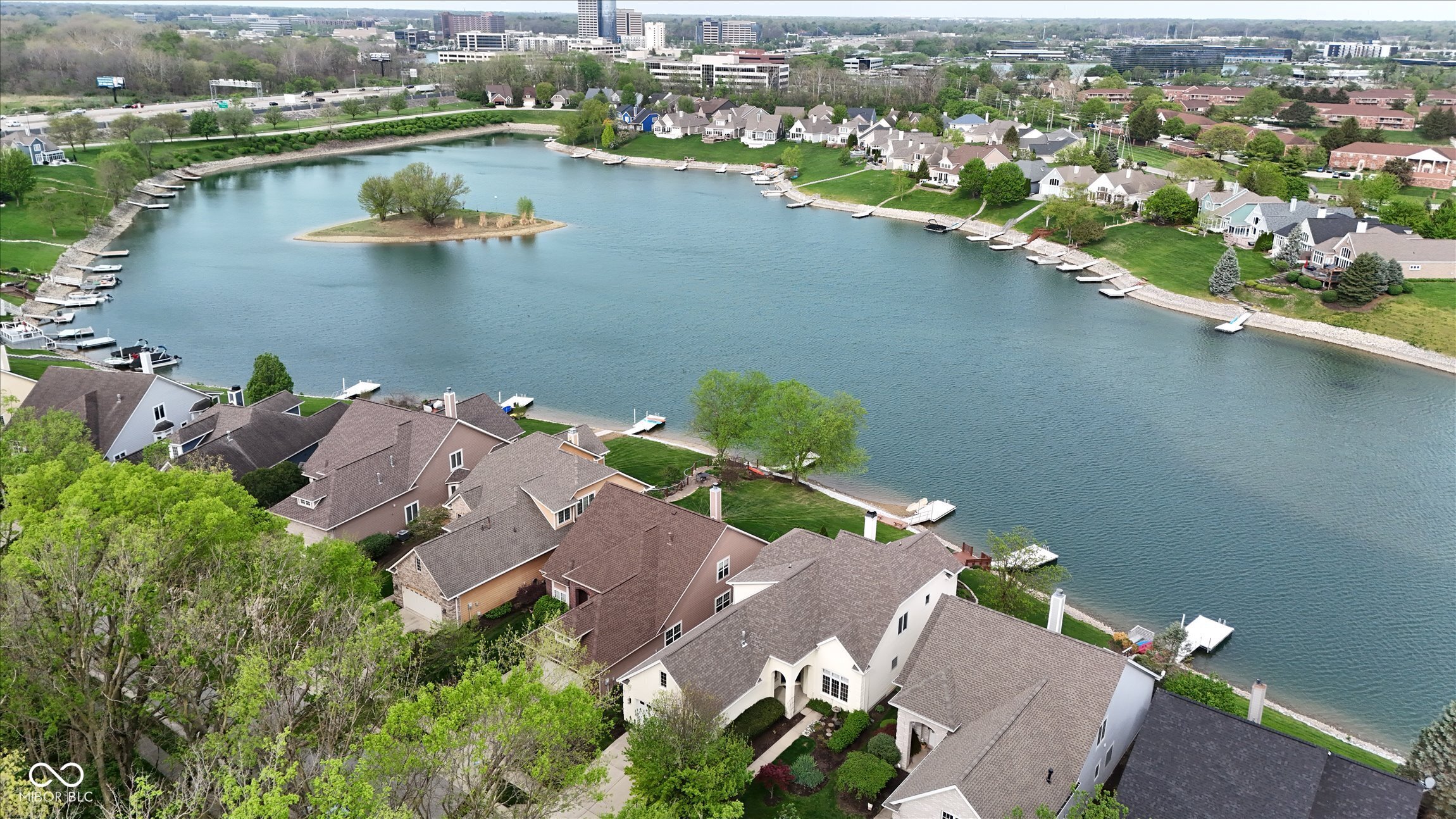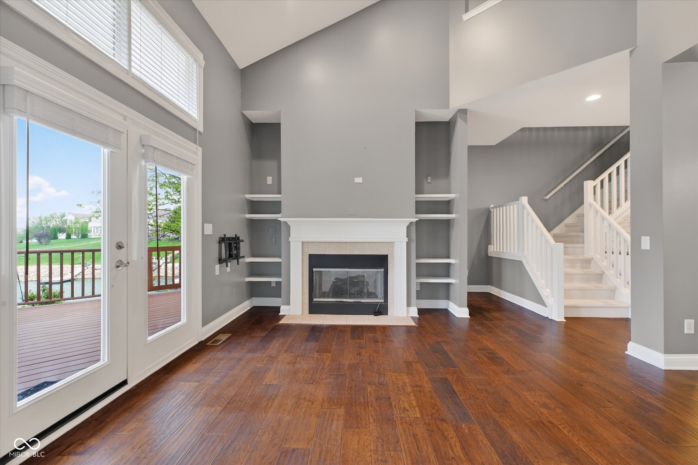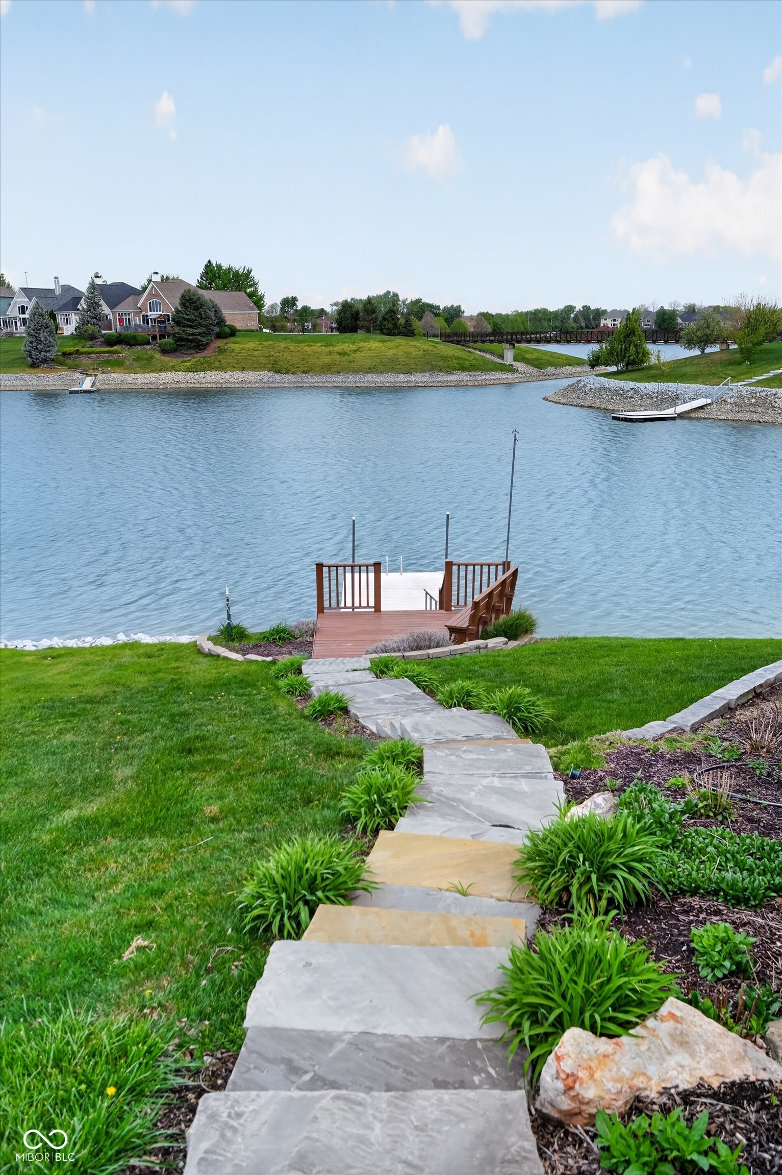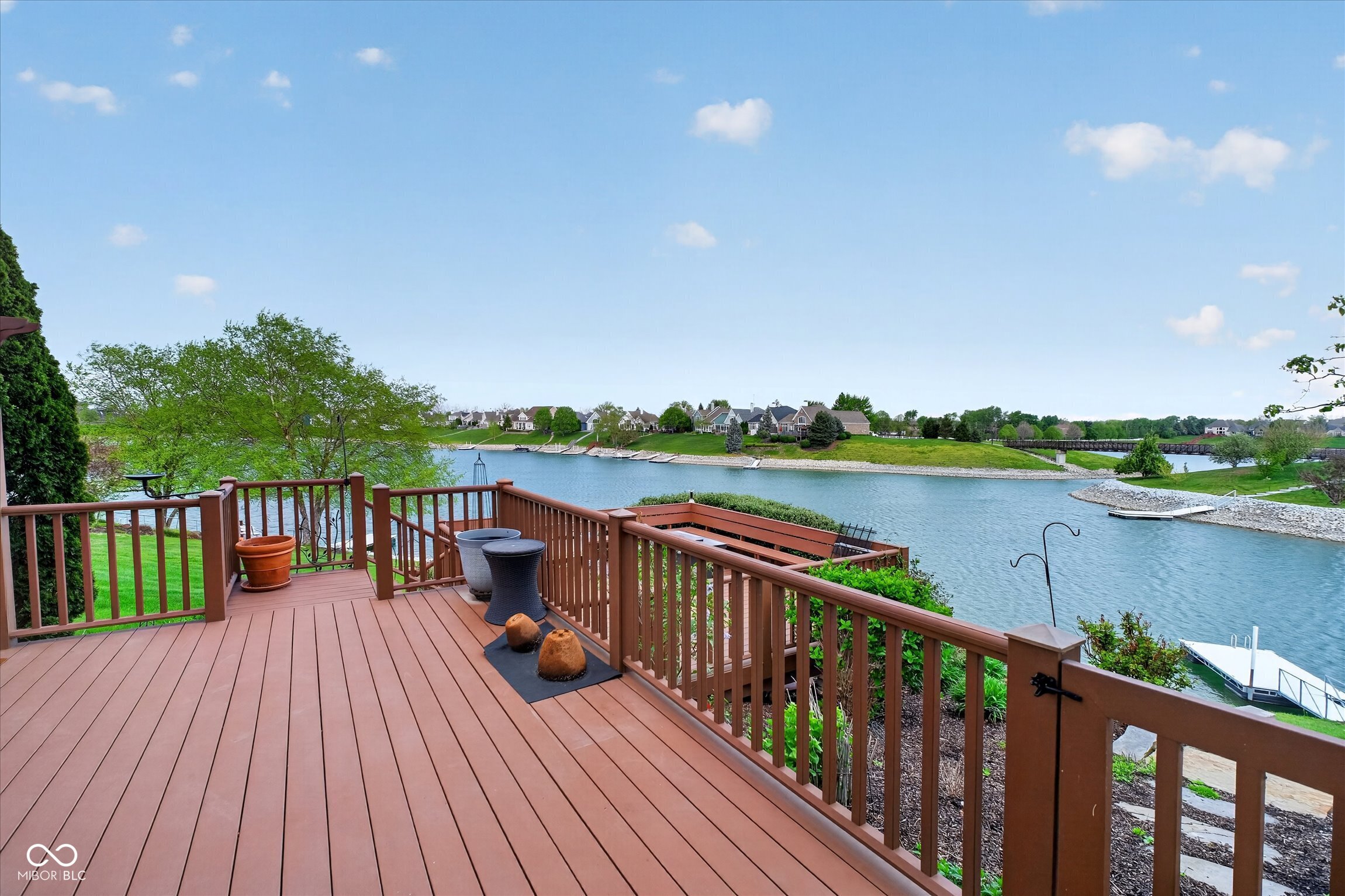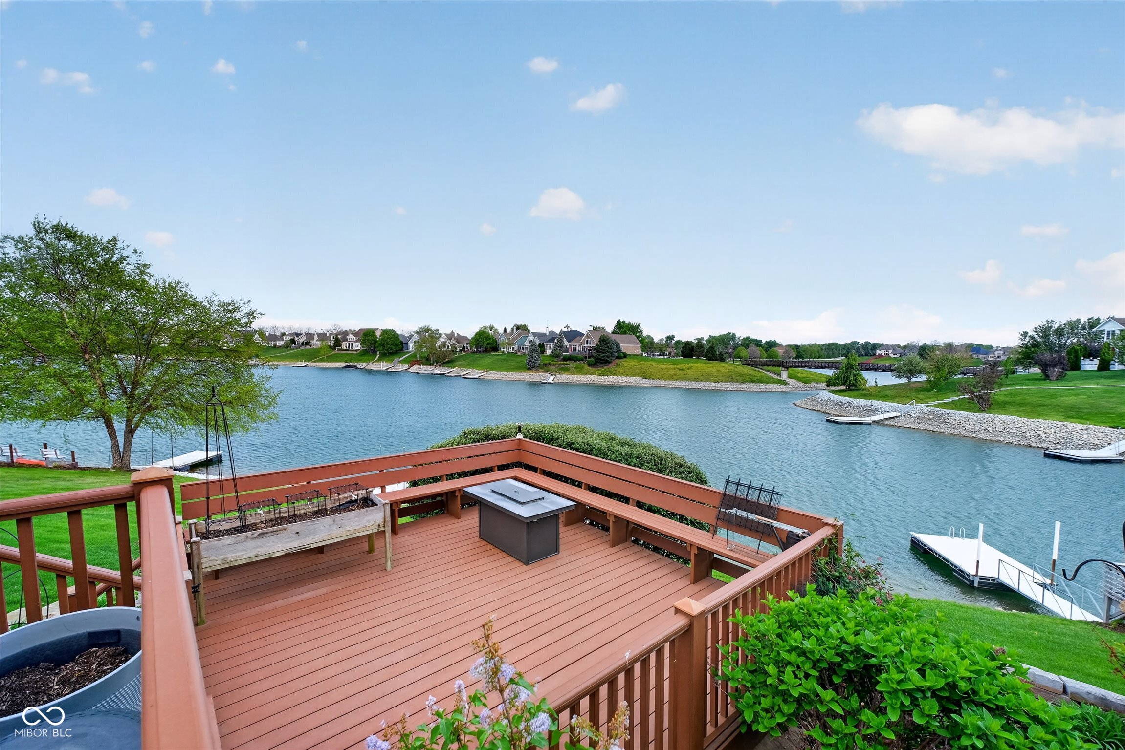 This beautifully maintained waterfront home on Crystal Lake has been thoughtfully updated and is ready to enjoy. With 3 bedrooms and 2.5 baths, it features engineered hardwood floors throughout and serene lake views that make everyday living feel special. The updated deck is ideal for relaxing or entertaining, while the well-designed landscaping includes a limestone walkway leading directly to your private dock. Inside, a dual-sided fireplace creates a warm, inviting feel in both the living room and the primary bedroom. The spacious main-level primary suite offers a true retreat. The kitchen has been nicely updated with ample counter space and cabinetry, subway tile, and a gas cooktop paired with a double electric oven. A custom built-in bar in the dining area makes hosting easy and enjoyable. Upstairs, you'll find additional living space, including a third bedroom, a large full bath, a generous loft area, and plenty of walk-in storage. The finished basement adds even more flexibility-perfect for a rec room or gym. A 2-car garage adds convenience, and the location puts you just minutes from great shopping and dining on the north side of Indianapolis.