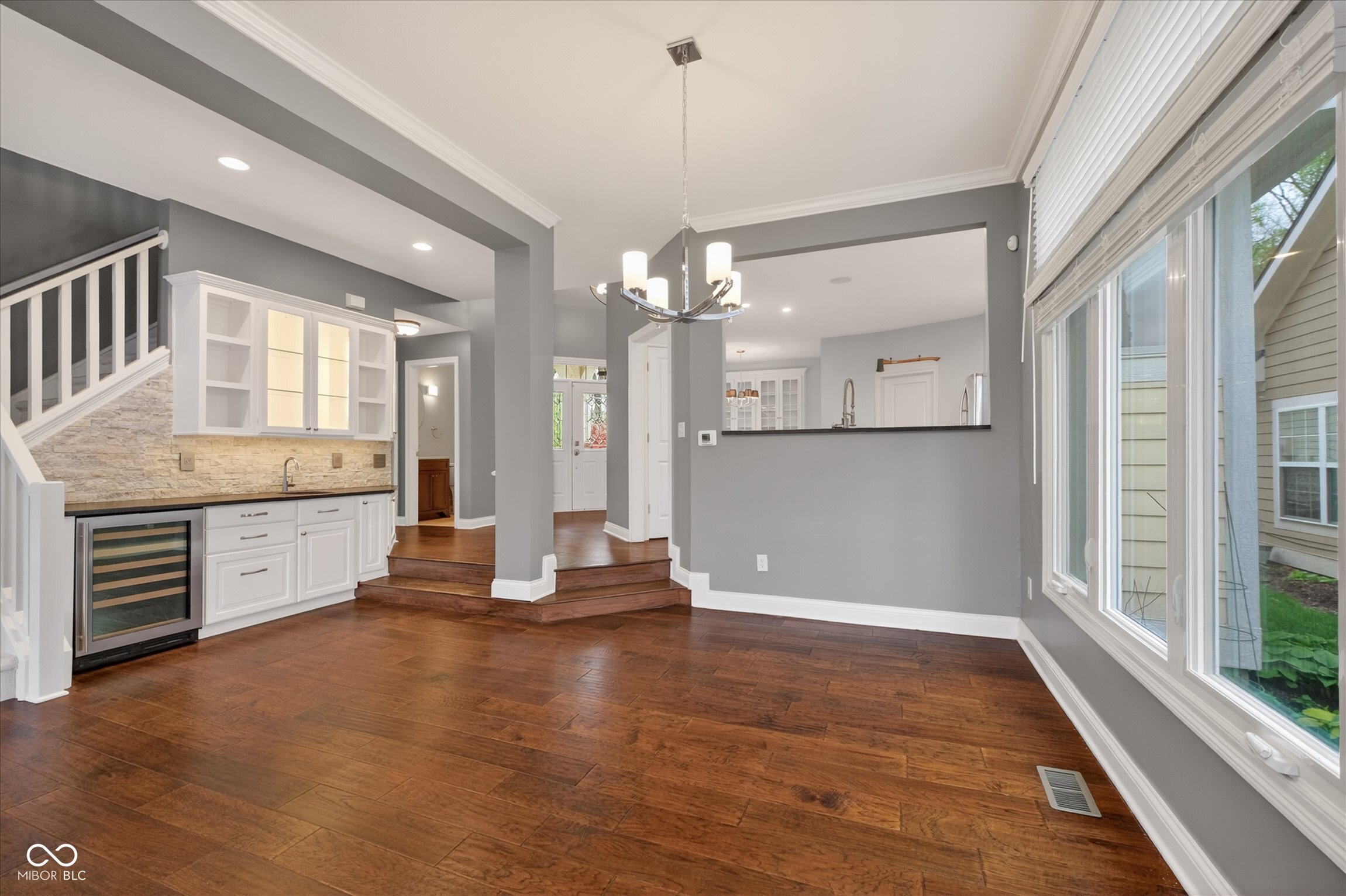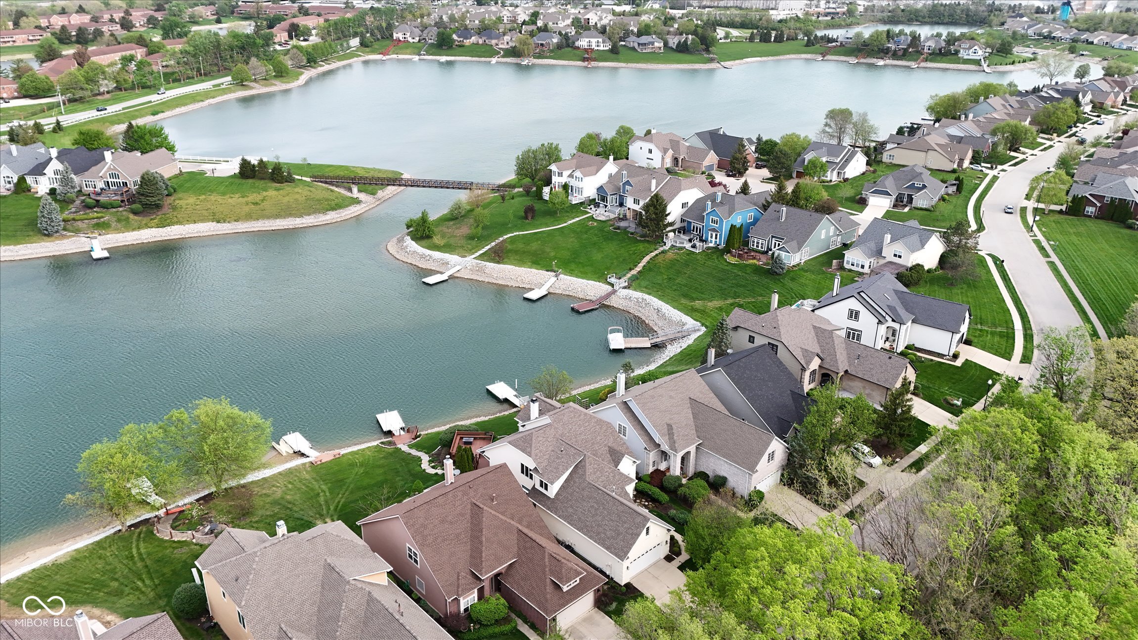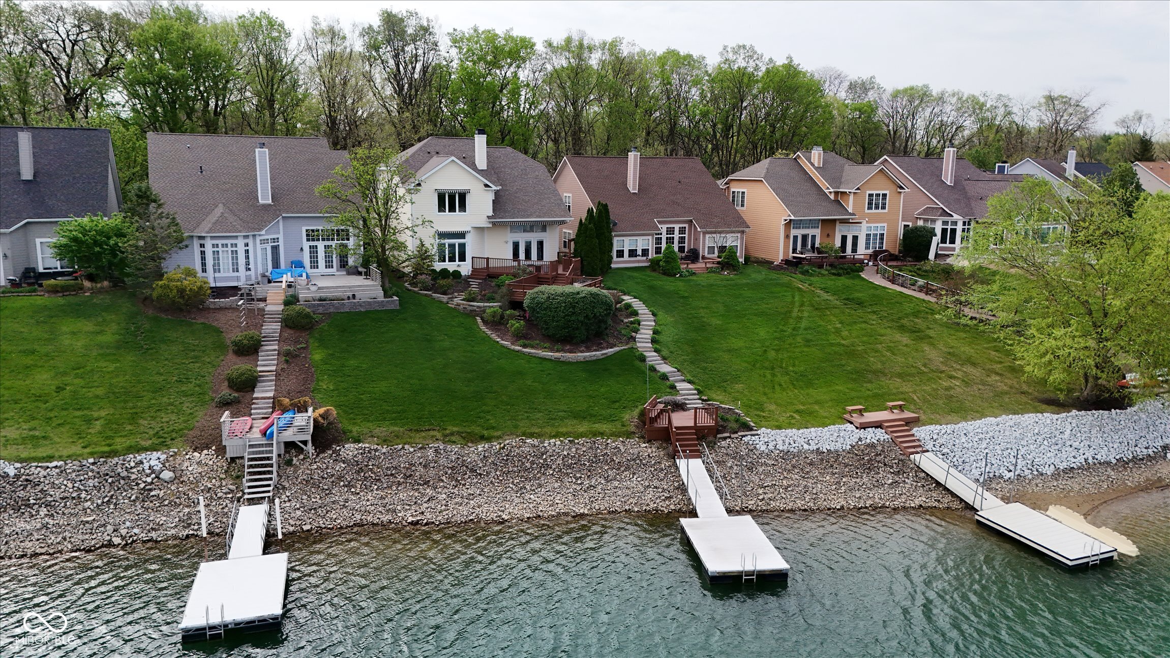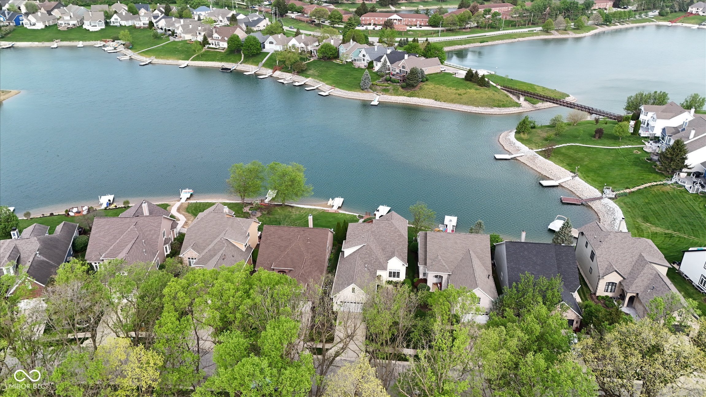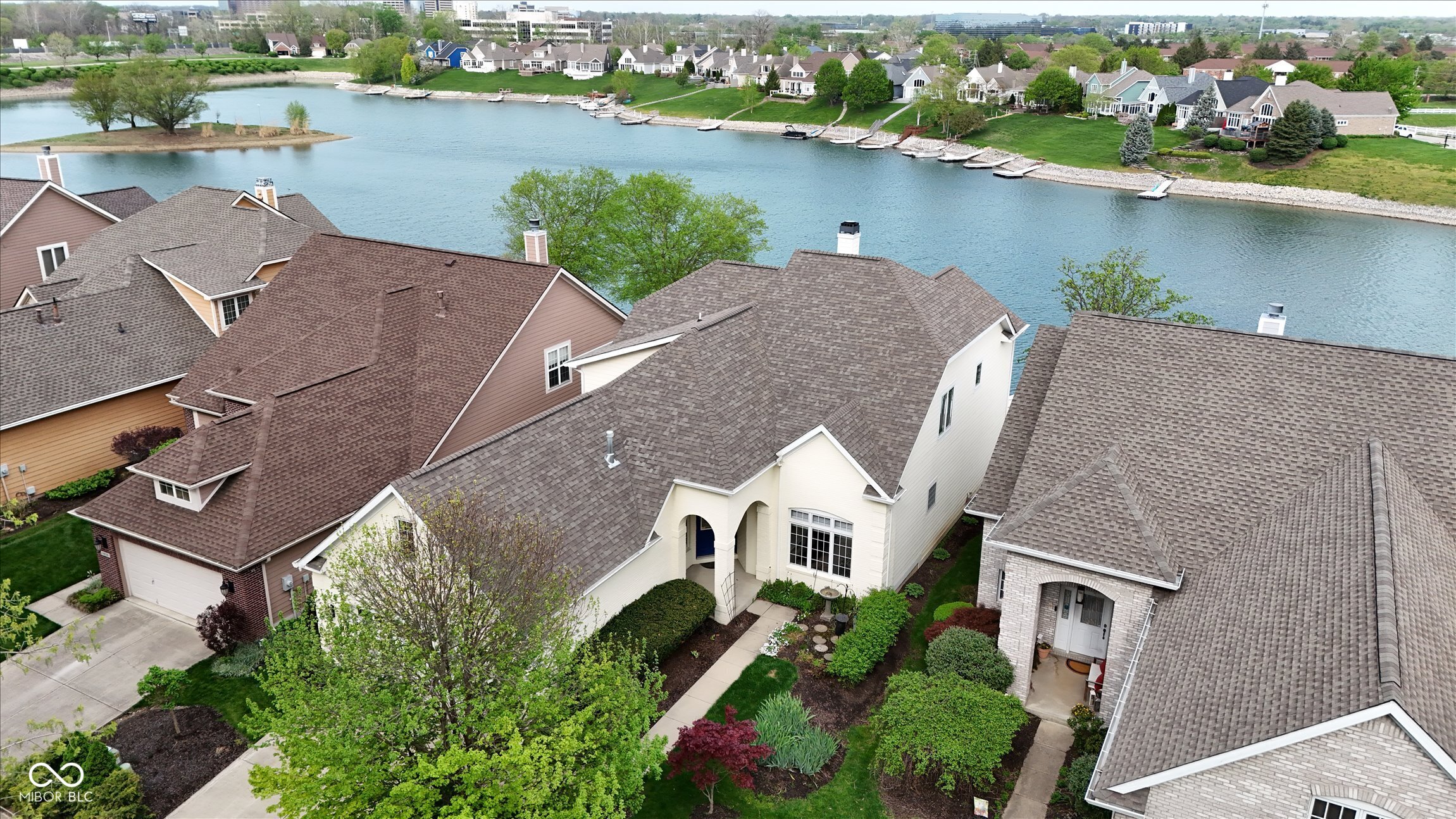 This beautifully maintained waterfront home on Crystal Lake has been thoughtfully updated and is ready to enjoy. With 3 bedrooms and 2.5 baths, it features engineered hardwood floors throughout and serene lake views that make everyday living feel special. The updated deck is ideal for relaxing or entertaining, while the well-designed landscaping includes a limestone walkway leading directly to your private dock. Inside, a dual-sided fireplace creates a warm, inviting feel in both the living room and the primary bedroom. The spacious main-level primary suite offers a true retreat. The kitchen has been nicely updated with ample counter space and cabinetry, subway tile, and a gas cooktop paired with a double electric oven. A custom built-in bar in the dining area makes hosting easy and enjoyable. Upstairs, you'll find additional living space, including a third bedroom, a large full bath, a generous loft area, and plenty of walk-in storage. The finished basement adds even more flexibility-perfect for a rec room or gym. A 2-car garage adds convenience, and the location puts you just minutes from great shopping and dining on the north side of Indianapolis.