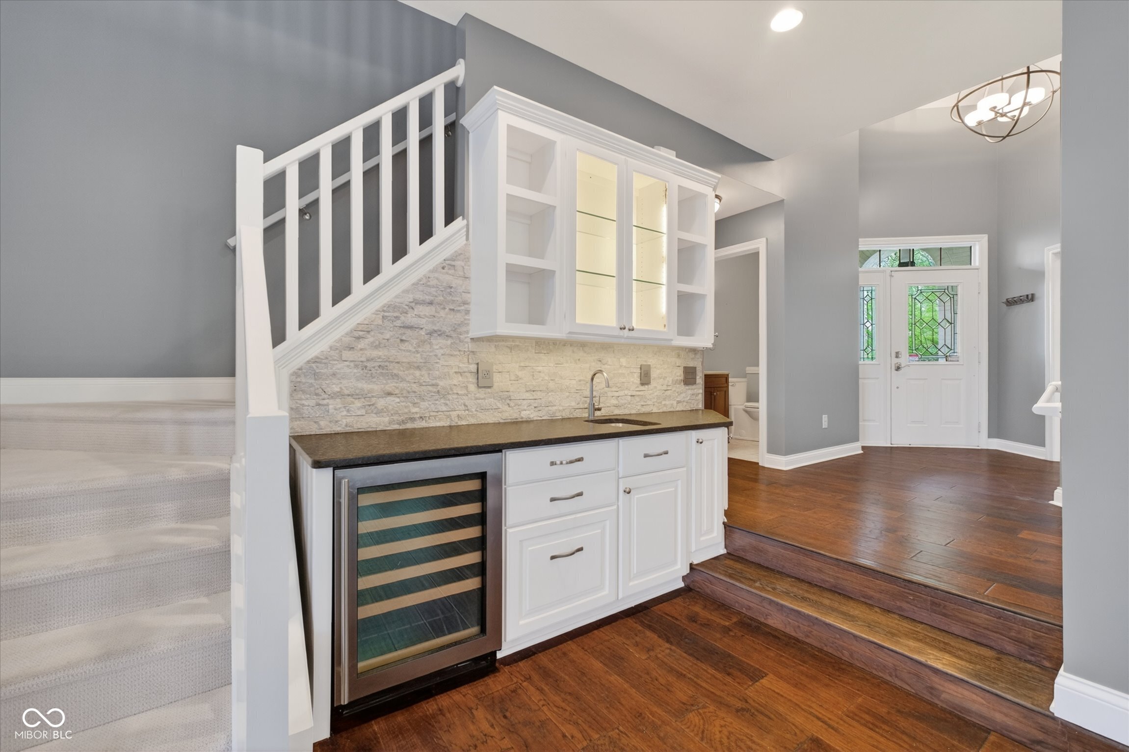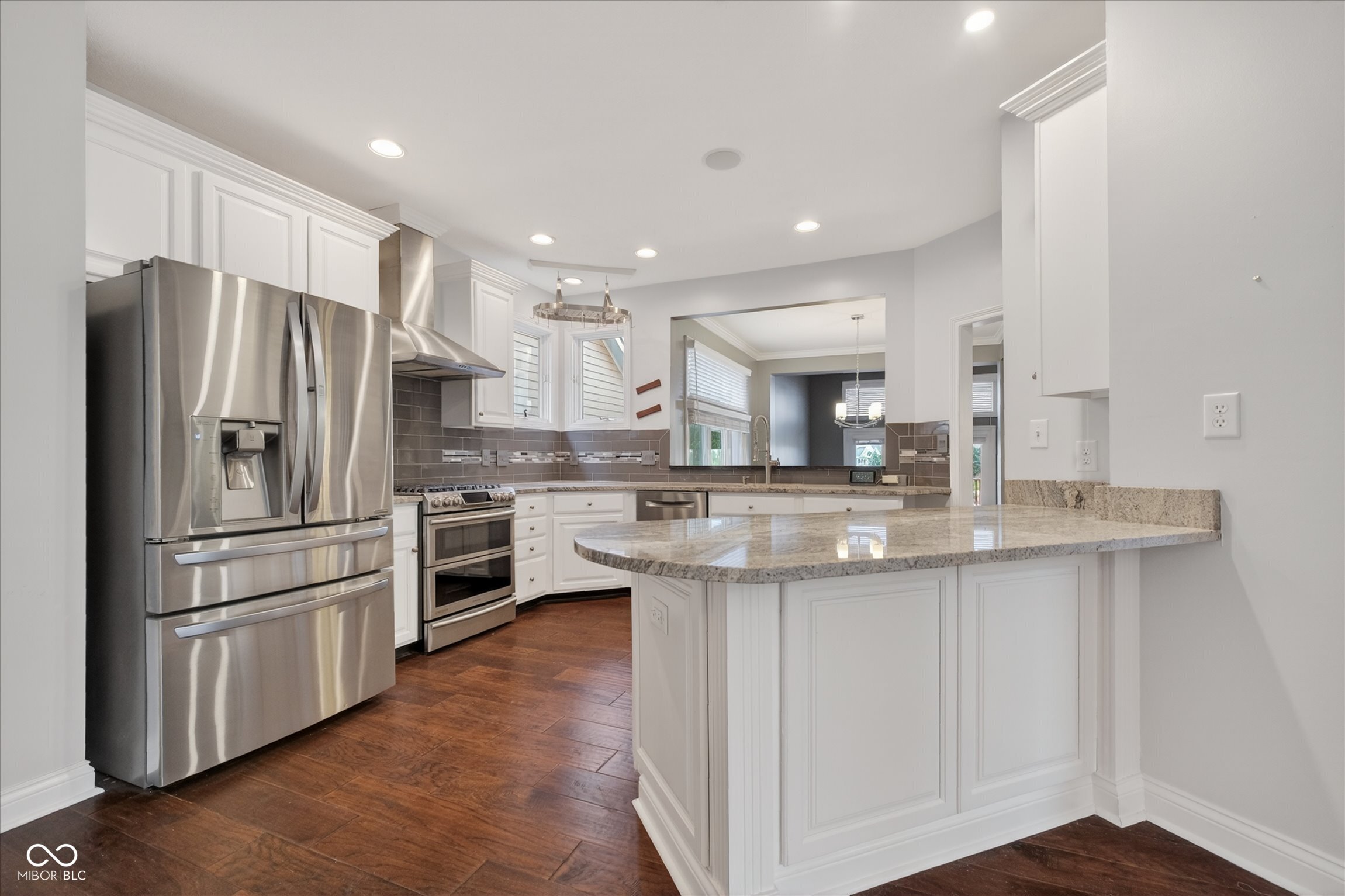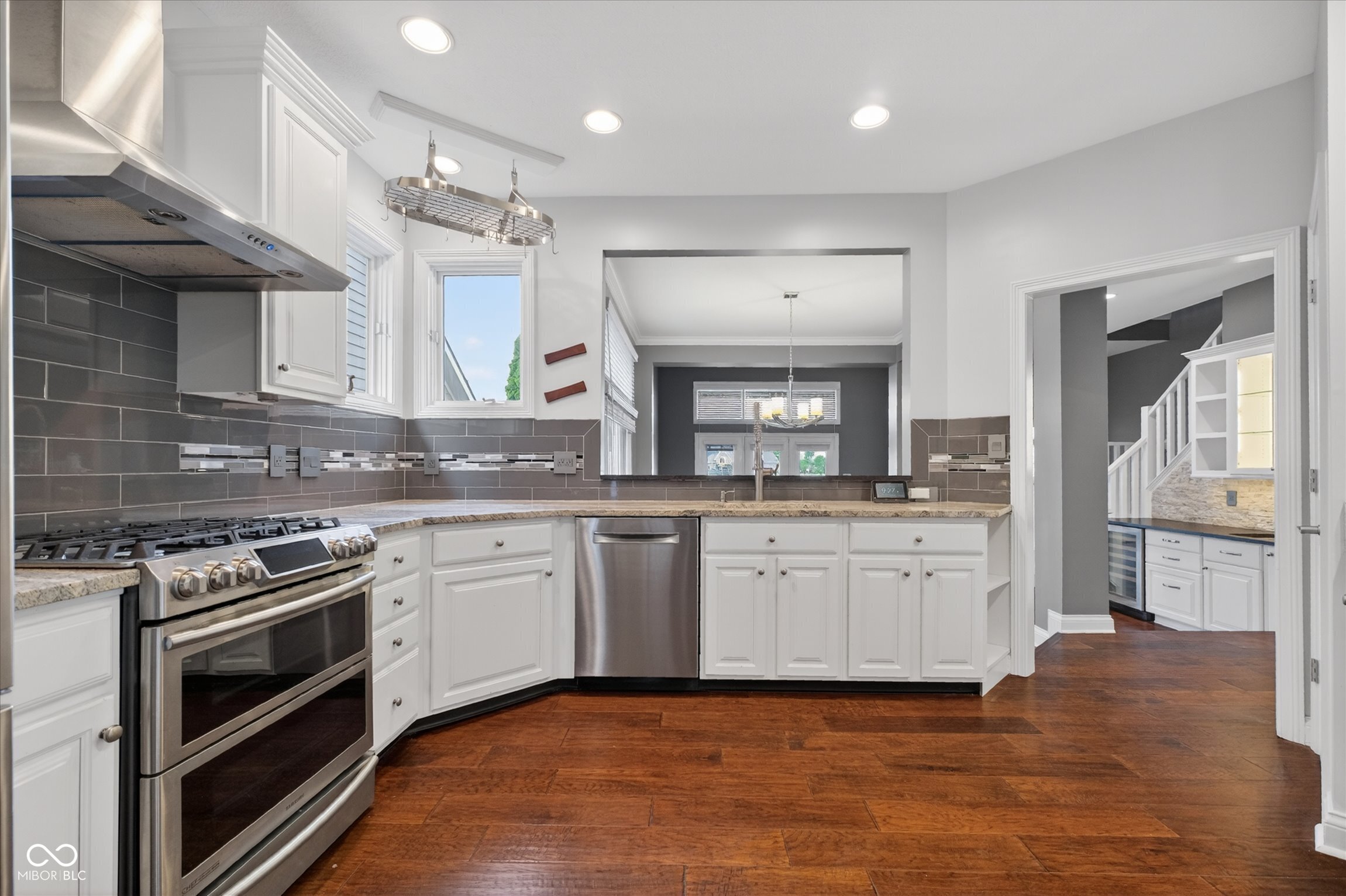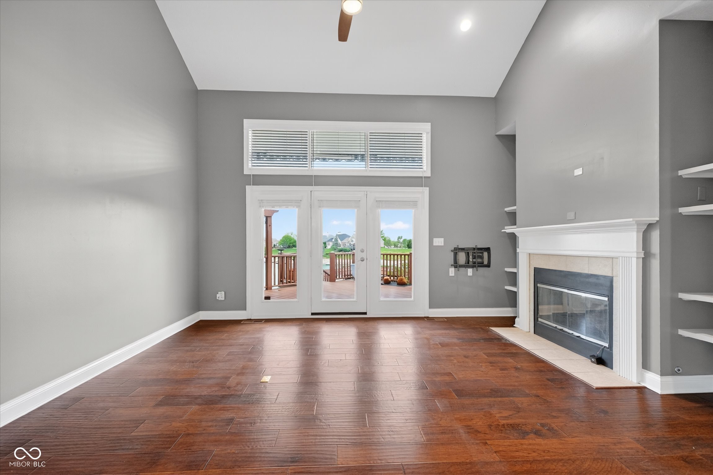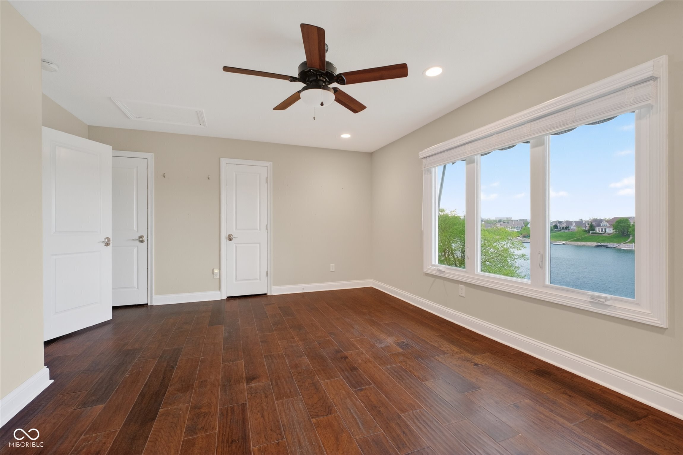 This beautifully maintained waterfront home on Crystal Lake has been thoughtfully updated and is ready to enjoy. With 3 bedrooms and 2.5 baths, it features engineered hardwood floors throughout and serene lake views that make everyday living feel special. The updated deck is ideal for relaxing or entertaining, while the well-designed landscaping includes a limestone walkway leading directly to your private dock. Inside, a dual-sided fireplace creates a warm, inviting feel in both the living room and the primary bedroom. The spacious main-level primary suite offers a true retreat. The kitchen has been nicely updated with ample counter space and cabinetry, subway tile, and a gas cooktop paired with a double electric oven. A custom built-in bar in the dining area makes hosting easy and enjoyable. Upstairs, you'll find additional living space, including a third bedroom, a large full bath, a generous loft area, and plenty of walk-in storage. The finished basement adds even more flexibility-perfect for a rec room or gym. A 2-car garage adds convenience, and the location puts you just minutes from great shopping and dining on the north side of Indianapolis.