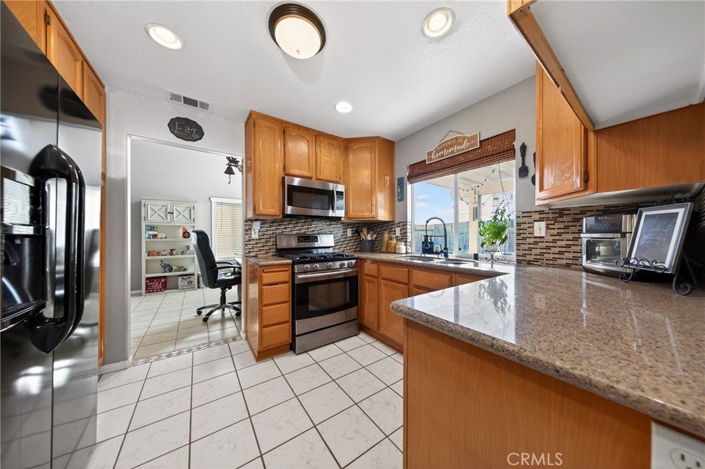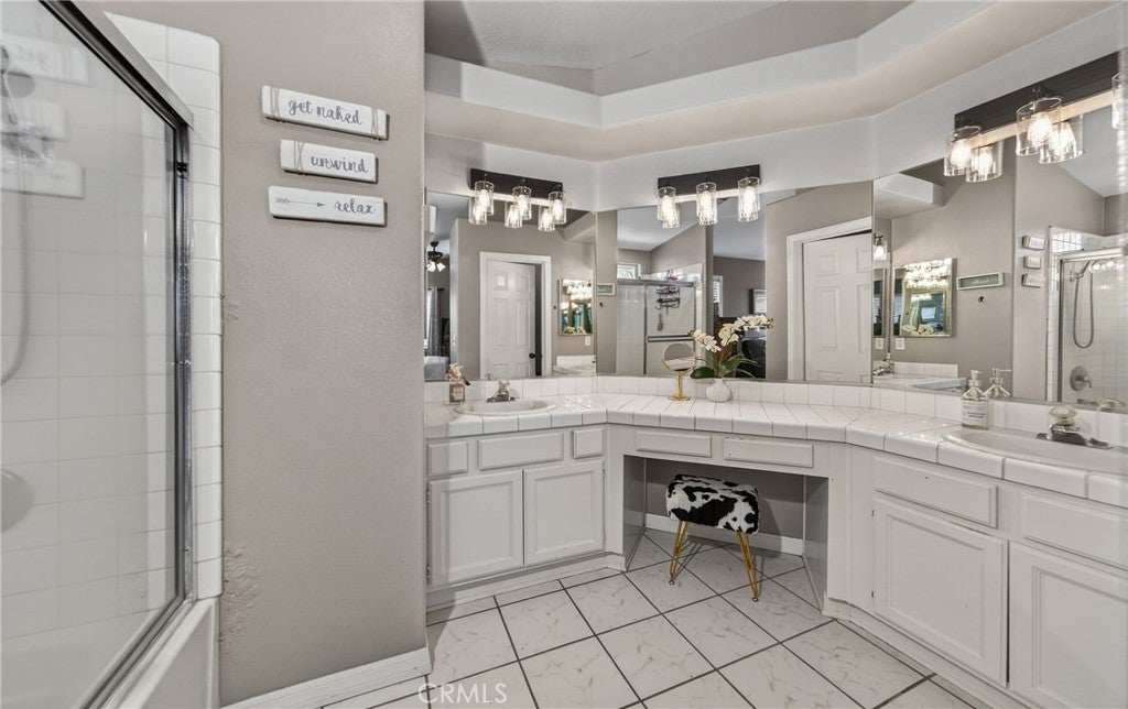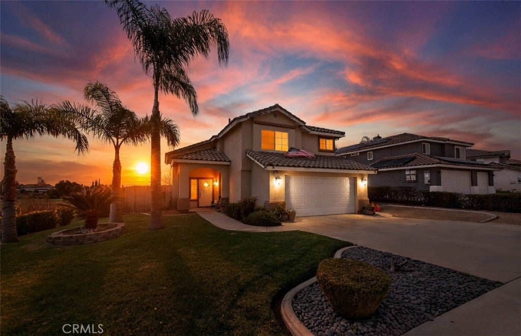 Welcome to this BEAUTIFULLY UPDATED HOME ideally situated on a corner lot and on a CUL-DE-SAC with NO HOA. With high ceilings and abundant natural light, the home offers a bright and inviting atmosphere from the moment you step inside. The main level features both a living room with high ceilings and a family room, connected by a striking see-through fireplace that creates warmth and character throughout the space. The kitchen has quartz countertops and a refrigerator that stays with the property if needed. Downstairs a guest bathroom, indoor laundry room, and direct access to the two-car garage add everyday convenience. Upstairs, all bedrooms are thoughtfully located, including the spacious primary suite with a double-door entry tucked down the hall. The primary bath suite offers dual sinks, large mirrors, and generous counter and cabinet space. The upstairs guest bathroom between the two guest rooms has been beautifully updated with a new deep tub and classic white subway tile shower. The upstairs hallway provides a large linen closet and boasts an amazing view of the downstairs living room. Step outside to the backyard with a patio cover, and orange and peach fruit trees, providing a great setting for relaxing, entertaining, or enjoying the outdoors. The back yard has a gas hookup for a fire pit and the water heater is less than a year old. Positioned perfectly to take in Yucaipa’s beautiful sunsets, this home offers both comfort and desirability in this cul-de-sac neighborhood.