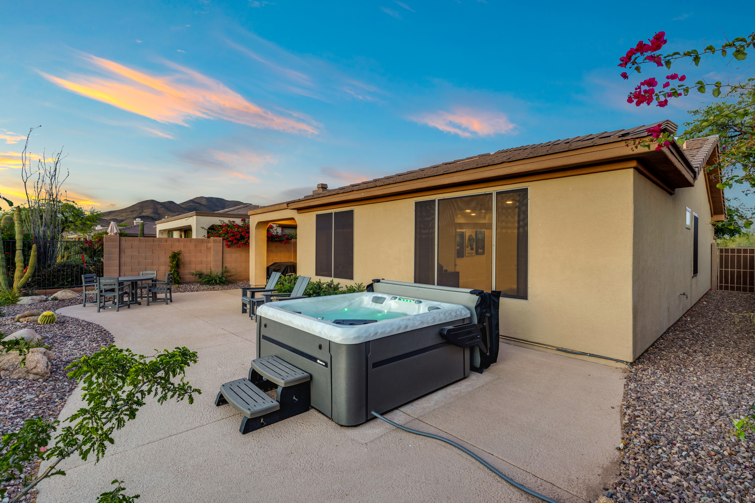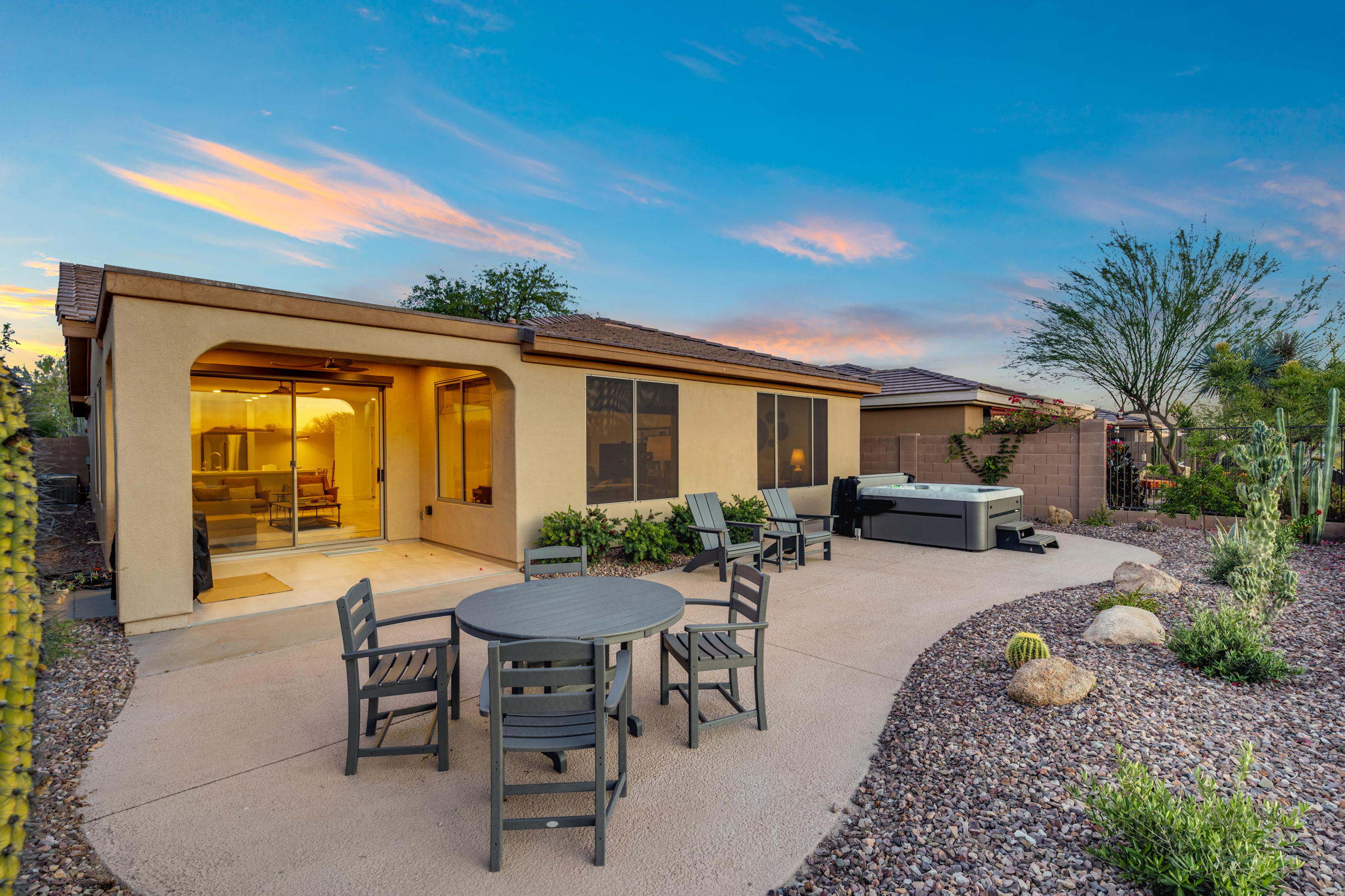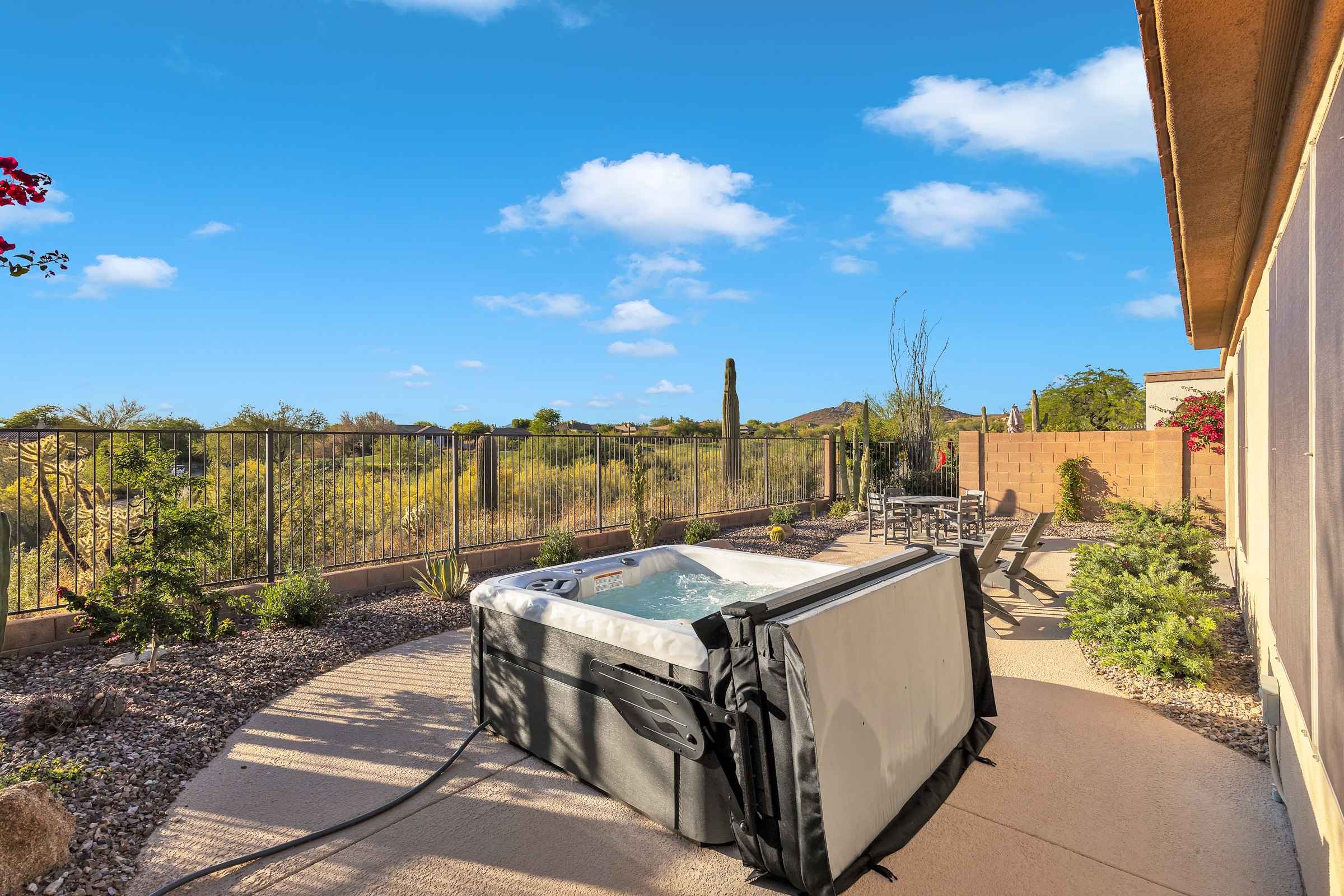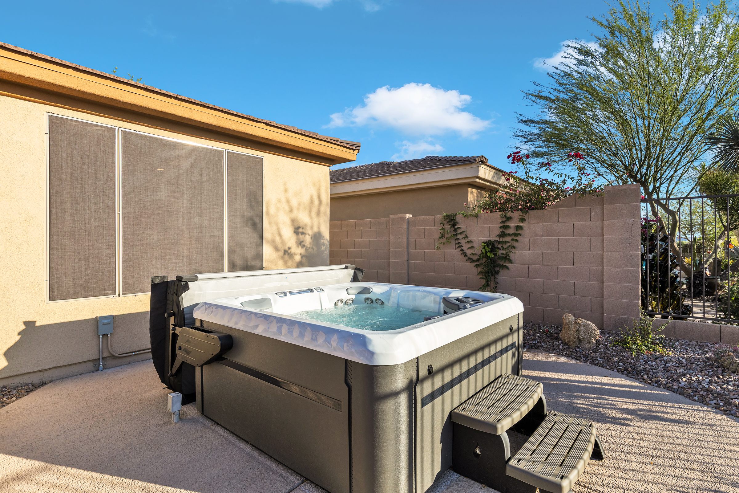 Modern Sonoran Spa Retreat on Premium Golf Course Lot Experience the pinnacle of desert living in this meticulously reimagined Sonoran retreat. Nestled on a premium golf course lot, the home backs to a private wash for ultimate seclusion. Enjoy tranquil mornings on the patio where the only sound is the gentle waterfall from hole 2 across the street. STUNNING MODERN INTERIOR A complete top-to-bottom renovation featuring high-end tile throughout--no carpet. New Shaker-style interior doors, custom trim, and modern baseboards create a sleek, cohesive aesthetic. The chefs kitchen is a showstopper with over 40k in custom cabinetry, stunning quartz countertops with professional fabrication, and a premium Bosch appliance package. Designer lighting (up/down lighting) and a custom TV niche with acoustic panels elevate the living space. Spa-like primary bathroom.NEW MECHANICALS & PEACE OF MIND Sleep easy knowing every major system has been addressed. HVAC: New AC and Heat (2024). Roof: New roofing underlayment (2020). Plumbing: New sewer pipe replacement and water heater (2025). Protection: New front and storm doors, sunscreen window screens, and wired Fire/CO2 alarms. RESORT-STYLE BACKYARD Relax in your brand-new Master Spas salt water hot tub overlooking the golf course. The grounds feature professional irrigation and lush new plantings by Aloha. The garage is a hobbyists dream with new epoxy flooring, custom cabinets, and a new door opener/spring (hot water, r/o, water softener new 2025). Kitchen-- Bosch induction range, quiet dishwasher, undermount microwave, and fridge Custom walnut cabinets - dovetail, quiet close, 4 custom drawer inserts (R and L of range) Professional range hood - Trade Wind. Franke composite granite sink with accessories. Brizo touch-sensitive on-off faucet. Quartz counters and backsplash. Undermount lighting. Upgraded, quiet disposal Coffee nook Cerno Una lighting - dramatic up-and-down lighting, dimmable Primary bathroom-- Lighted medicine cabinet (with interior outlets/power) Custom walnut cabinets - pull out drawers under sink, interior outlets/power Kohler and Brizo faucets and shower pieces All fans on timer switches Toto toilet - outlet if a bidet seat is added on New windows Walnut accents in closet Guest bathroom-- Lighted medicine cabinet (with interior outlets/power) Custom walnut cabinets - pull out drawers under sink, interior outlets/power Kohler shower pieces and Brizo faucet Fan on timer switch Toto toilet - outlet if a bidet seat is added on Living Room-- Custom TV cabinet/nook - storage! New front door/screen door - highly secure and modern. New interior doors/levers/trim. Electrical-- All new dimmable LED lighting. All new switches, outlets. All fans on timers. Front and back lights on automatic timers (sunset to sunrise - programmable) Maverick upgraded fans New wired fire alarms and CO2 monitor (primary bedroom) Garage-- New Wi-Fi-enabled garage door opener with camera New garage door spring New water heater New soft water system New reverse osmosis filtered water (runs to kitchen sink and fridge) New cabinets New epoxy flooring Shades and curtains-- Hunter Douglas automated blinds (currently open at sunrise and close at sunset) Custom curtains in bedrooms Yard and spa-- New Master Spa salt water hot tub New irrigation system - monitored for leaks in interior/exterior (Aloha Irrigation) New plants/tree in back yard New 90% sunscreens Tiled porch area to match interior This isnt just a house; its a move-in ready.