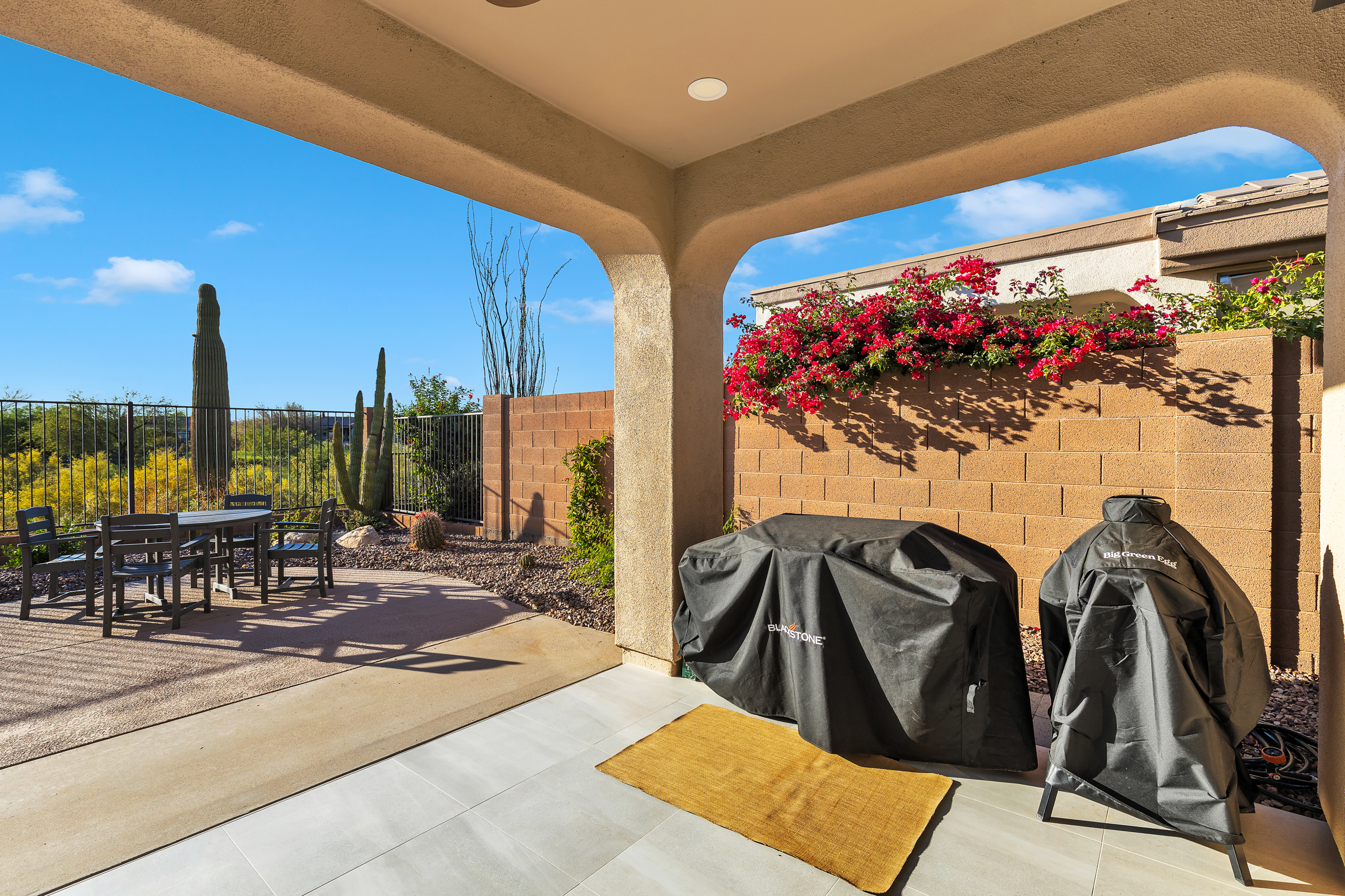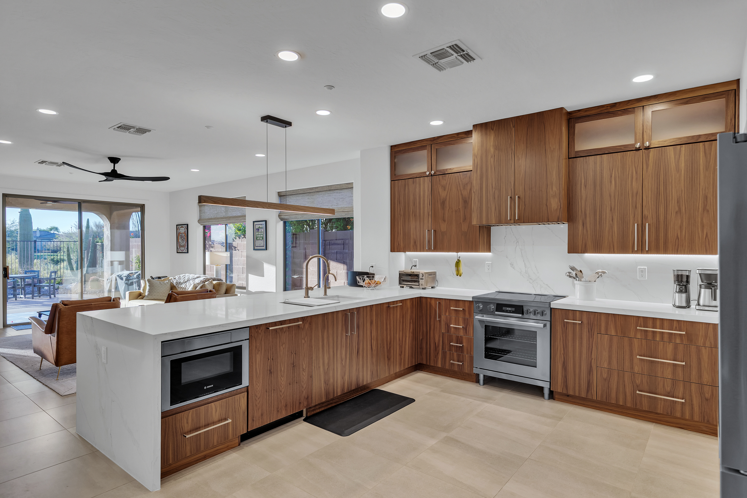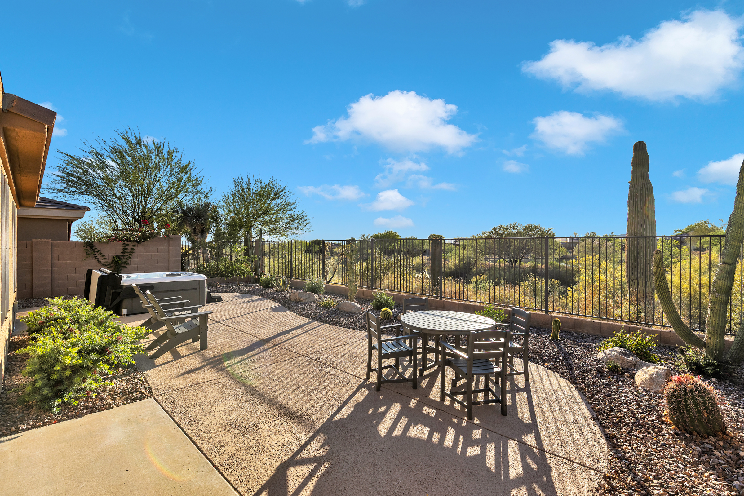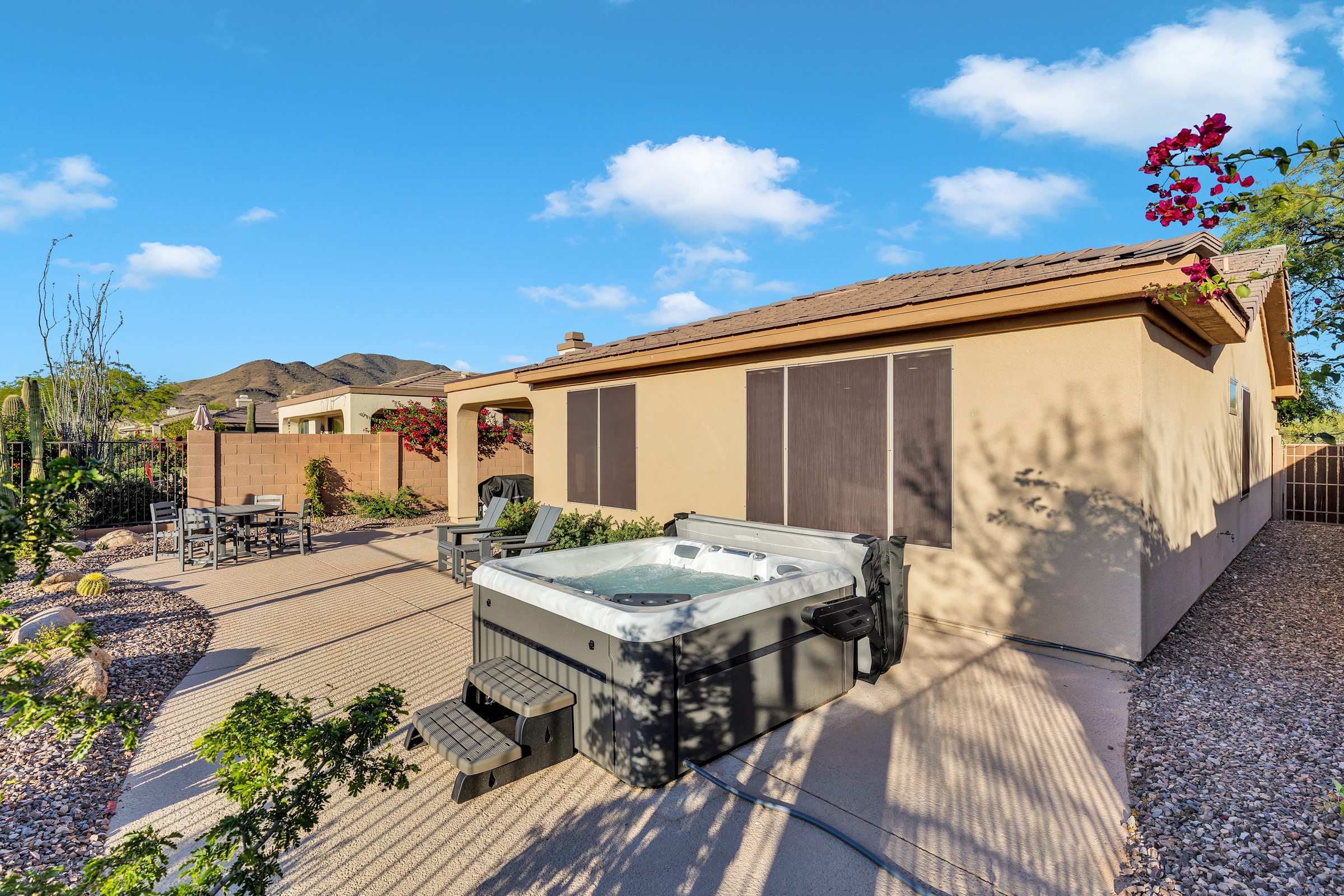 Modern Sonoran Spa Retreat on Premium Golf Course Lot Experience the pinnacle of desert living in this meticulously reimagined Sonoran retreat. Nestled on a premium golf course lot, the home backs to a private wash for ultimate seclusion. Enjoy tranquil mornings on the patio where the only sound is the gentle waterfall from hole 2 across the street. STUNNING MODERN INTERIOR A complete top-to-bottom renovation featuring high-end tile throughout--no carpet. New Shaker-style interior doors, custom trim, and modern baseboards create a sleek, cohesive aesthetic. The chefs kitchen is a showstopper with over 40k in custom cabinetry, stunning quartz countertops with professional fabrication, and a premium Bosch appliance package. Designer lighting (up/down lighting) and a custom TV niche with acoustic panels elevate the living space. Spa-like primary bathroom.NEW MECHANICALS & PEACE OF MIND Sleep easy knowing every major system has been addressed. HVAC: New AC and Heat (2024). Roof: New roofing underlayment (2020). Plumbing: New sewer pipe replacement and water heater (2025). Protection: New front and storm doors, sunscreen window screens, and wired Fire/CO2 alarms. RESORT-STYLE BACKYARD Relax in your brand-new Master Spas salt water hot tub overlooking the golf course. The grounds feature professional irrigation and lush new plantings by Aloha. The garage is a hobbyists dream with new epoxy flooring, custom cabinets, and a new door opener/spring (hot water, r/o, water softener new 2025). Kitchen-- Bosch induction range, quiet dishwasher, undermount microwave, and fridge Custom walnut cabinets - dovetail, quiet close, 4 custom drawer inserts (R and L of range) Professional range hood - Trade Wind. Franke composite granite sink with accessories. Brizo touch-sensitive on-off faucet. Quartz counters and backsplash. Undermount lighting. Upgraded, quiet disposal Coffee nook Cerno Una lighting - dramatic up-and-down lighting, dimmable Primary bathroom-- Lighted medicine cabinet (with interior outlets/power) Custom walnut cabinets - pull out drawers under sink, interior outlets/power Kohler and Brizo faucets and shower pieces All fans on timer switches Toto toilet - outlet if a bidet seat is added on New windows Walnut accents in closet Guest bathroom-- Lighted medicine cabinet (with interior outlets/power) Custom walnut cabinets - pull out drawers under sink, interior outlets/power Kohler shower pieces and Brizo faucet Fan on timer switch Toto toilet - outlet if a bidet seat is added on Living Room-- Custom TV cabinet/nook - storage! New front door/screen door - highly secure and modern. New interior doors/levers/trim. Electrical-- All new dimmable LED lighting. All new switches, outlets. All fans on timers. Front and back lights on automatic timers (sunset to sunrise - programmable) Maverick upgraded fans New wired fire alarms and CO2 monitor (primary bedroom) Garage-- New Wi-Fi-enabled garage door opener with camera New garage door spring New water heater New soft water system New reverse osmosis filtered water (runs to kitchen sink and fridge) New cabinets New epoxy flooring Shades and curtains-- Hunter Douglas automated blinds (currently open at sunrise and close at sunset) Custom curtains in bedrooms Yard and spa-- New Master Spa salt water hot tub New irrigation system - monitored for leaks in interior/exterior (Aloha Irrigation) New plants/tree in back yard New 90% sunscreens Tiled porch area to match interior This isnt just a house; its a move-in ready.