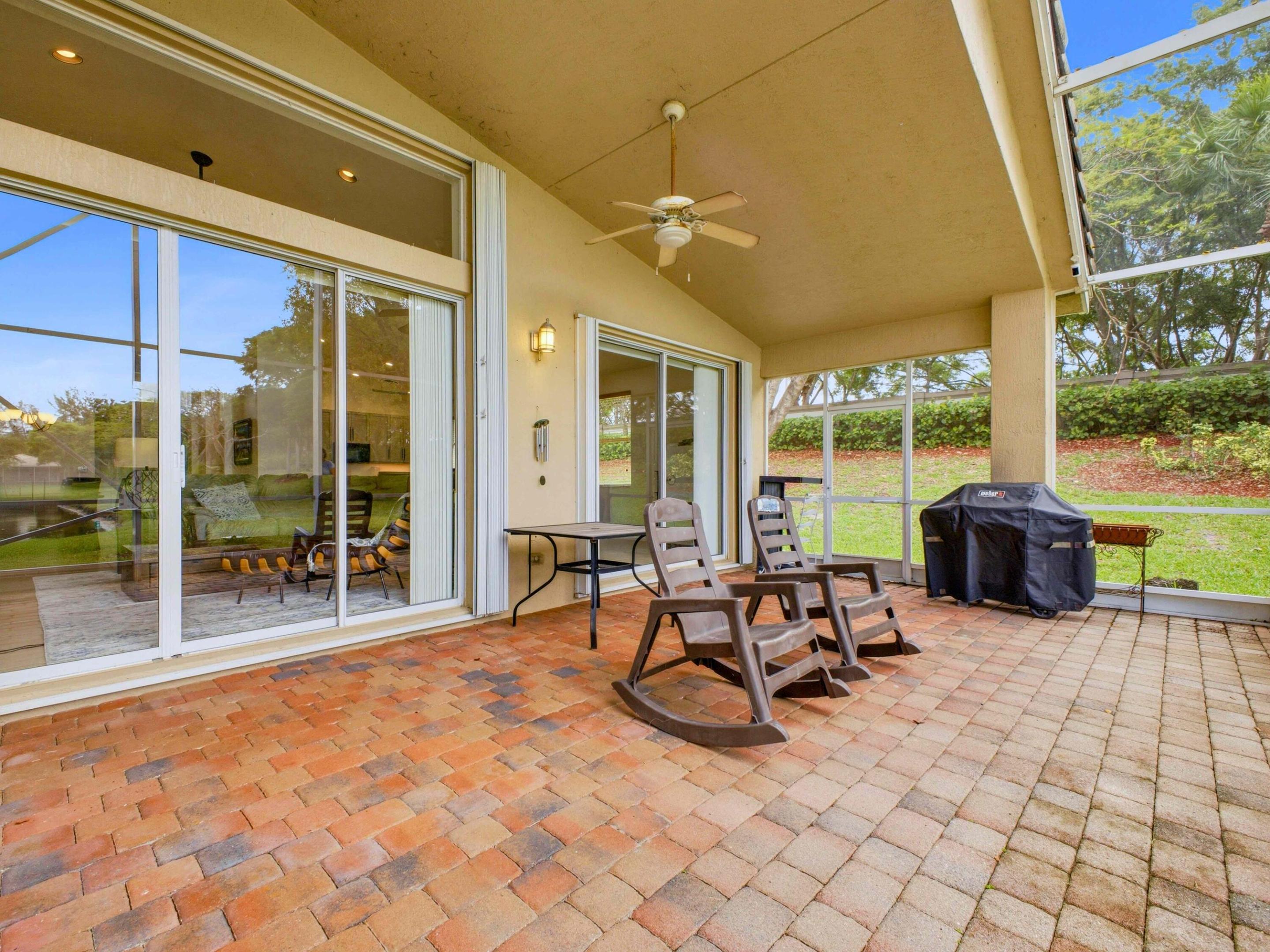 Tucked away at the end of a peaceful cul-de-sac, this beautifully crafted home offers the perfect blend of style, comfort, and thoughtful design all just minutes from the beach, shopping, and more! From the moment you arrive, the meticulous care and attention to detail are unmistakable. Step inside to discover a bright, open layout enhanced by soaring cathedral ceilings, elegant chair rail accents, and rich hardwood flooring that flows through the main living areas, including the spacious living room, dining room, family room, office, and primary suite. Plantation shutters throughout add timeless charm. The heart of the home is a well-appointed kitchen designed to impress, featuring granite countertops, stainless steel appliances, double ovens, a convection microwave, 42 cabinets, a center work island, and a cozy breakfast nook-perfect for casual mornings or entertaining guests. Two generous pantries and abundant cabinetry ensure storage is never an issue. This versatile floor plan includes three bedrooms, two baths, and a dedicated study/den, offering flexibility for work or relaxation. The spacious primary suite is a true retreat, complete with a large walk-in closet and a spa-like bath with a whirlpool tub and separate shower. Outdoor living is equally exceptional. A sprawling screened porch opens to an expansive backyard oasis with approximately 1,000 square feet of outdoor living space. Enjoy evenings by the stunning Charleston-style brick fireplace, surrounded by lush, mature landscaping, brick paver walkways, wrought iron fencing, and dedicated garden spaces that will delight any gardening enthusiast. Additional highlights include a new HVAC system (2024), low HOA, and a level of upkeep that truly sets this home apart. Whether you're hosting gatherings or simply enjoying quiet moments at home, this property delivers a lifestyle that's both refined and relaxed.