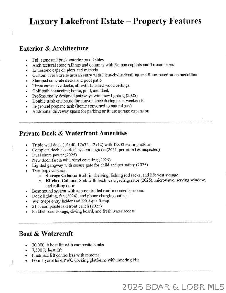 Luxury lake living at the world class Golf Club of Porto Cima with pools, gym, pickleball & tennis. This stunning estate showcases impeccable craftsmanship with full stone and brick exterior, expansive decks with wood ceilings, and breathtaking outdoor living spaces designed for entertaining & perfectly positioned to capture the stunning lake view. Enjoy a resort-style experience with a saltwater pool, integrated spa, waterfall feature, firebowls, multiple fireplaces, and fully equipped outdoor bar & grill area. Private dock in deep water cove at the premier 14mm featuring multiple slips, dual shore power, two cabanas & sound system. Inside, the home offers abundant storage, a chefs kitchen with Sub-Zero and Wolf appliances, custom cabinetry, high-end finishes & elevator to 3 levels. The primary suite is a true retreat with a spa-like bath and private lakeview access. Multiple ensuite bedrooms, a bunkroom, office, and expansive living spaces provided for everyone. Additional highlights include geothermal HVAC, fiber internet, smart home automation, security system & climate-controlled garage. This is more than a home, its an extraordinary estate that boasts a luxury lifestyle.