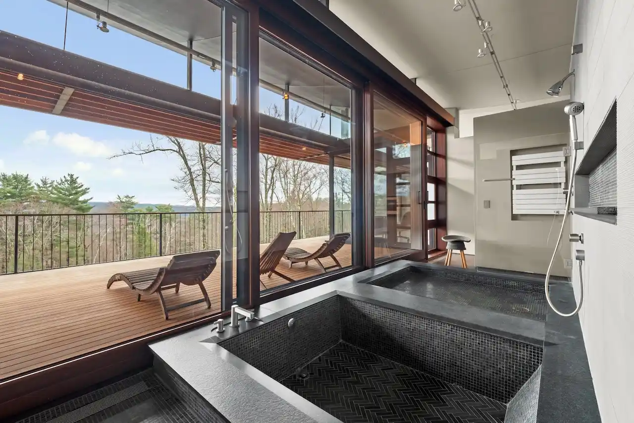 Experience a rare Zen-inspired retreat in the heart of the Berkshires, brilliantly designed to exist in harmony with its natural surroundings. Set on nearly 120 acres of protected land with striking rock outcroppings, sweeping mountain views, and frontage along the Williams River, this architecturally significant contemporary offers a true sense of privacy, tranquility, and escape — all just minutes from downtown Great Barrington. Designed by renowned architect Steven Haas and constructed of steel, glass, concrete, and wood, the main residence is defined by dramatic volumes and German Sorpetaler door and window systems that dissolve the boundary between indoors and out.Expansive IPE hardwood decks overlook a 25-meter heated saltwater lap pool, outdoor kitchen, hot tub, stone fire pit, and pool cabana with full bath. The chef’s kitchen with wood-burning fireplace anchors the home and connects seamlessly to the outdoor entertaining areas. The main living room offers a second fireplace, bar area, and immersive views of nature. A covered courtyard ties the spaces together, enhancing the home’s serene, contemplative design. The primary wing is a private sanctuary with spa bath, dressing room, lounge, and private decks overlooking the Berkshire Mountains. The lower level adds a billiards room and wet bar.A separate guest house offers two bedrooms, open kitchenette, and a rooftop deck with panoramic views. A beautifully finished 3,000 sq ft recreation barn with full kitchen, dining area, full bath, and open loft provides remarkable versatility for entertaining or creative pursuits. Eight miles of private hiking and biking trails wind through the property to the Williams River — completing an extraordinary compound that is sophisticated, serene, and moments from the dining, shopping, and culture of Great Barrington.