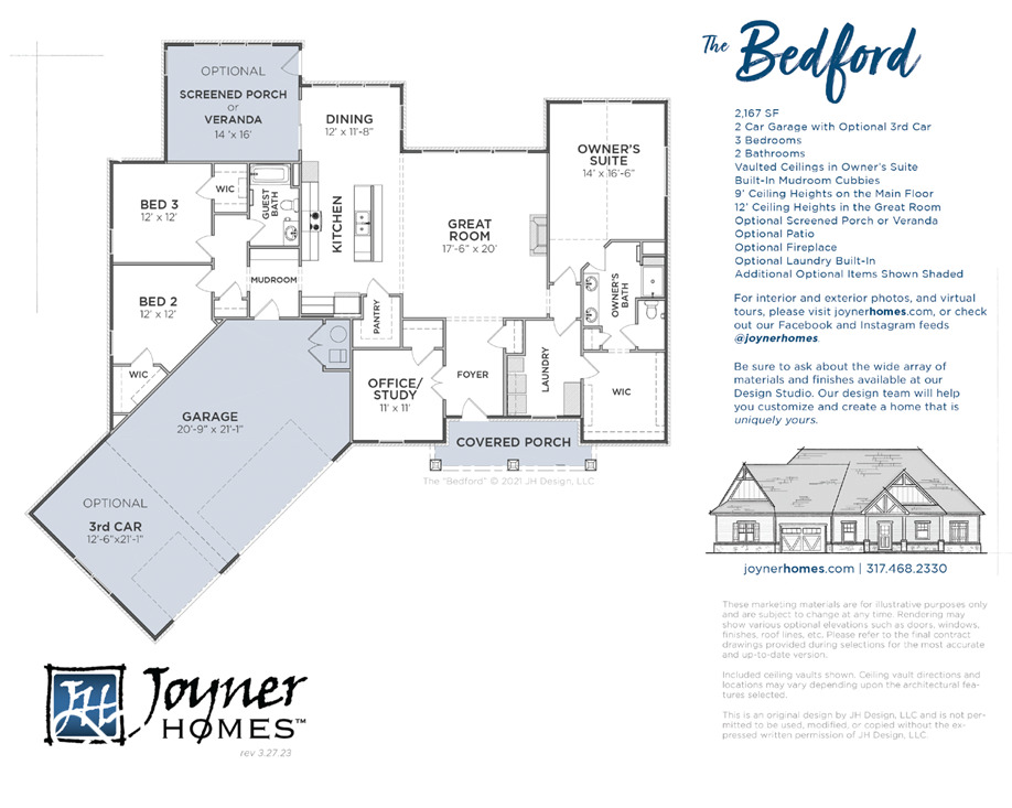 Presented by Joyner Homes, this proposed build features The Bedford Black Series floor-plan. Featuring 2167 square feet, this thoughtfully styled ranch feels like a dream come true. You'll love the designer kitchen with walk-in pantry, appliances and quartz counters, entertainment worthy great room with 12' ceiling and cozy fireplace optional, home office, luxurious primary suite with walk-in closet, vaulted ceiling and double sinks, large bedrooms, mudroom with cubbies, full- unfinished basement, and spacious 3-car garage. Prior to the start of construction, our homes' features and finishes are fully customizable at our Design Studio located in downtown Greenfield, Indiana. Please note there will be additional site costs associated with the lot that are dependent upon the home design, home placement on the lot, walk-out basement add ons, etc. Site costs are likely to add an additional 40,000 or more for this particular lot.