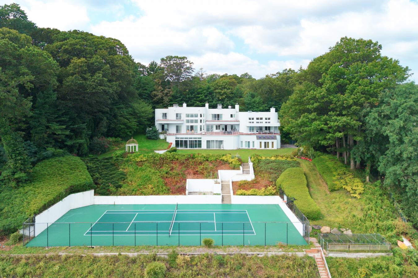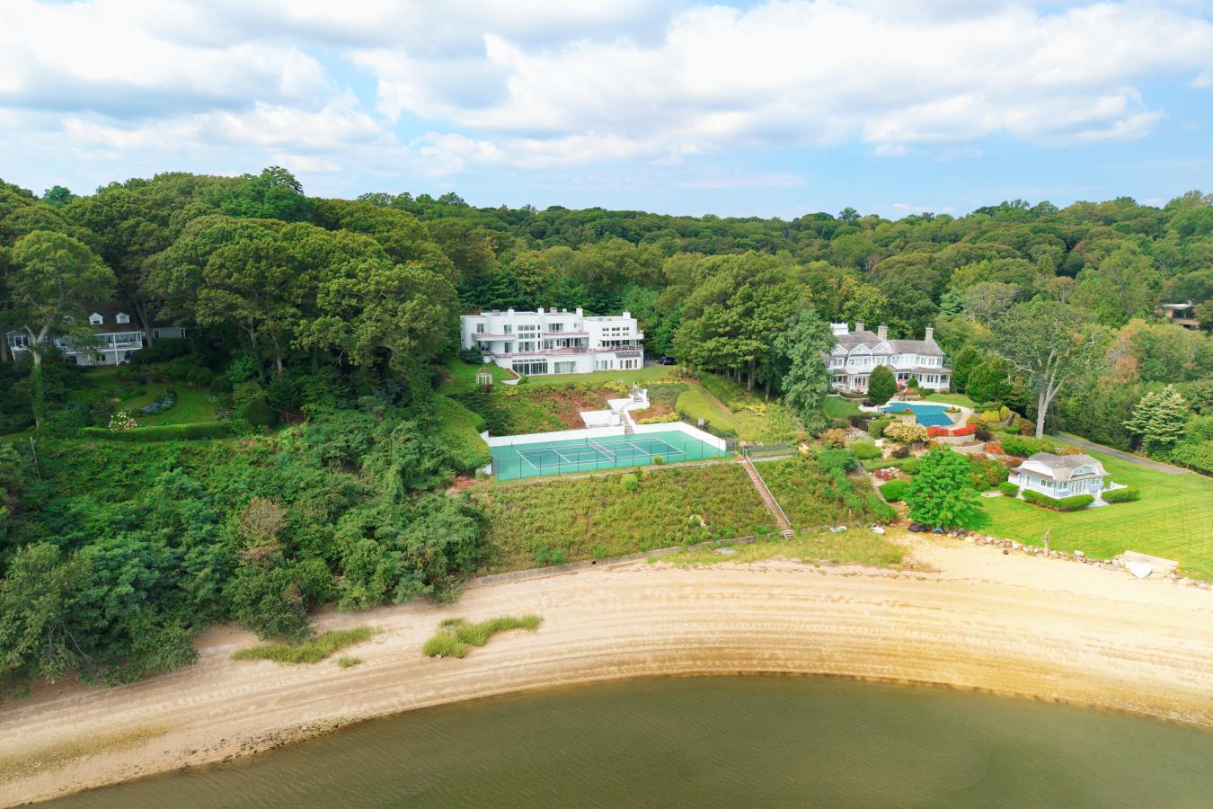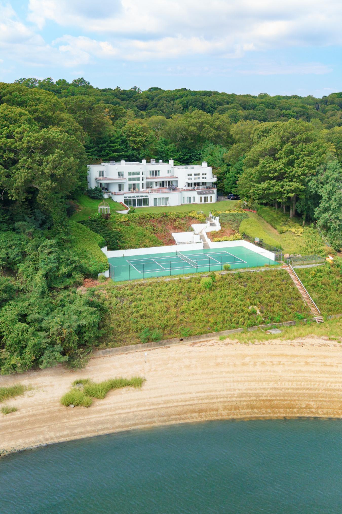 Experience the ultimate in waterfront living with this extraordinary 9,000 sq. ft. estate set on two sweeping acres with 200 feet of private shoreline in Oyster Bay. Designed for both grand entertaining and everyday comfort, the residence offers 5 bedrooms, 6.5 baths, and 4 fireplaces, all supported by modern essentials including a full-house generator and security system. Step inside the dramatic entry foyer where light and space unfold into expansive living areas with floor-to-ceiling windows framing panoramic water views. The main level is highlighted by a sophisticated living room, formal dining room, and a versatile lounge/meeting space. A library with its own bath provides a perfect retreat or guest option. The chefs kitchen impresses with granite counters, custom cabinetry, professional appliances including three ovens and two dishwashers, and an adjoining laundry/mudroom. A spectacular 1,600 sq. ft. great room with a wet bar and wood-burning fireplace anchors the first floor. Upstairs, three ensuite bedrooms each open to private balconies overlooking the water. The primary suite is a true sanctuary featuring a fireplace, spa bath with dual vanities, and an oversized walk-in dressing closet. Outdoor living is elevated with more than 1,800 sq. ft. of wraparound decking, a tennis court, gazebo, and direct water access for kayaking, jet skiing, and more. The lower level extends the lifestyle with an indoor pool and hot tub, an entertainment space with wet bar, a full guest suite with private entrance, abundant storage, and a 4 car garage. With meticulous craftsmanship and unparalleled amenities inside and out, this residence is not just a home-its a private waterfront resort.