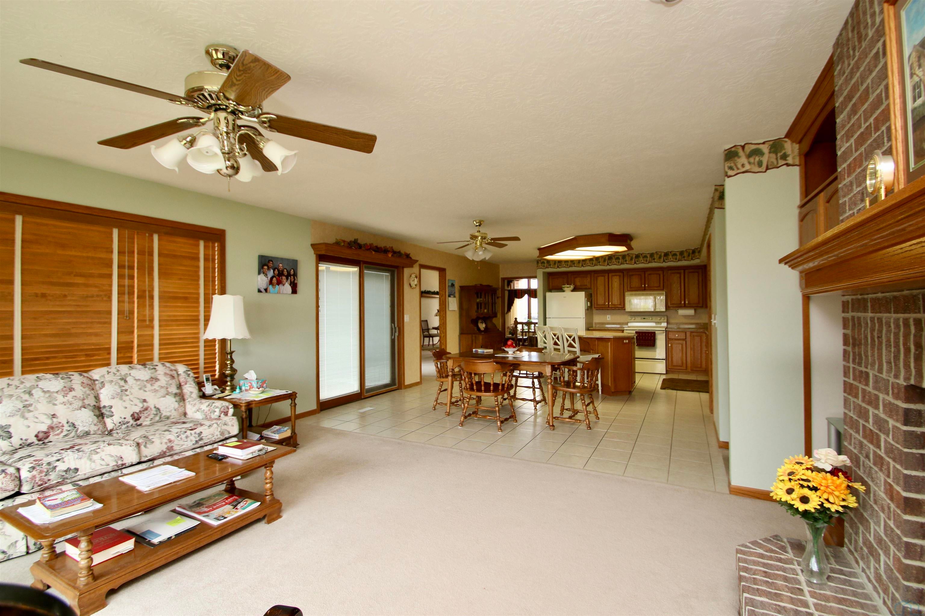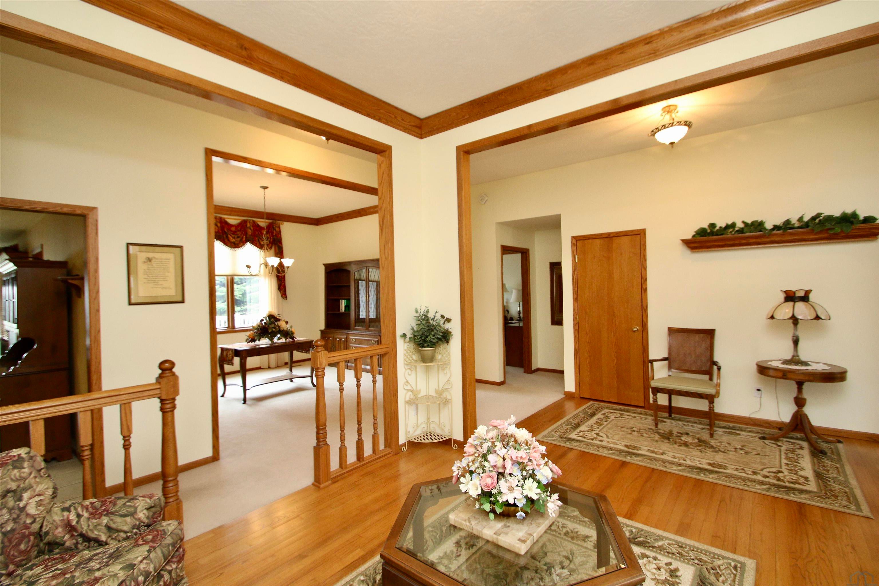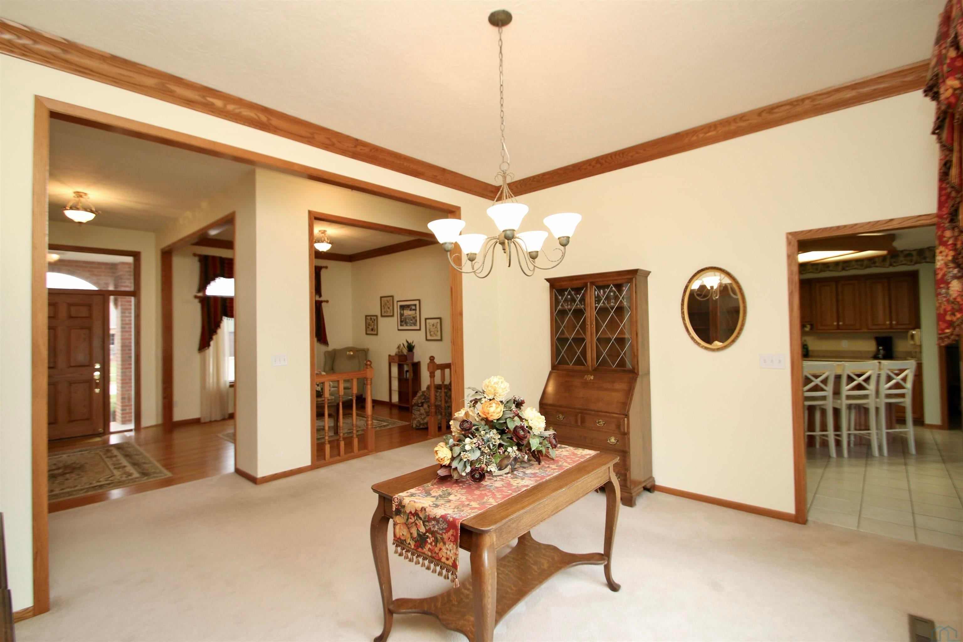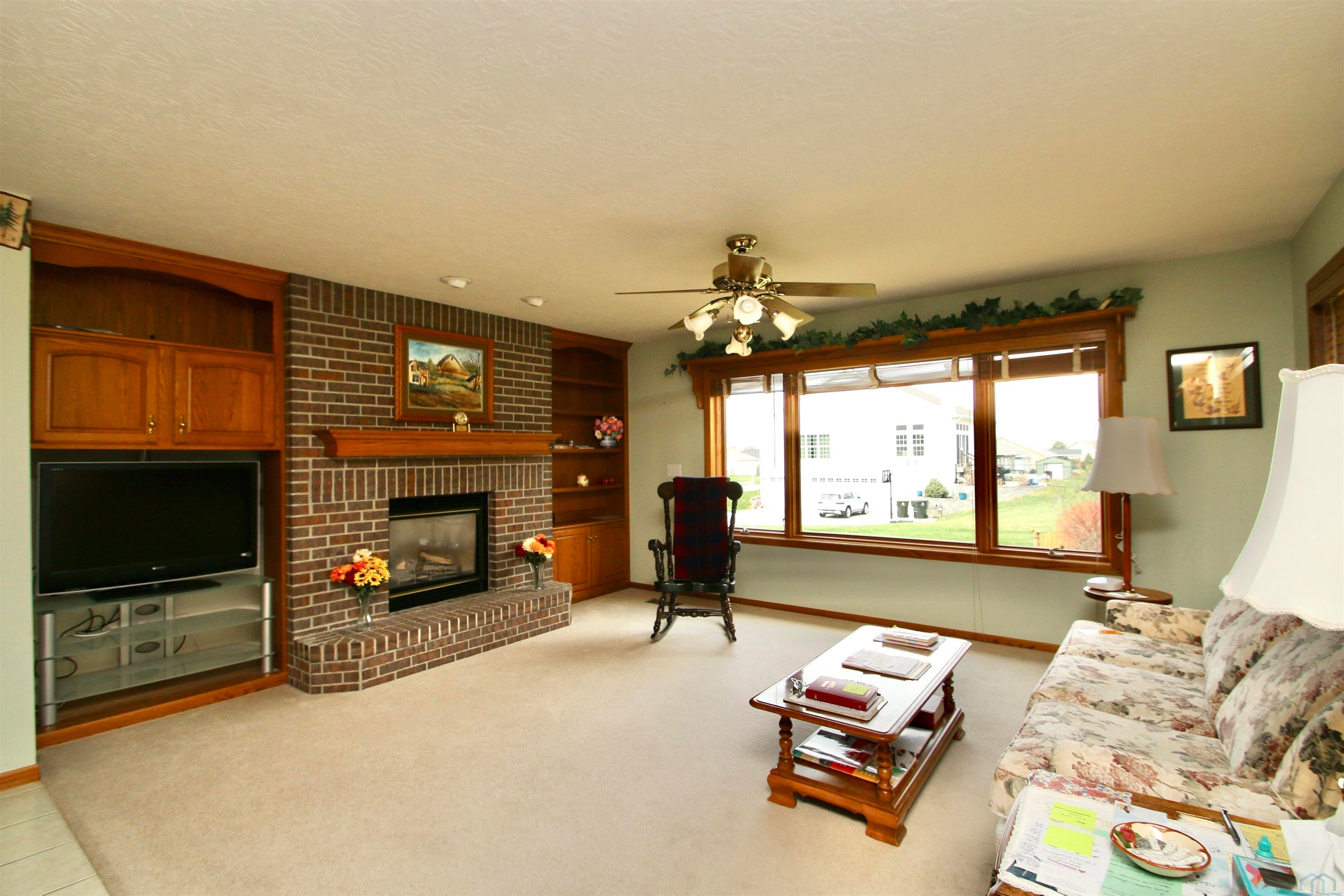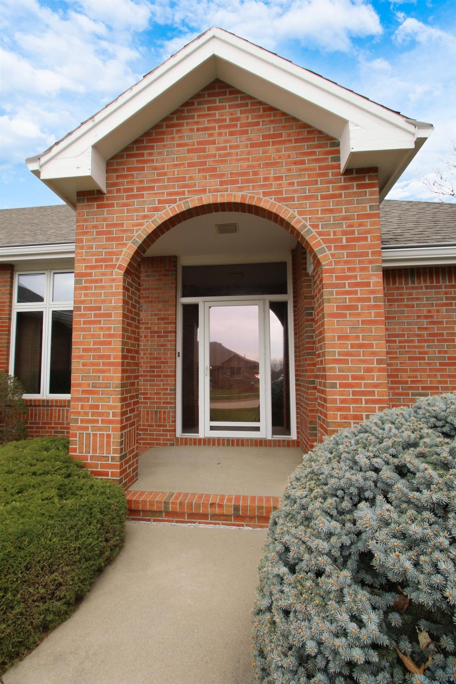 There is room for everyone in this spacious ranch home conveniently located near shopping and dining. Built by Lee Kent, this home sits on a .54-acre corner lot with mature trees and established landscaping. A welcoming first impression begins with the brick front, 3-car garage, and inviting front porch, leading into this 4-bedroom, 4-bathroom home. The entry (11x7) features wood flooring and a coat closet. A versatile room near the entry with wood flooring and crown molding offers flexible use as a formal living room, music room, office, or additional living space. The formal dining room includes a chandelier, carpet, and crown molding. The spacious eat-in kitchen features tile flooring, oak cabinets, an island, a 3x5 pantry, granite countertops, and a sliding door to the deck. Adjacent to the kitchen, the family room offers abundant natural light, a gas fireplace with brick surround, and built-ins. The home features a split-bedroom layout. The primary suite includes a carpeted bedroom with a tray ceiling, crown molding, and a sliding door to the deck. The en-suite bathroom offers tile flooring, a large double vanity, jetted tub, separate toilet and shower area, and a 6x10 walk-in closet. Two additional bedrooms include carpet, ceiling fans, and walk-in closets, with a full bathroom nearby featuring a large single vanity, tile floor, and tub/shower combination. Near the garage entry are a half bathroom and laundry area. The lower level includes a large family room with daylight windows, an additional bedroom with carpet, daylight window, and walk-in closet, a 3/4 bathroom, and a den with access to a spacious storage/mechanical area suitable for a workshop, craft, or fitness space. Updates include: water heater (2025), water softener (2025), refrigerator (2026), dishwasher (2020), shingles (2017), washer/dryer (2025), and HVAC/humidifier (2020). A radon mitigation system is in place.