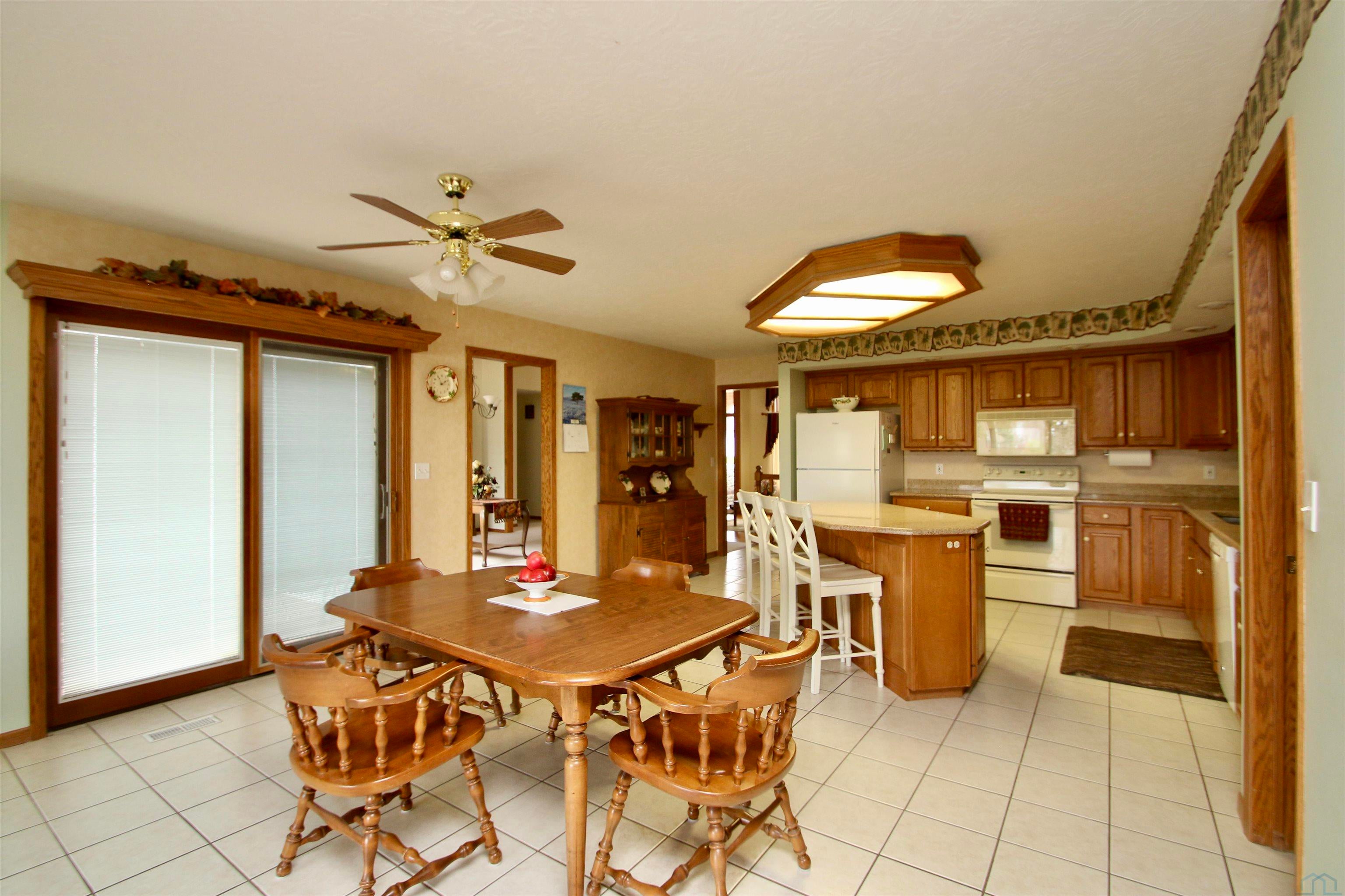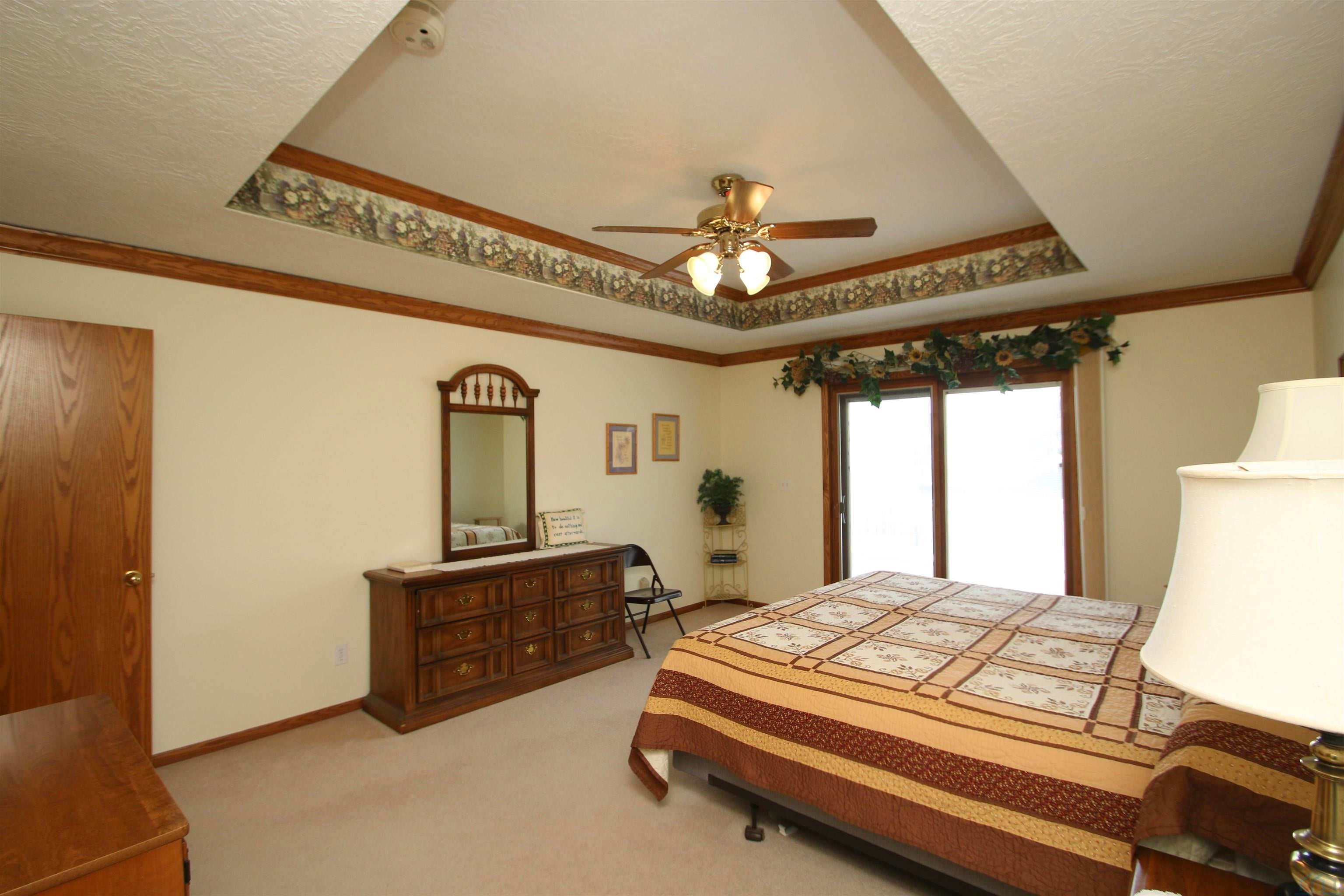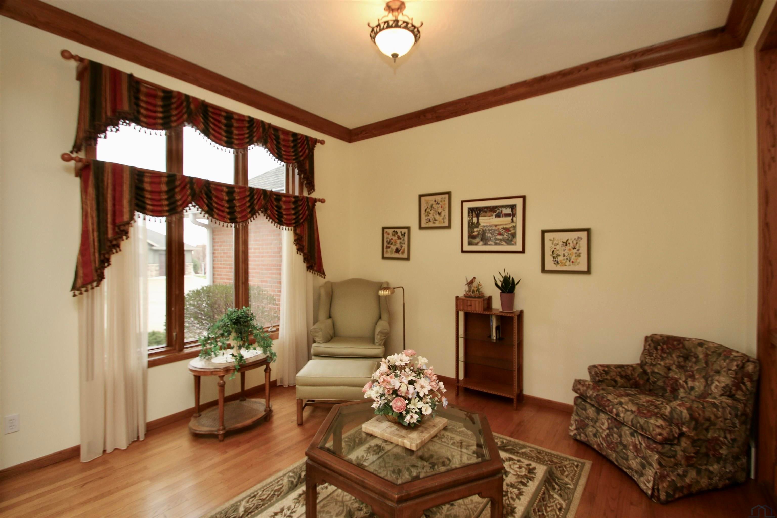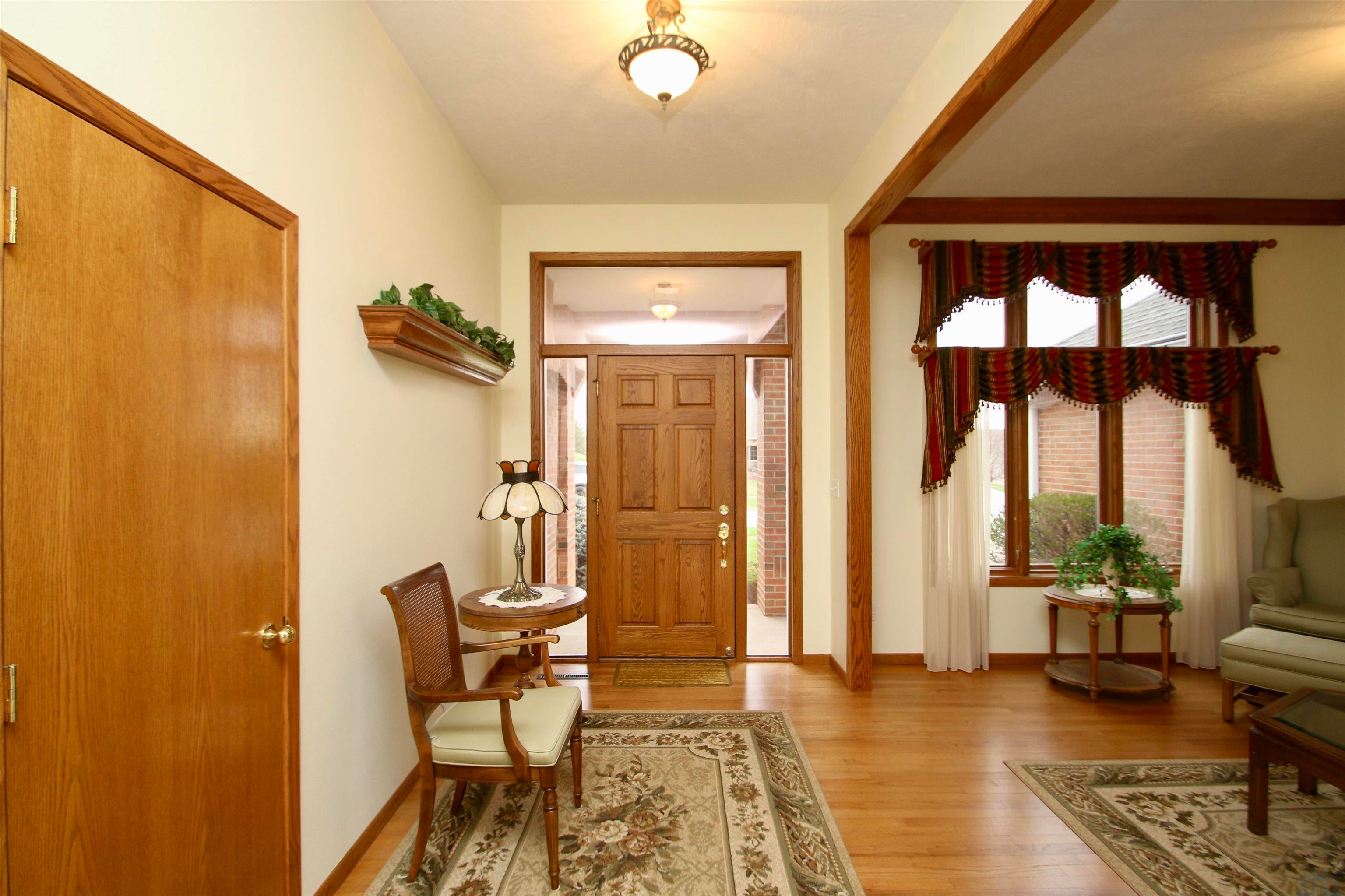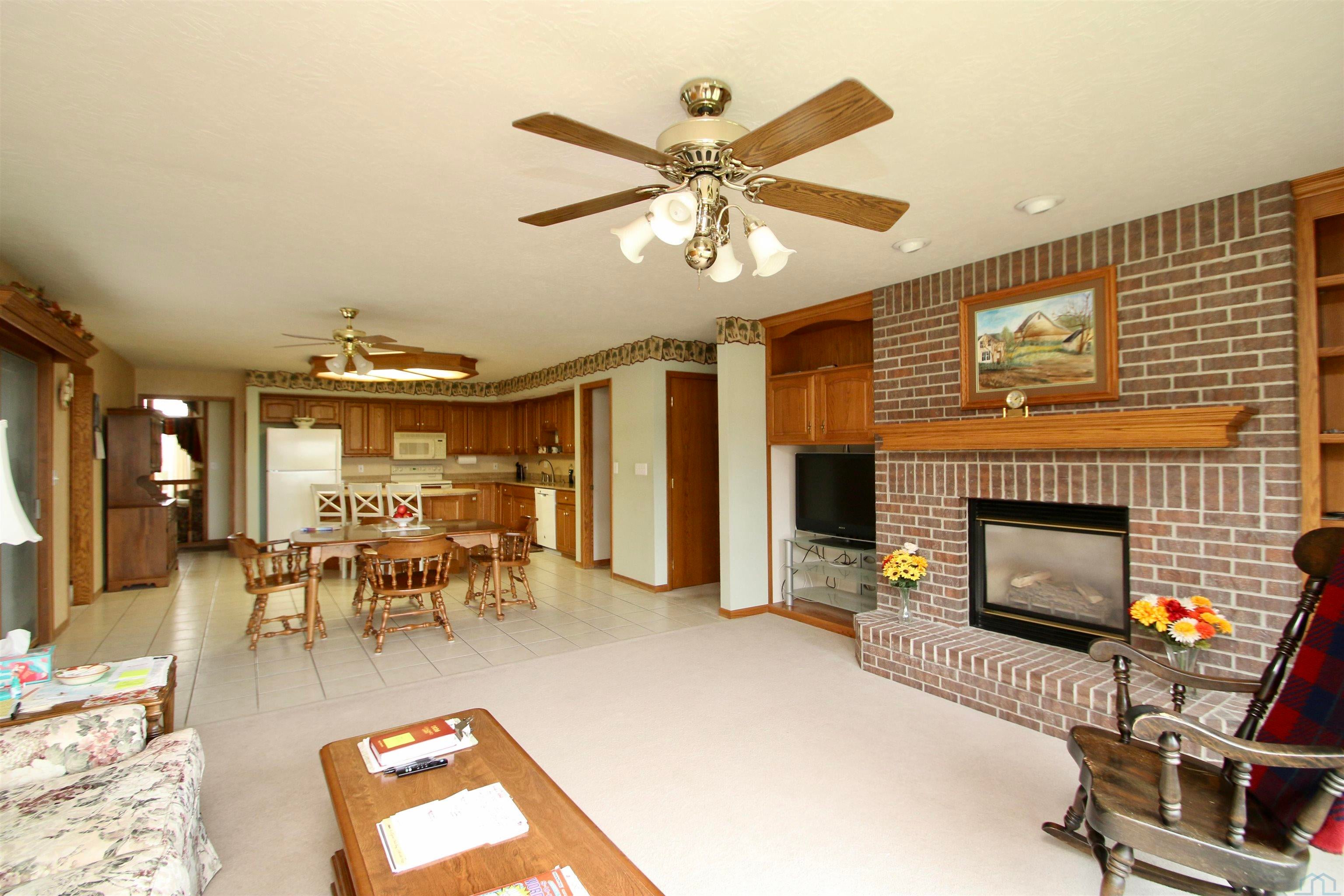 There is room for everyone in this spacious ranch home conveniently located near shopping and dining. Built by Lee Kent, this home sits on a .54-acre corner lot with mature trees and established landscaping. A welcoming first impression begins with the brick front, 3-car garage, and inviting front porch, leading into this 4-bedroom, 4-bathroom home. The entry (11x7) features wood flooring and a coat closet. A versatile room near the entry with wood flooring and crown molding offers flexible use as a formal living room, music room, office, or additional living space. The formal dining room includes a chandelier, carpet, and crown molding. The spacious eat-in kitchen features tile flooring, oak cabinets, an island, a 3x5 pantry, granite countertops, and a sliding door to the deck. Adjacent to the kitchen, the family room offers abundant natural light, a gas fireplace with brick surround, and built-ins. The home features a split-bedroom layout. The primary suite includes a carpeted bedroom with a tray ceiling, crown molding, and a sliding door to the deck. The en-suite bathroom offers tile flooring, a large double vanity, jetted tub, separate toilet and shower area, and a 6x10 walk-in closet. Two additional bedrooms include carpet, ceiling fans, and walk-in closets, with a full bathroom nearby featuring a large single vanity, tile floor, and tub/shower combination. Near the garage entry are a half bathroom and laundry area. The lower level includes a large family room with daylight windows, an additional bedroom with carpet, daylight window, and walk-in closet, a 3/4 bathroom, and a den with access to a spacious storage/mechanical area suitable for a workshop, craft, or fitness space. Updates include: water heater (2025), water softener (2025), refrigerator (2026), dishwasher (2020), shingles (2017), washer/dryer (2025), and HVAC/humidifier (2020). A radon mitigation system is in place.