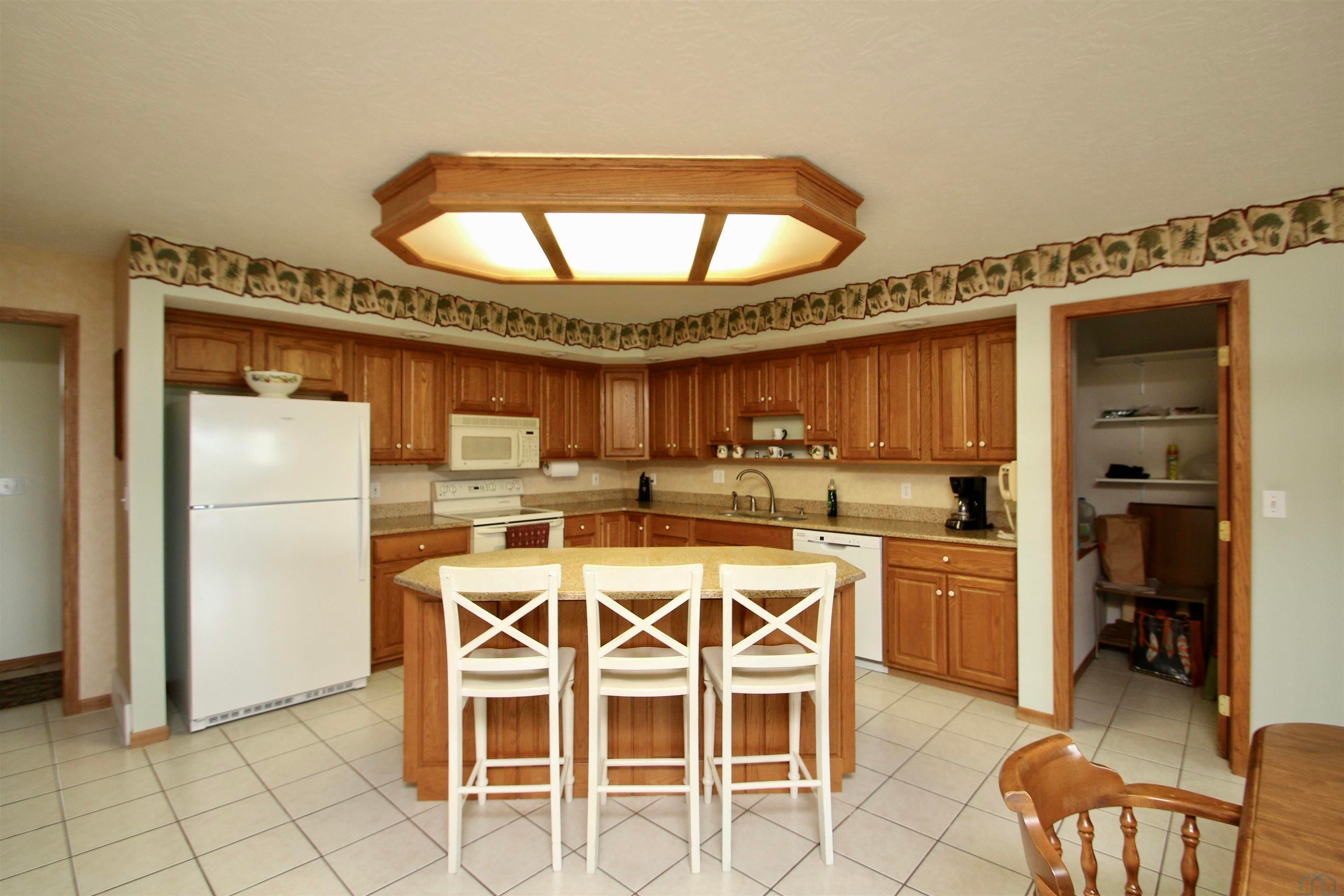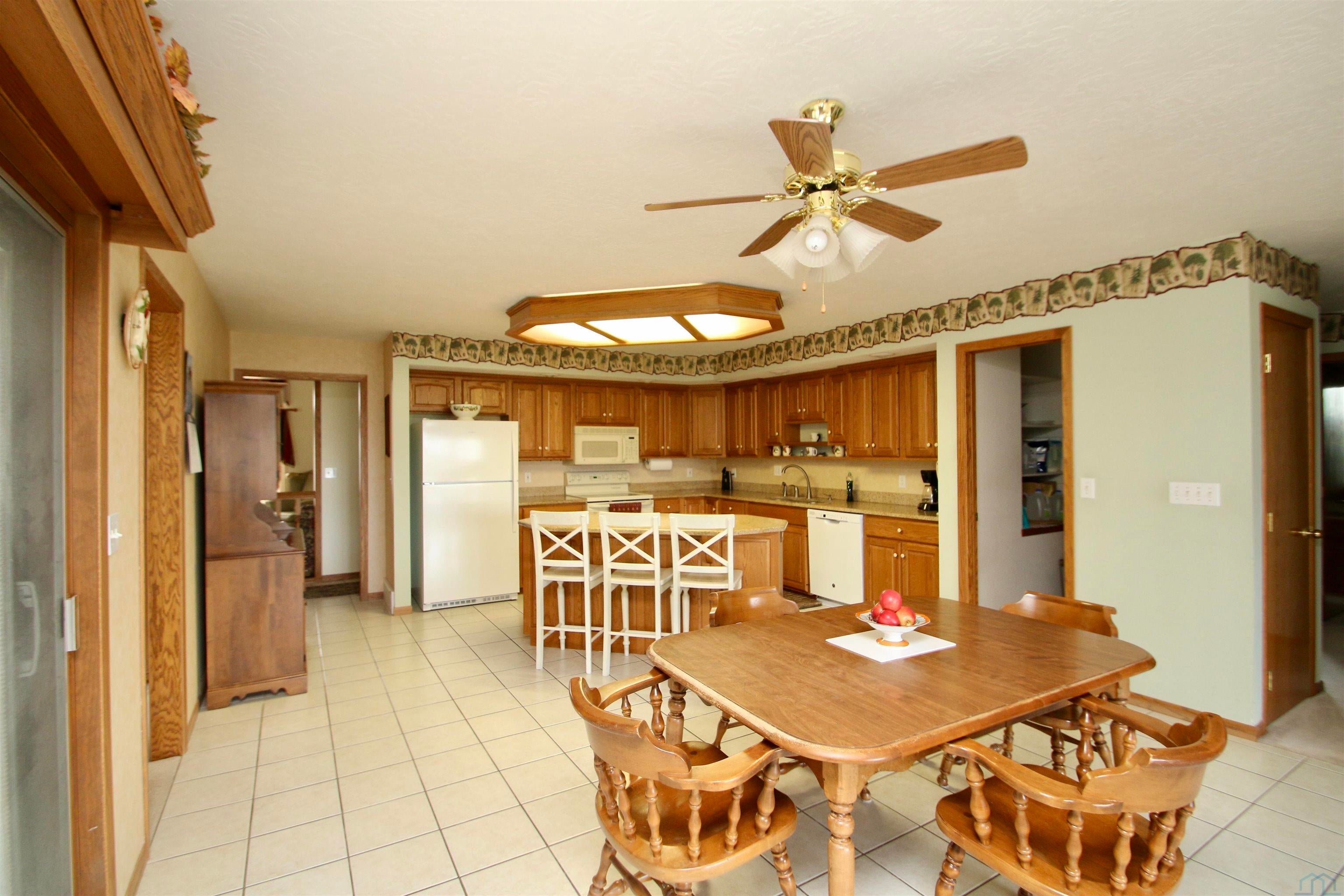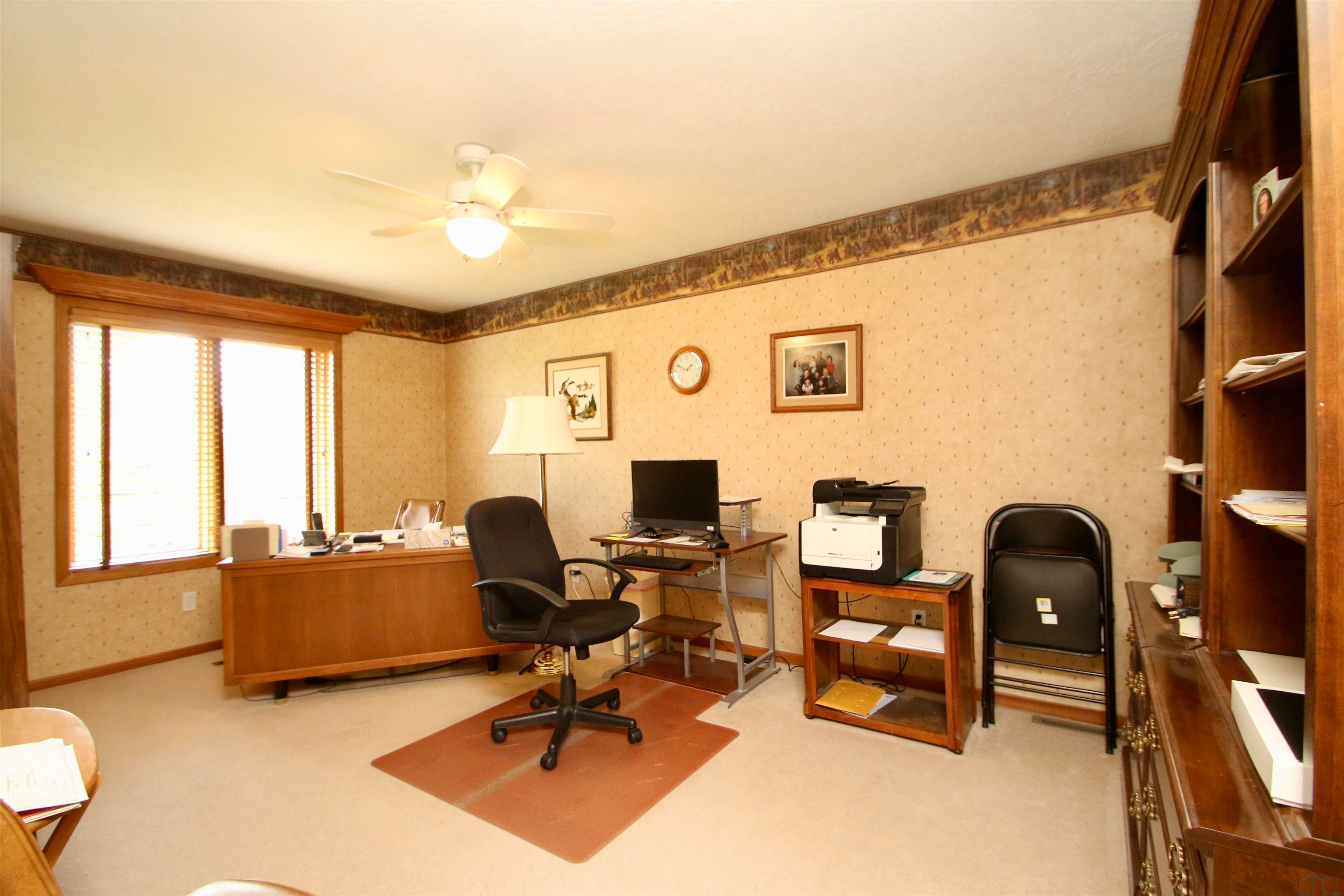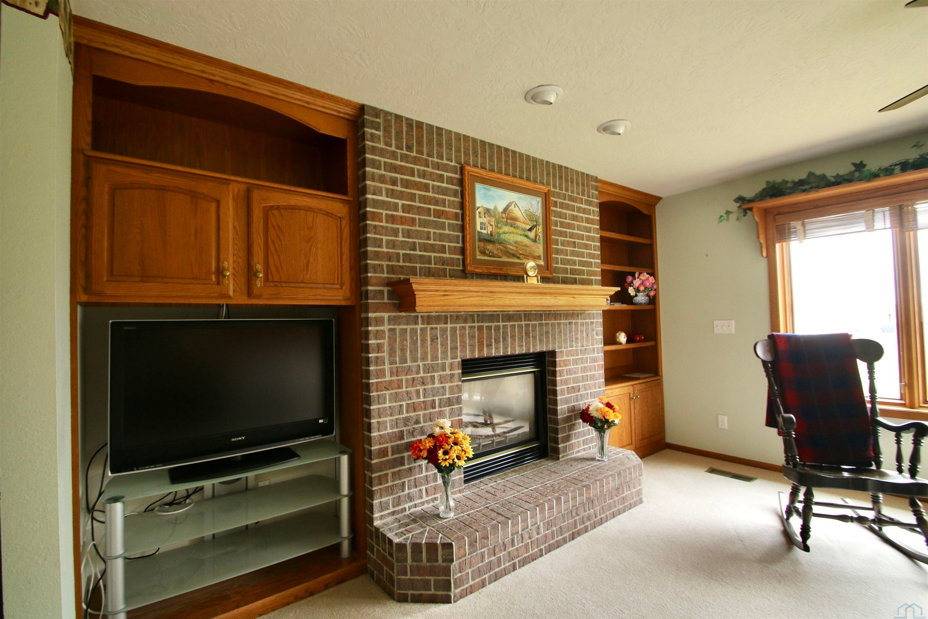 There is room for everyone in this spacious ranch home conveniently located near shopping and dining. Built by Lee Kent, this home sits on a .54-acre corner lot with mature trees and established landscaping. A welcoming first impression begins with the brick front, 3-car garage, and inviting front porch, leading into this 4-bedroom, 4-bathroom home. The entry (11x7) features wood flooring and a coat closet. A versatile room near the entry with wood flooring and crown molding offers flexible use as a formal living room, music room, office, or additional living space. The formal dining room includes a chandelier, carpet, and crown molding. The spacious eat-in kitchen features tile flooring, oak cabinets, an island, a 3x5 pantry, granite countertops, and a sliding door to the deck. Adjacent to the kitchen, the family room offers abundant natural light, a gas fireplace with brick surround, and built-ins. The home features a split-bedroom layout. The primary suite includes a carpeted bedroom with a tray ceiling, crown molding, and a sliding door to the deck. The en-suite bathroom offers tile flooring, a large double vanity, jetted tub, separate toilet and shower area, and a 6x10 walk-in closet. Two additional bedrooms include carpet, ceiling fans, and walk-in closets, with a full bathroom nearby featuring a large single vanity, tile floor, and tub/shower combination. Near the garage entry are a half bathroom and laundry area. The lower level includes a large family room with daylight windows, an additional bedroom with carpet, daylight window, and walk-in closet, a 3/4 bathroom, and a den with access to a spacious storage/mechanical area suitable for a workshop, craft, or fitness space. Updates include: water heater (2025), water softener (2025), refrigerator (2026), dishwasher (2020), shingles (2017), washer/dryer (2025), and HVAC/humidifier (2020). A radon mitigation system is in place.