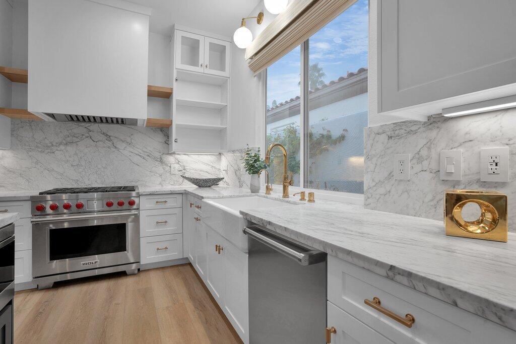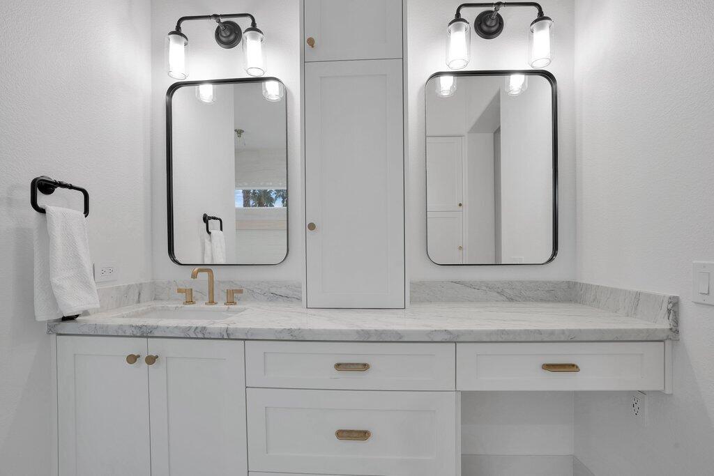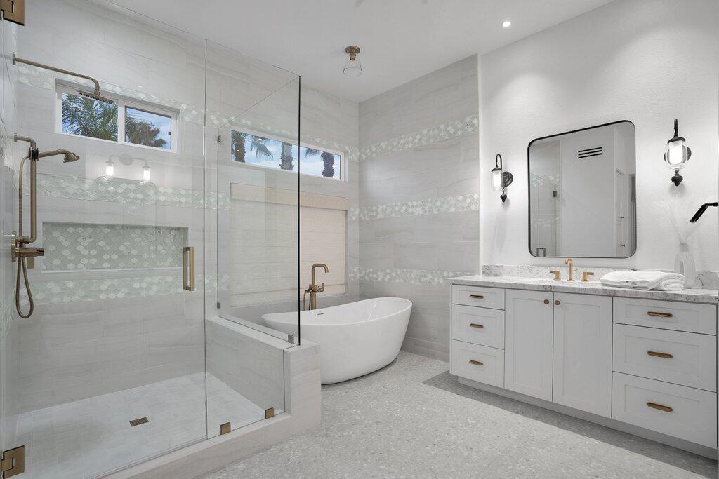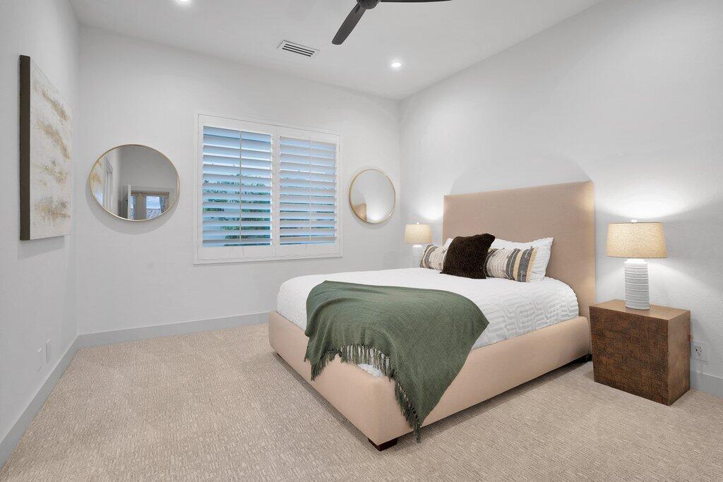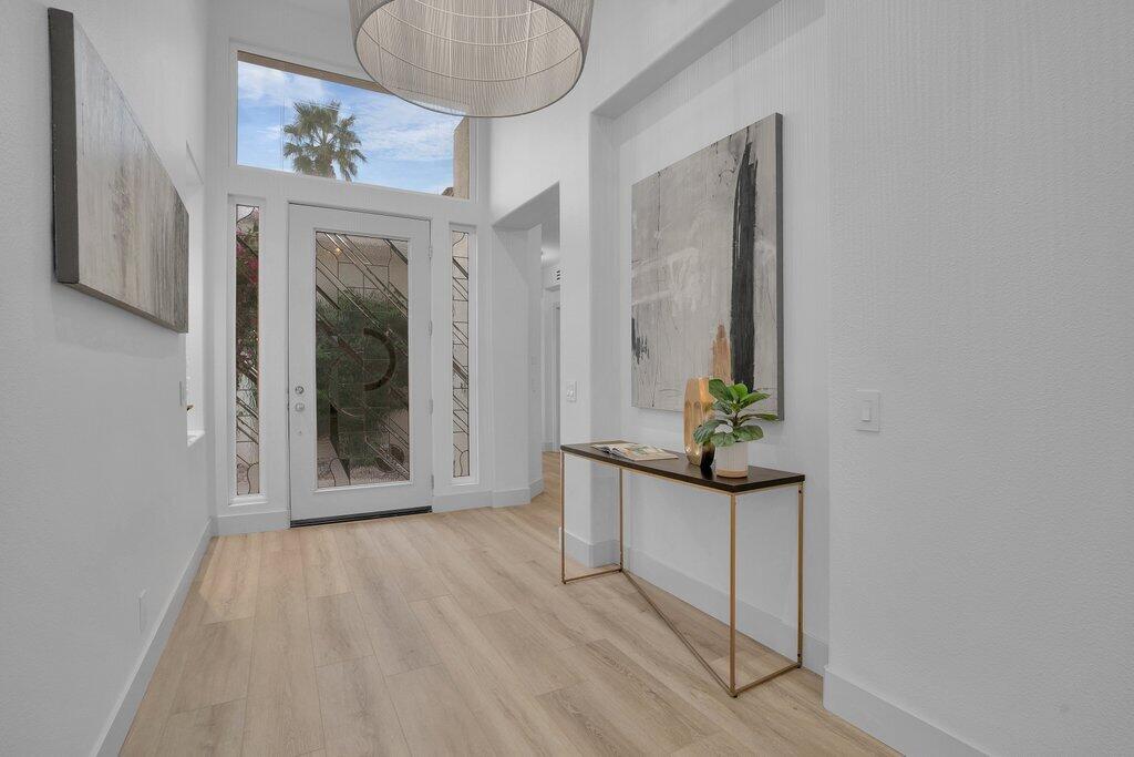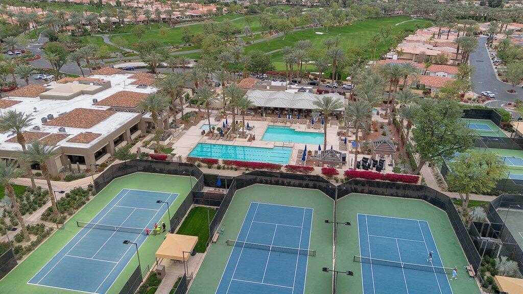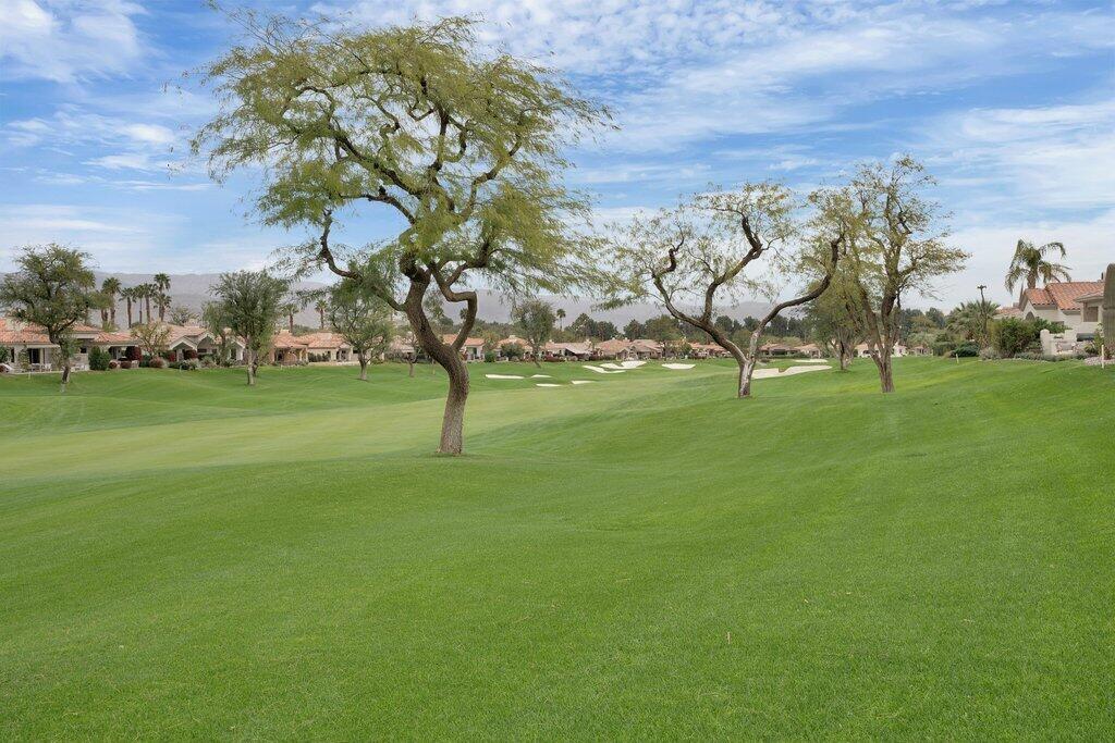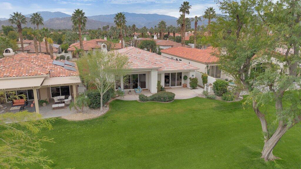 Located on the fairway at Indian Ridge Country Club this highly desired Bougainvillea 2 floor plan home offers an open floor plan with 3 ensuite bedrooms and a powder room. Fully paid solar with backup battery for when the power goes out. Entry through a private enclosed courtyard that leads you to a welcoming foyer with elegant chandeliers. This fully remodeled residence features a formal living room and a separate family room, both with fireplaces. The family room includes a built-in bar and opens to golf course and mountain views. An adjacent office or den provides flexible living space that opens up into the front courtyard.The gourmet kitchen is designed for both function and style, featuring marble countertops, a fully built-out pantry, and premium appliance including Wolf gas stove top, subzero refrigerator, and under counter microwave. Electric window blinds are installed throughout the home for added comfort and convenience!The large primary suite has a custom built-in closet, and a spa-like bathroom with dual vanities for him and her and makeup area, a standalone Jacuzzi tub and rain shower. Two additional guest bedrooms are generously sized, each with its own ensuite bathroom with beautiful, remodeled bathrooms. Additional highlights include a laundry room with washer, dryer, and sink, a two-car garage with golf cart garage and a patio overlooking the fairway with mountain views, ideal for outdoor entertainment! No details have been missed in this home! Social membership included. Indian Ridge Country Club residents enjoy access to championship golf courses, tennis and pickleball courts, fitness center, pools, dining, and a full calendar of social activities. Call for a showring today!