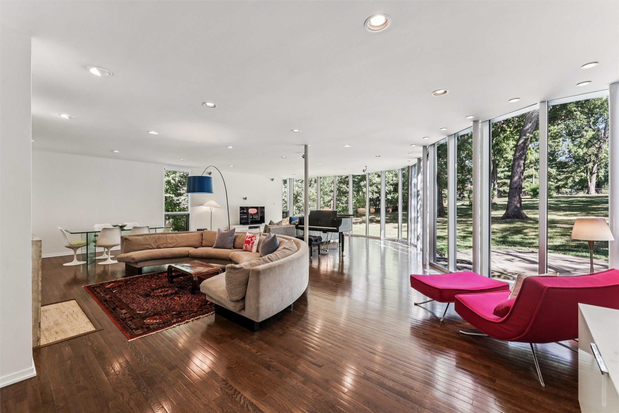 Rare find. International/Moderne architectural gem that was The Des Moines Register front page news in 1935. Spacious private lot, mature trees, picturesque views. Well-maintained gorgeous floor-to-ceiling glass, hardwood floors, modern amenities. Enter a glass door to a long foyer with views & storage or welcome guests to a central foyer.