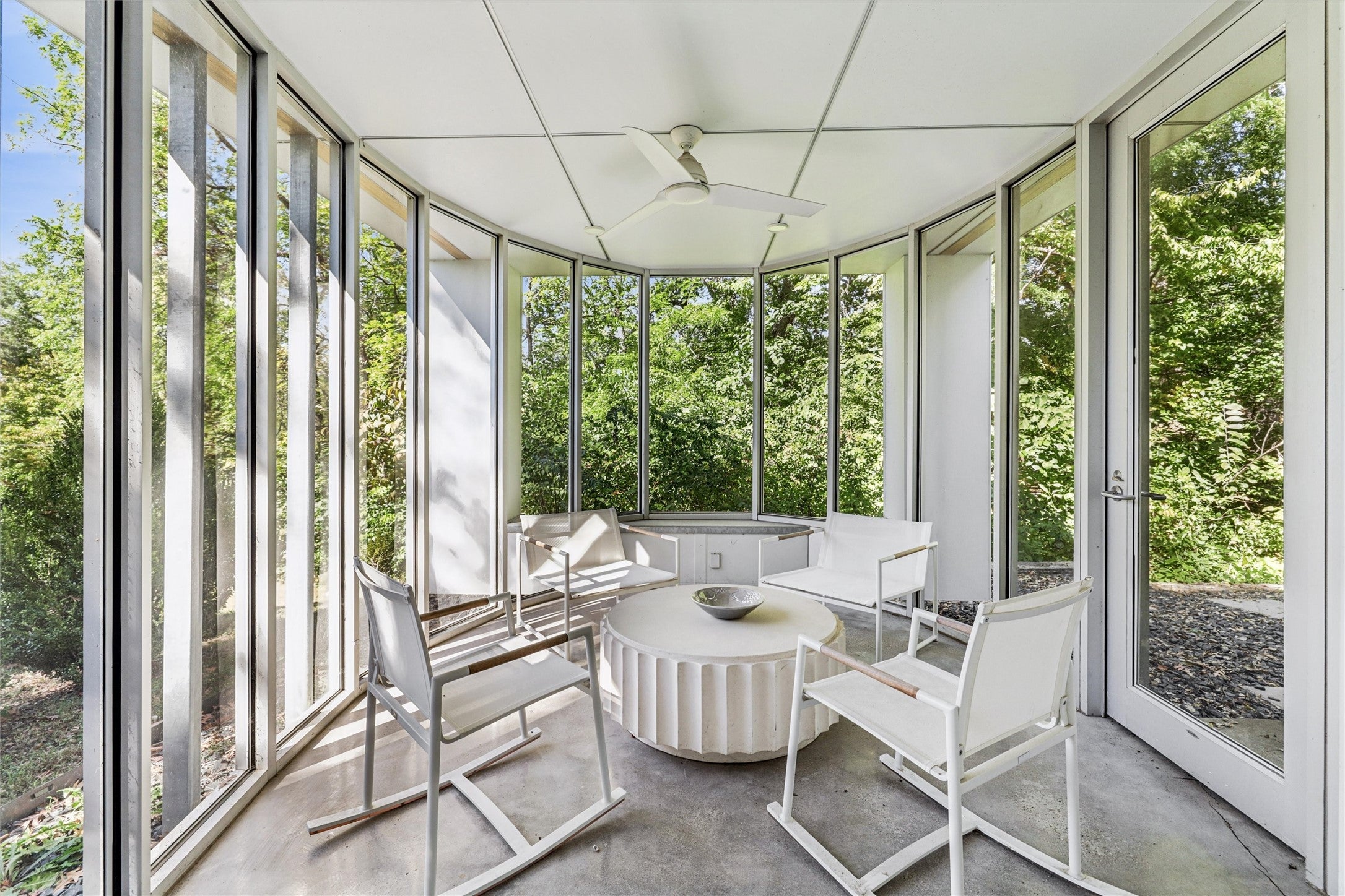 Rare find. International/Moderne architectural gem that was The Des Moines Register front page news in 1935. Spacious private lot, mature trees, picturesque views. Well-maintained gorgeous floor-to-ceiling glass, hardwood floors, modern amenities. Enter a glass door to a long foyer with views & storage or welcome guests to a central foyer. Grand living room features curved wall of glass, fireplace, 2 seating areas & dining area. Sunshine glasswall breakfast area with heated floor opens to a beautiful enclosed screen porch. Commercial kitchen has large SubZero fridge/freezer, dual wall ovens, gas cooktop, commercial vent & bath. Main floor includes cozy library with hand carved woodwork, 2nd fireplace, bedroom/office with views & powder room ( bath). 2nd story features five bedrooms. Main stairwell leads to a large landing. Primary suite boasts office, dressing area, bedroom overlooking backyard, walkout private glass balustrade terrace.En-suite has marble heated-tile floor, double shower, tub, dual floating vanity, floating toilet. 2nd floor also has 3 spacious bedrooms with views, bath, laundry room. A glass-walled back stairwell leads to guest wing large 6th bedroom with sunrise/sunset views, 3/4 bath. Basement features rec/game room, storage & 2nd laundry room. Backyard has excellent potential for pool/poolhouse & charming barn that could become an art studio.Other features: tri-zone HVAC, large water heater, 2nd detached garage, electric shades, loads of green space.