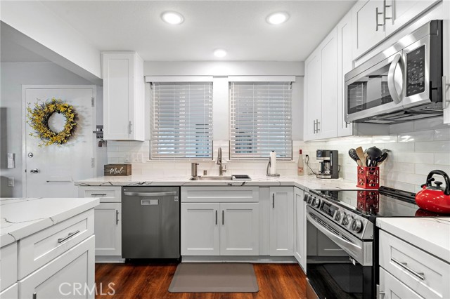 Beautifully remodeled end-unit Majorca in a prime greenbelt location offering privacy, natural light, and modern comfort. This thoughtfully upgraded 2-bedroom, 2-bath home features a rare in-unit washer and dryer and a highly desirable open layout. The home is enhanced with a recently installed energy-efficient mini-split system in every room, providing quiet, customizable heating and cooling year-round --- an exceptional feature not commonly found in similar homes. Enjoy peaceful greenbelt views from your living space and the added privacy that comes with an end-unit location. The interior offers updated finishes, a bright and airy feel, and a move-in ready experience. Ideally situated within the vibrant 55 community of Laguna Woods, residents enjoy resort-style amenities including golf, pools, fitness center, social clubs, and more.A standout value for a fully upgraded Majorca----don't miss this opportunity. SOME OF THE MANY FEATURES INCLUDE: REMODELED KITCHEN - OPEN FLOOR PLAN - KITCHEN ISLAND - QUARTZ COUNTER TOPS - WHITE CABINETS - STAINLESS HIGH END APPLIANCES - MINI SPLIT A/C and HEATING SYSTEM WITH 3 UNITS - WOOD LOOK FLOORING - NO STAIRS - NO STEPS - INSIDE LAUNDRY - SMOOTH CEILINGS - DOUBLE PANE WINDOWS - REMODELED PRIMARY BATHROOM. This home is conveniently located close to Clubhouse 1 and Gate 1. Laguna Woods is one of the most prestigious age 55 and over communities in the US. In Laguna Woods you have access to: bus system around the community & to area shopping, restaurants, medical facilities; 5 pools & 4 hot tubs; golf, tennis, library, 7 clubhouse, a multitude of clubs, 3 fitness centers, theater, horse back riding/stables, garden centers, pickle ball, basketball, card rooms, billiards, bocce ball & more!