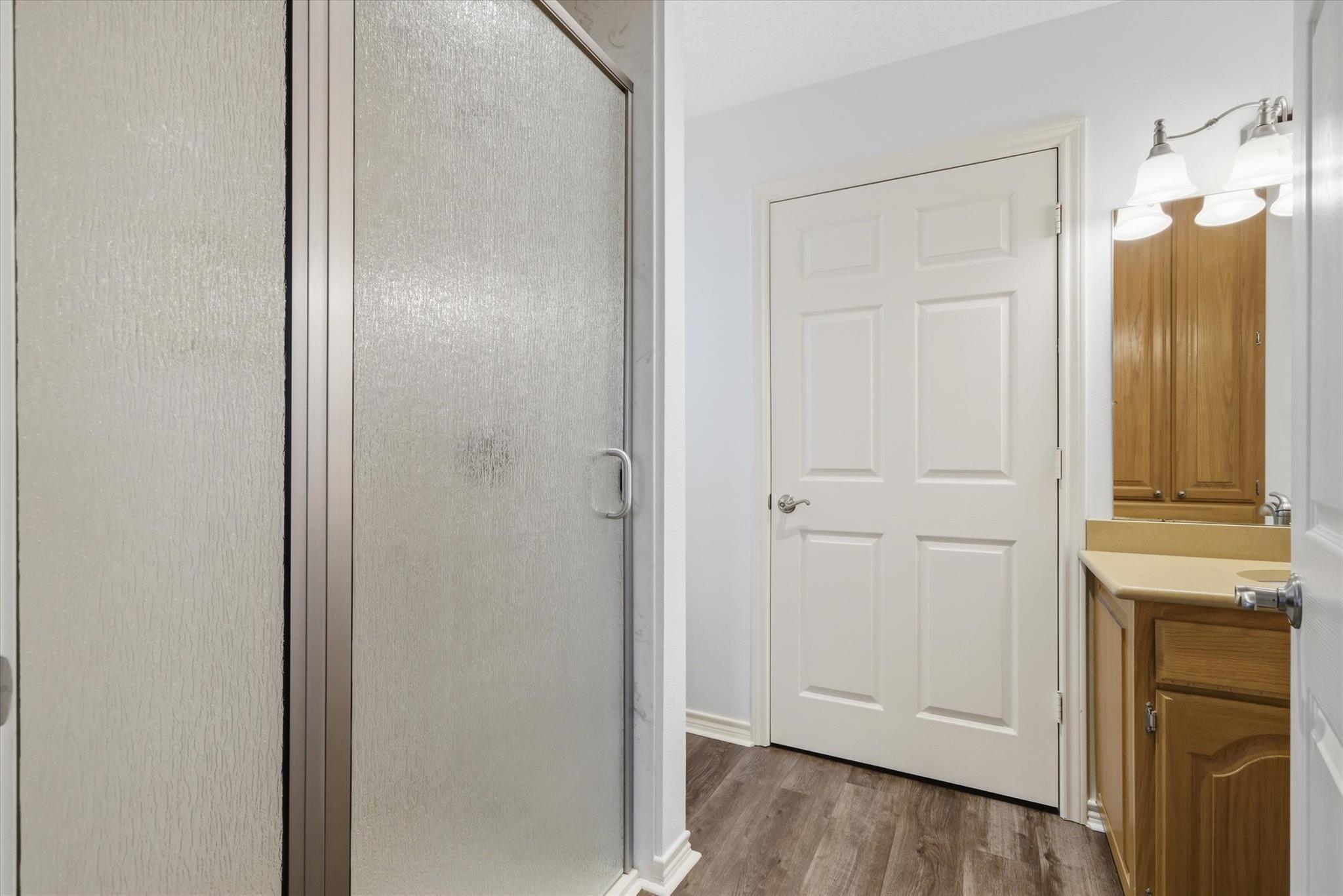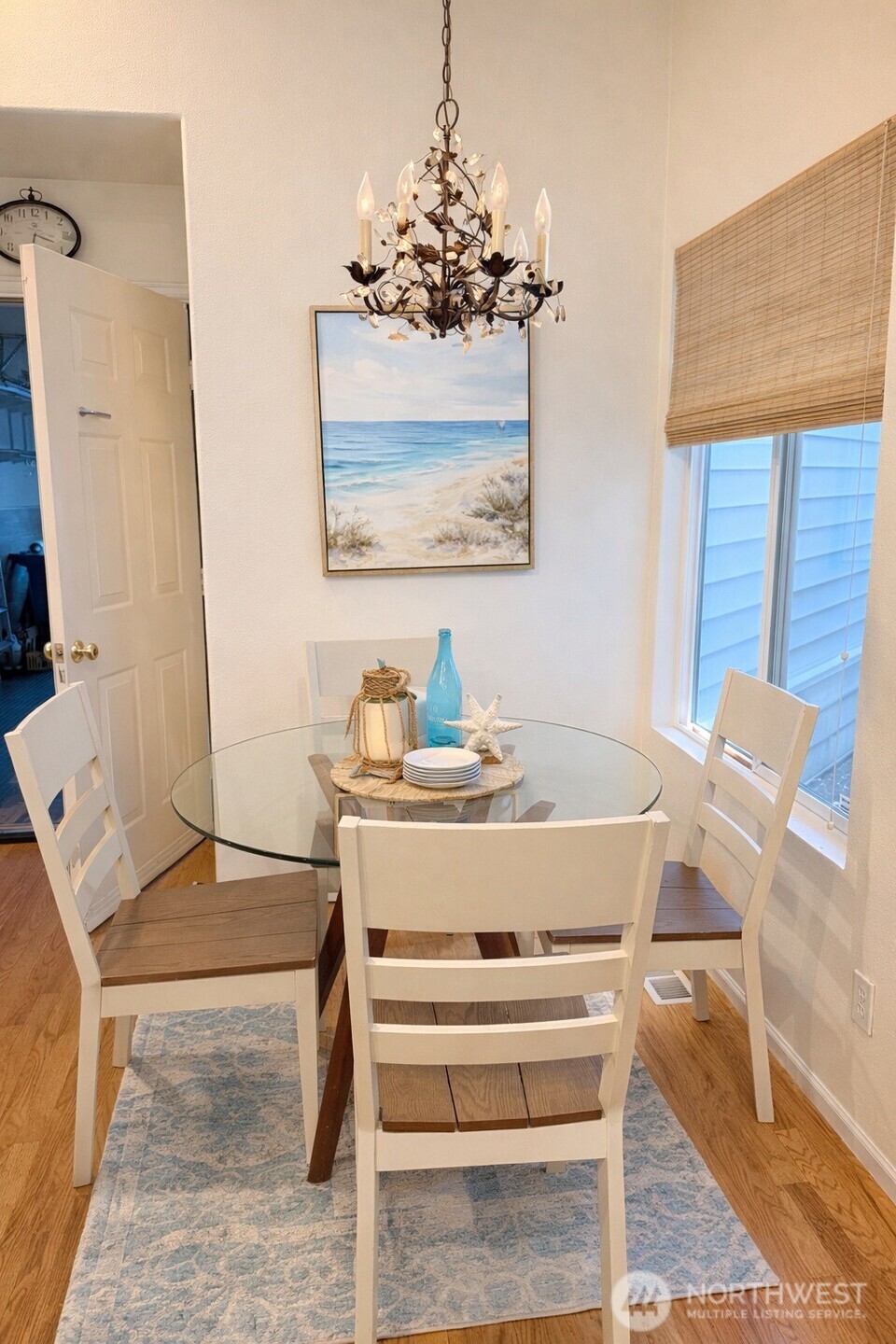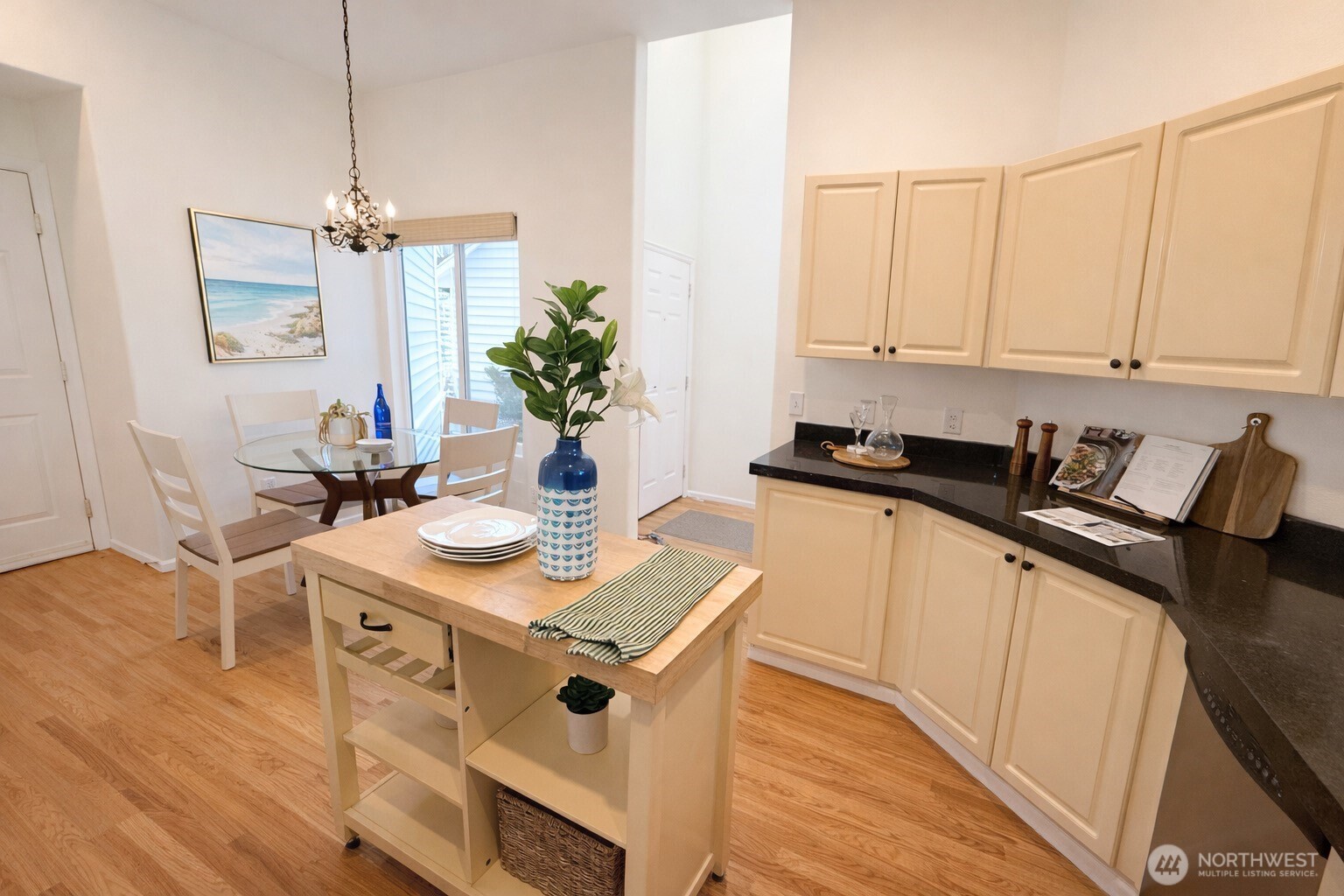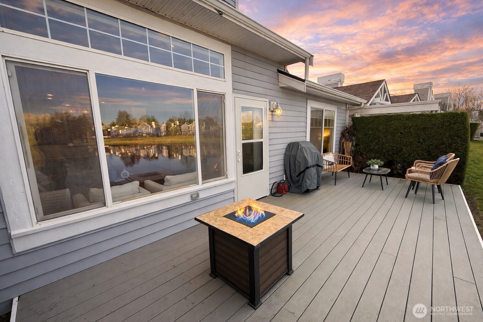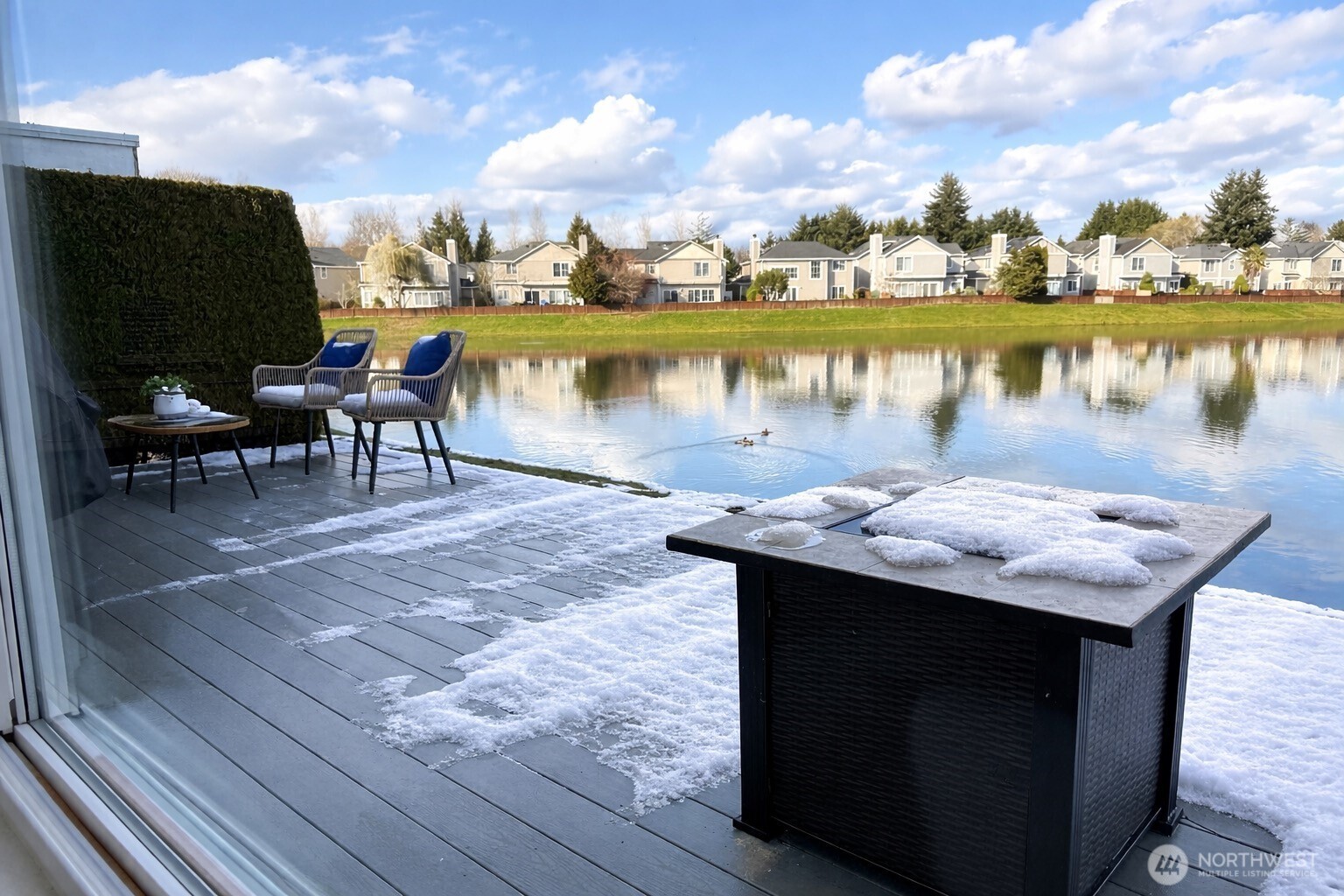Welcome to the prestigious gated community of Marina Pointe at The Lakes, where privacy, natural beauty, and refined comfort come together. This impeccably maintained single-level home offers elegant lakeside living with soaring vaulted ceilings and freshly polished hardwood floors. A large picture window in the living room frames beautiful views of Ruby Lake, filling the space with natural light. The living room features a gas fireplace, creating a warm and inviting focal point, while a spacious private deck just off the main living area provides the perfect place to relax and enjoy peaceful waterfront scenery. The kitchen blends style and function with crushed-glass countertops, abundant cabinetry, and a breakfast nook overlooking the water. A removable butcher block prep station adds flexible workspace for cooking and entertaining. The primary suite offers a tranquil retreat with lake views, a cozy electric fireplace, a cedar-lined walk-in closet, and a spa-like feel. Additional highlights include newly cleaned carpeting, a newer furnace, and central A/C. The insulated garage offers protected parking along with flexible space for storage, hobbies, or a home gym, plus additional storage throughout. Conveniently located near golf courses, scenic walking and biking trails, freeway access, and the newly expanded light rail system.