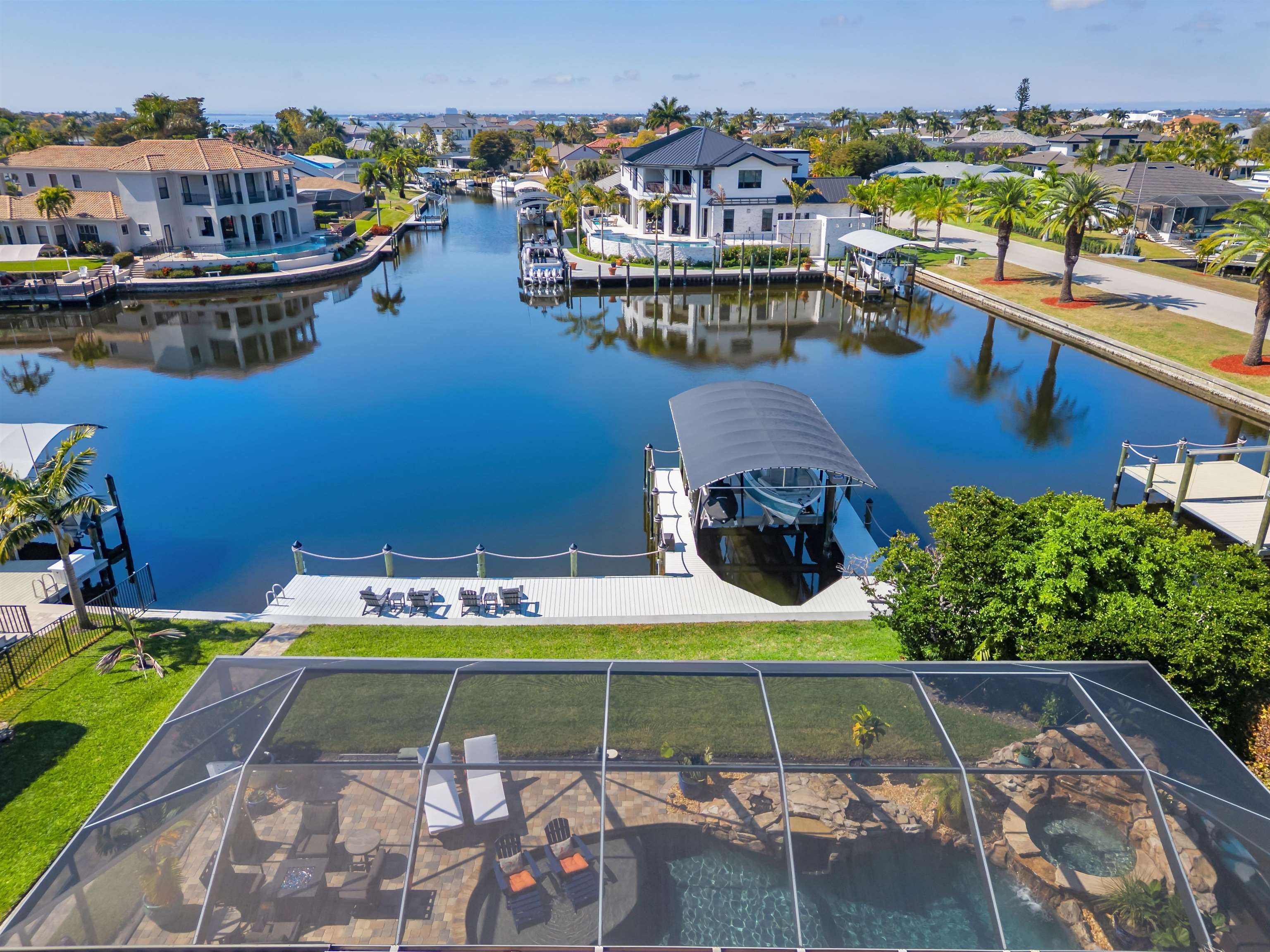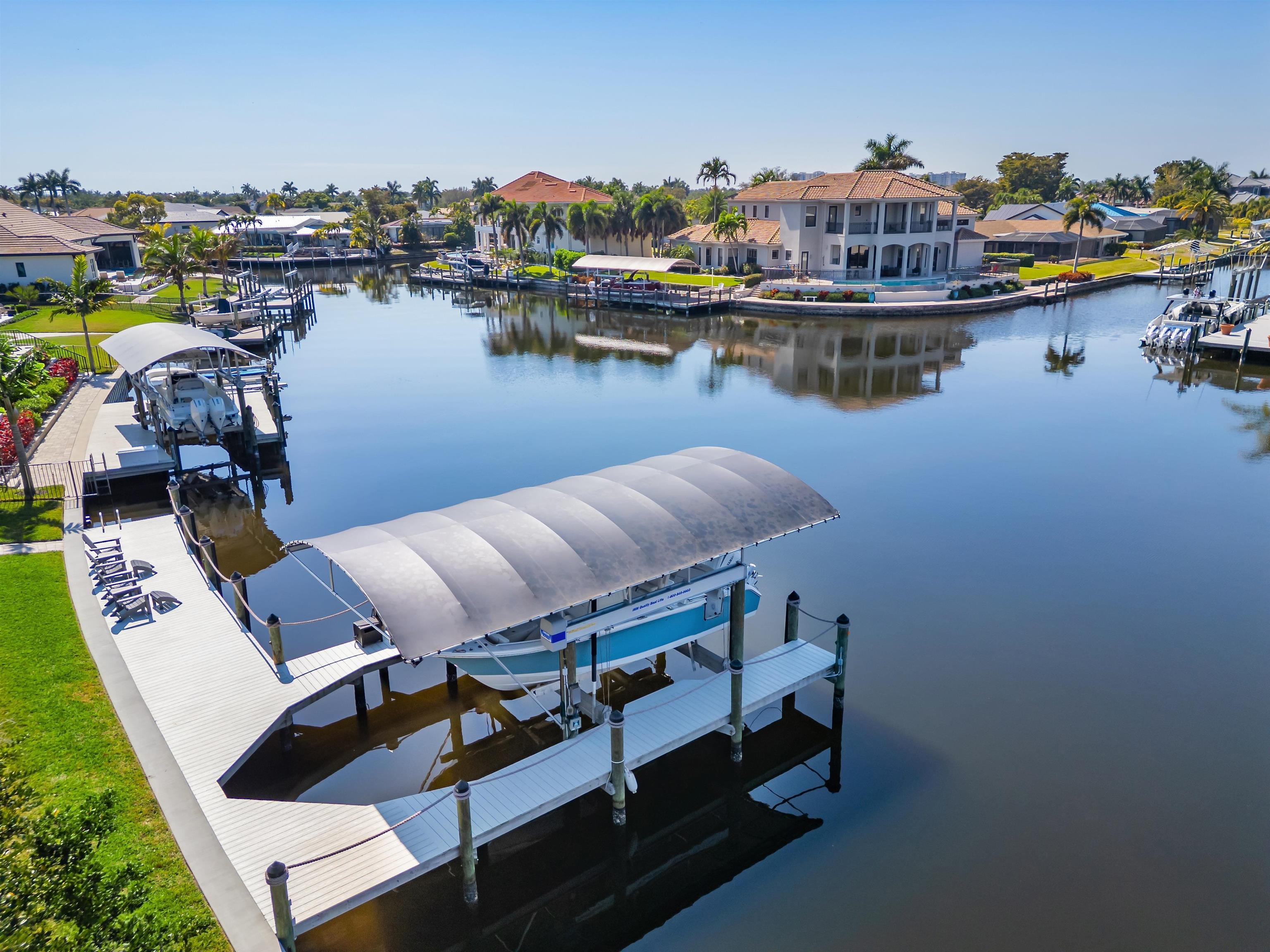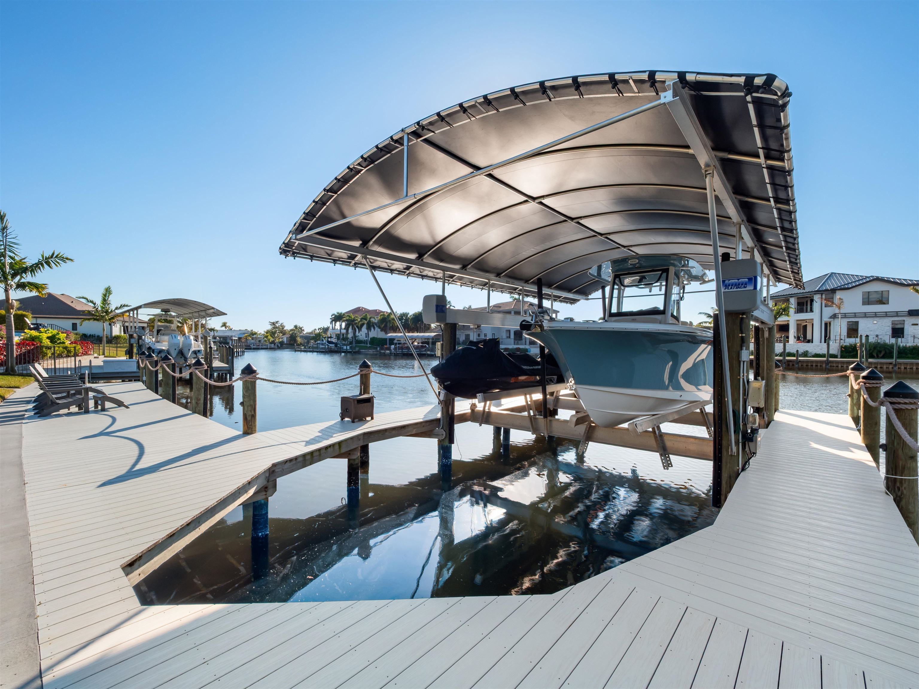 A rare waterfront offering defined by expansive canal basin views, and effortless Gulf access in under five minutes, this home delivers the ultimate Big-boating lifestyle. Set on a quiet cul-de-sac with Western rear exposure, this residence captures stunning ye ar-round sunsets and an ever-changing canvas of wide-water scenery that immediately sets it apart from typical canal homes. Spanning nearly 2,700 square feet, the 4-bedroom, 3-bath den layout is bright, open, and designed for easy living and entertaining. The indoor-outdoor connection is seamless, flowing to an oversized picture-screen lanai, heated pool and spa, and a newly constructed seawall and 700sf /- dock with composite decking and a covered 20,000-lb lift and room for docking additional boats and perfect for additional living/entertaining space. A circular paver driveway, impact windows and doors, and a buried 500-gallon propane tank add both curb appeal and practicality. Inside, the home was completely re-imagined in 2021 with a focus on clean lines, modern finishes, and long-term peace of mind. The Showpiece Kitchen features waterfall quartz countertops, high-end Café appliances, Gas cooking and designer fixtures. Bathrooms were tastefully updated, the primary suite includes an expansive walk-in closet, and major behind-the-walls improvements, including full re-plumbing and a complete electrical rewire with new panel, elevate the home beyond cosmetic upgrades. A newer tile roof further reinforces durability. Located within the highly regarded deep-water boating community of Town & River, this property blends refined interior upgrades with an exceptional waterfront position, creating a home that lives as beautifully as it performs for those seeking premier Southwest Florida coastal living.