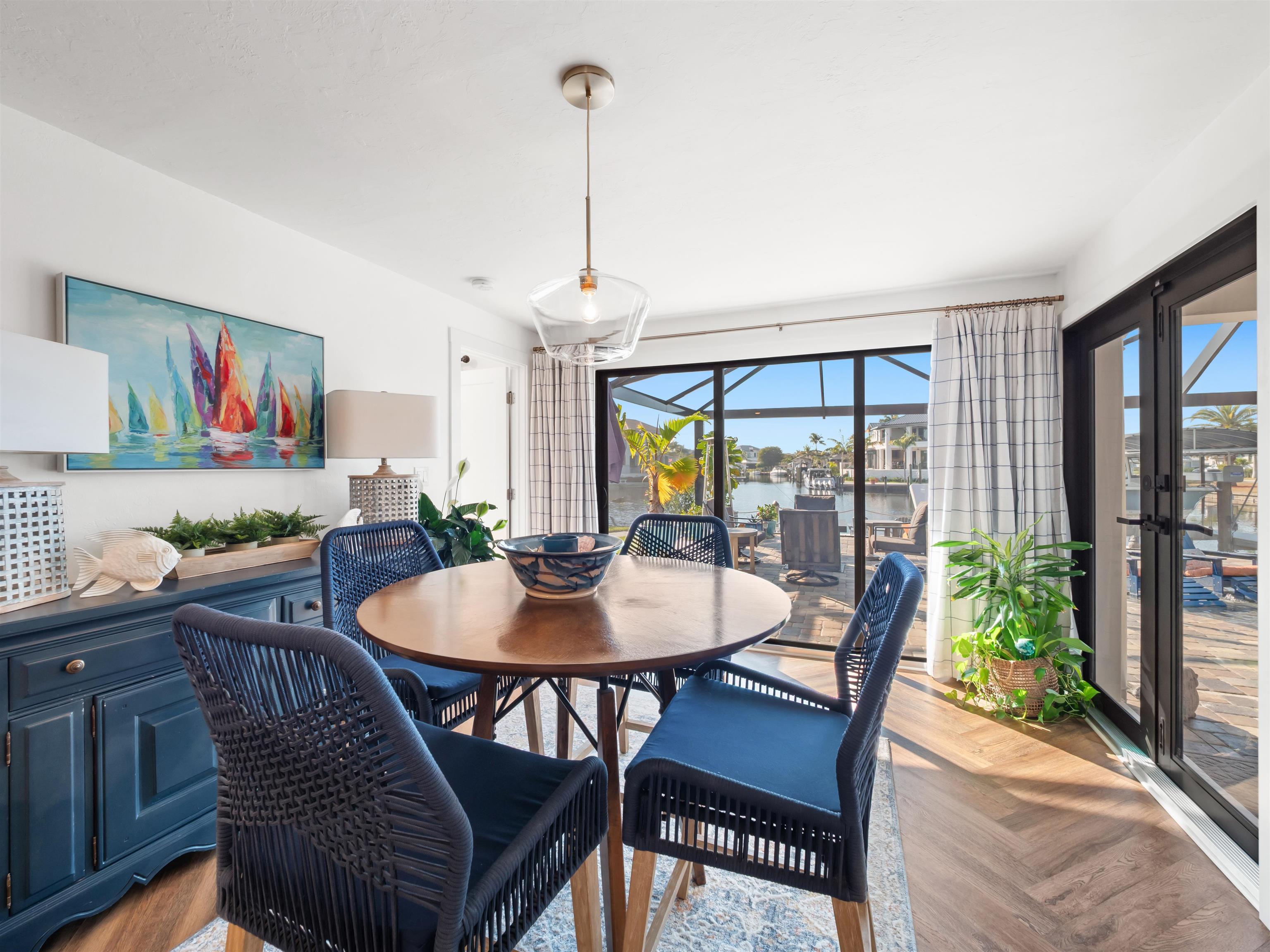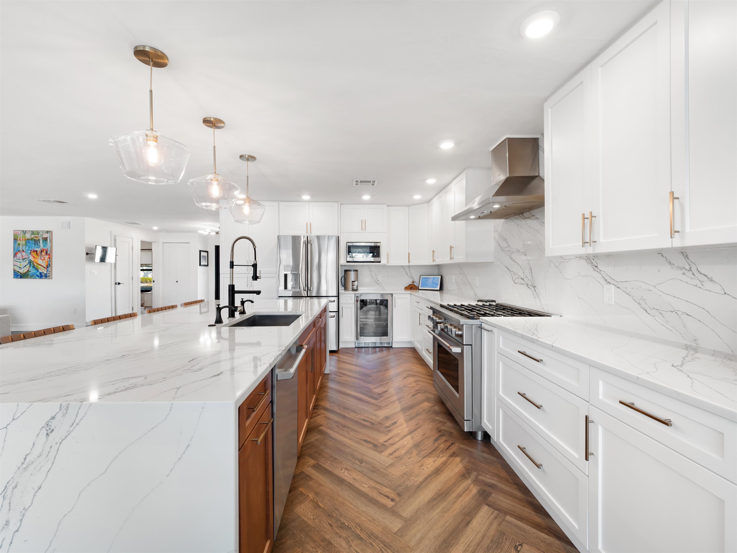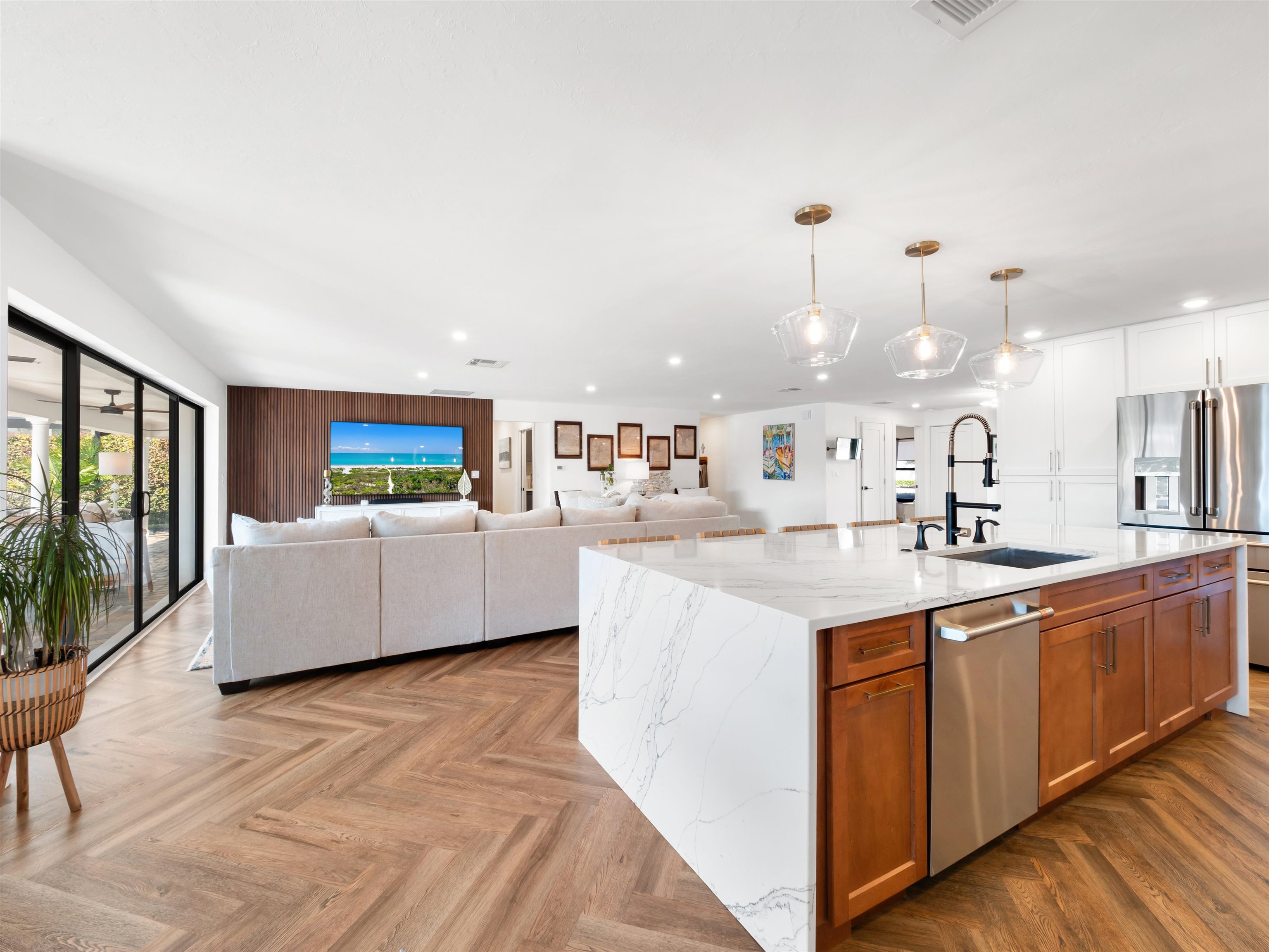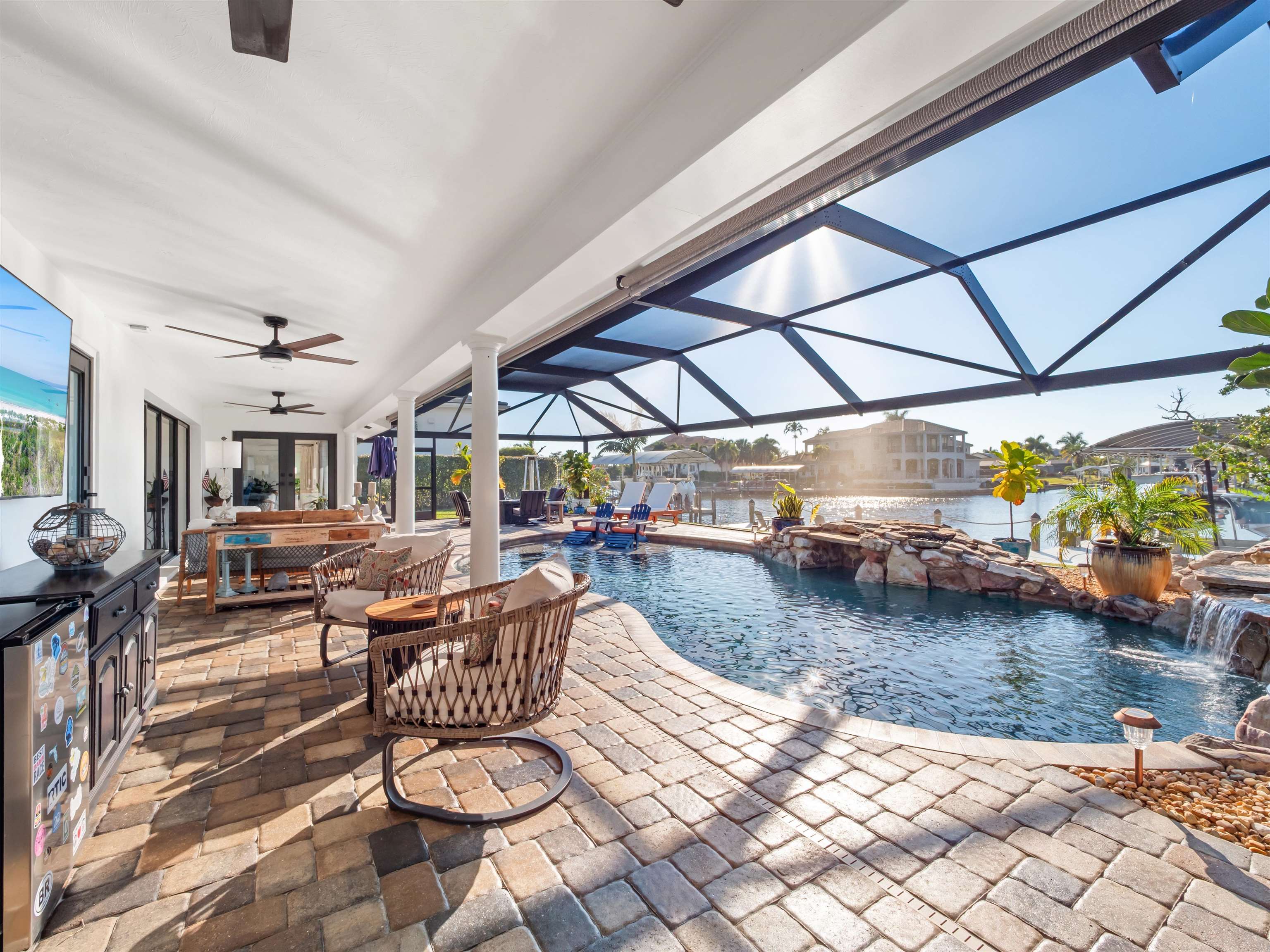 A rare waterfront offering defined by expansive canal basin views, and effortless Gulf access in under five minutes, this home delivers the ultimate Big-boating lifestyle. Set on a quiet cul-de-sac with Western rear exposure, this residence captures stunning ye ar-round sunsets and an ever-changing canvas of wide-water scenery that immediately sets it apart from typical canal homes. Spanning nearly 2,700 square feet, the 4-bedroom, 3-bath den layout is bright, open, and designed for easy living and entertaining. The indoor-outdoor connection is seamless, flowing to an oversized picture-screen lanai, heated pool and spa, and a newly constructed seawall and 700sf /- dock with composite decking and a covered 20,000-lb lift and room for docking additional boats and perfect for additional living/entertaining space. A circular paver driveway, impact windows and doors, and a buried 500-gallon propane tank add both curb appeal and practicality. Inside, the home was completely re-imagined in 2021 with a focus on clean lines, modern finishes, and long-term peace of mind. The Showpiece Kitchen features waterfall quartz countertops, high-end Café appliances, Gas cooking and designer fixtures. Bathrooms were tastefully updated, the primary suite includes an expansive walk-in closet, and major behind-the-walls improvements, including full re-plumbing and a complete electrical rewire with new panel, elevate the home beyond cosmetic upgrades. A newer tile roof further reinforces durability. Located within the highly regarded deep-water boating community of Town & River, this property blends refined interior upgrades with an exceptional waterfront position, creating a home that lives as beautifully as it performs for those seeking premier Southwest Florida coastal living.