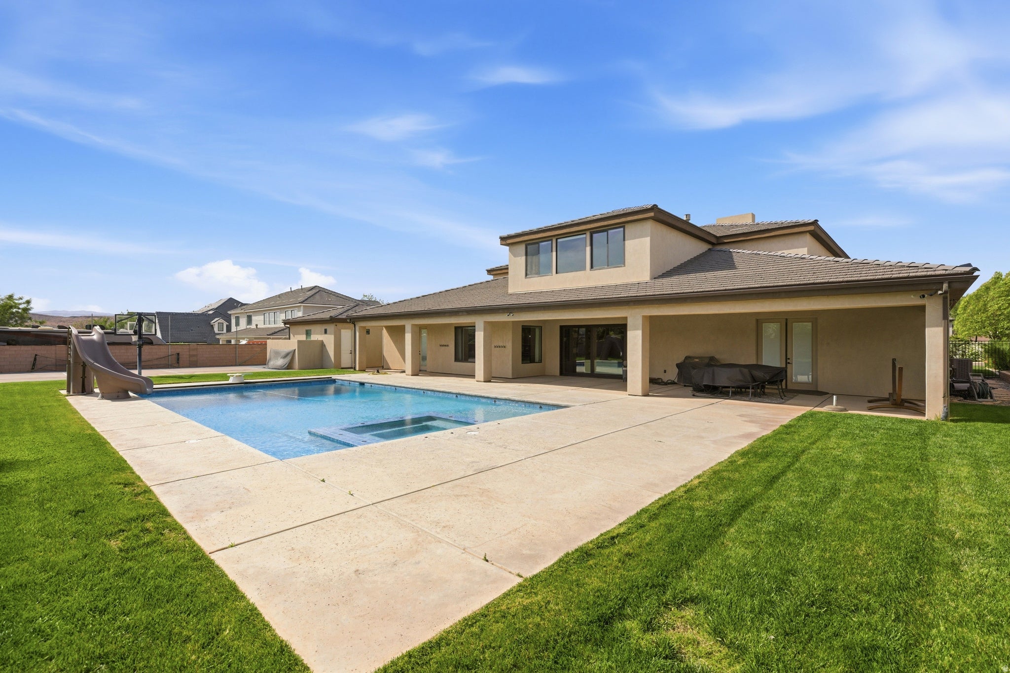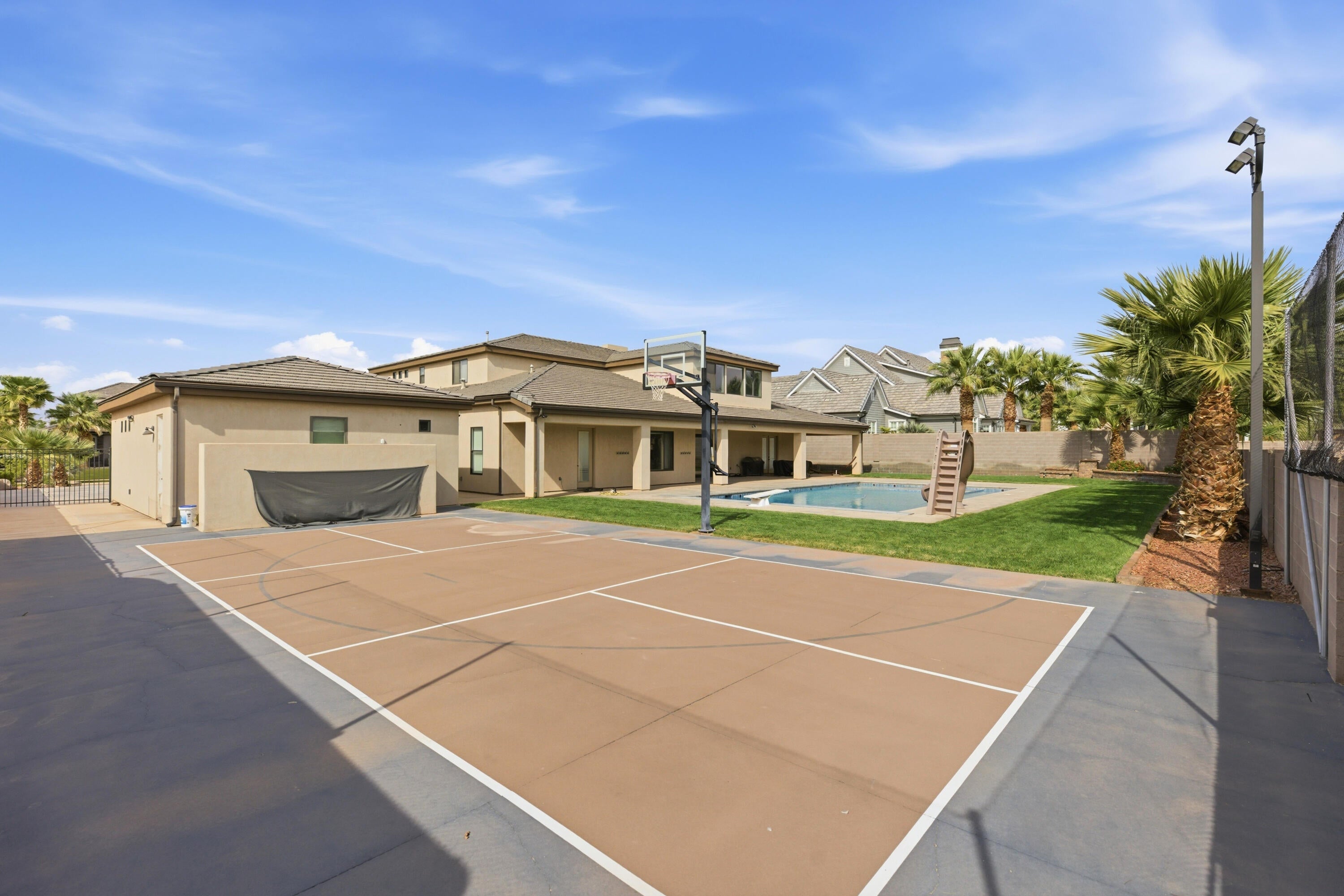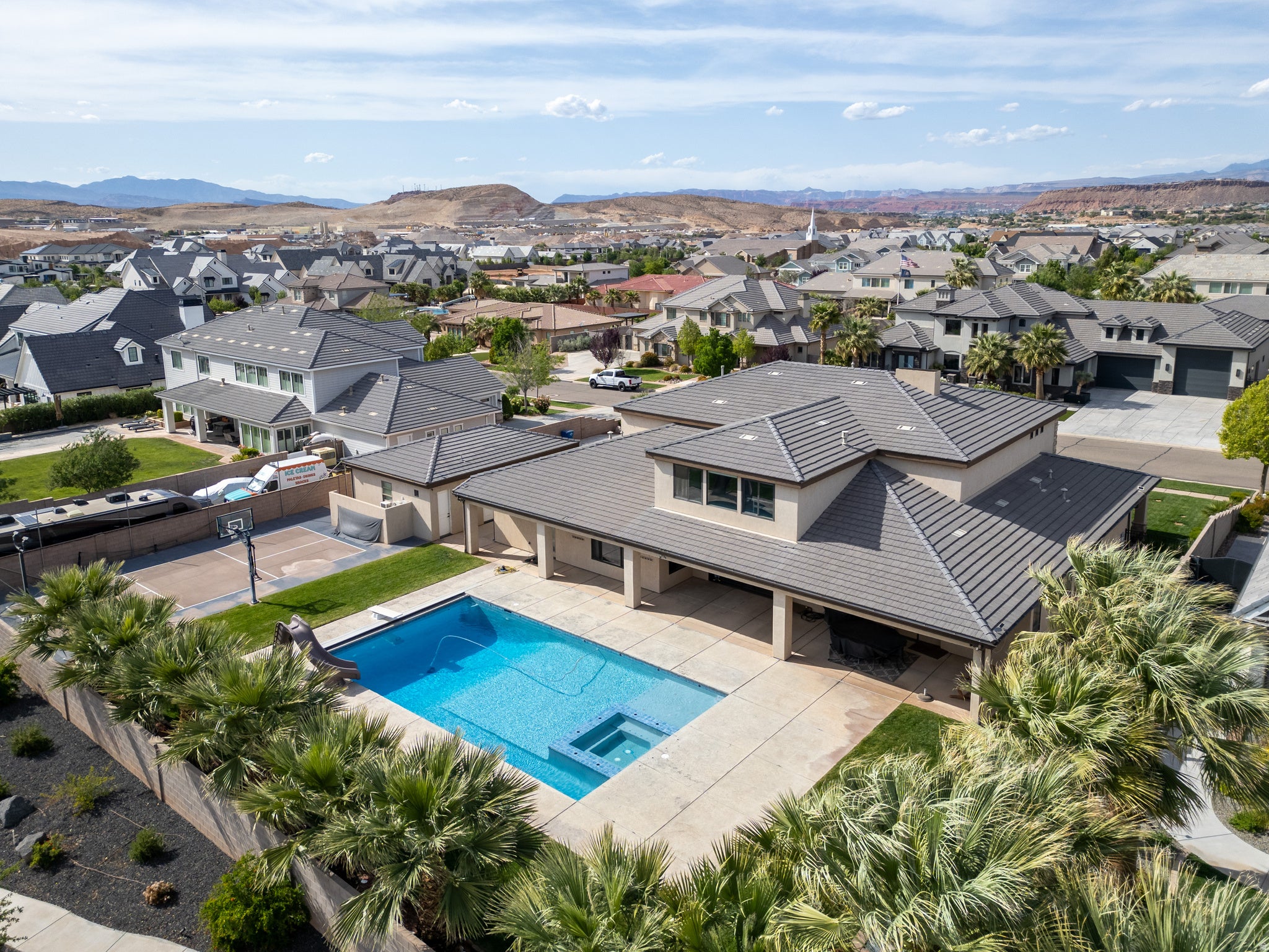 Experience luxury living at its finest in this masterfully designed estate located in the highly sought-after Little Valley community. Set on a premier half-acre lot and offering over 6,100 square feet, this home has been lightly lived in and thoughtfully crafted for both everyday comfort and elevated entertaining. Exceptional curb appeal welcomes you with a spacious driveway, detached garage, and beautifully manicured grounds. Inside, expansive living spaces are filled with natural light, rich wood flooring, and a seamless open-concept layout. The gourmet kitchen serves as the heart of the home, featuring an oversized island with seating, high-end cabinetry, designer lighting, a large walk-in pantry, reverse osmosis system, and premium finishes, all flowing into a stunning great room with custom built-ins and a statement fireplace. The home offers six spacious bedrooms and five bathrooms, including two luxurious primary suites ideal for multi-generational living or hosting guests. The main primary retreat features a spa-like bath with soaking tub, an oversized walk-in closet, and private laundry hookups for added convenience. Additional highlights include a well-designed entry, mud room, full laundry room, upstairs bathroom, a half bath on the main level, and a versatile bunkroom with built-in closet space. Step outside to your own private resort, where the backyard has been transformed into an entertainers dream. Enjoy one of the largest private pools in Little Valley, a covered patio for year-round gatherings, a dedicated outdoor pool bathroom, and a private pickleball court. The detached garage offers incredible flexibility with room for additional vehicles, toys, or a workshop, while the expansive six-car capacity ensures ample storage. This exceptional property delivers the ultimate blend of luxury, functionality, and resort-style living in one of Southern Utahs most desirable neighborhoods.