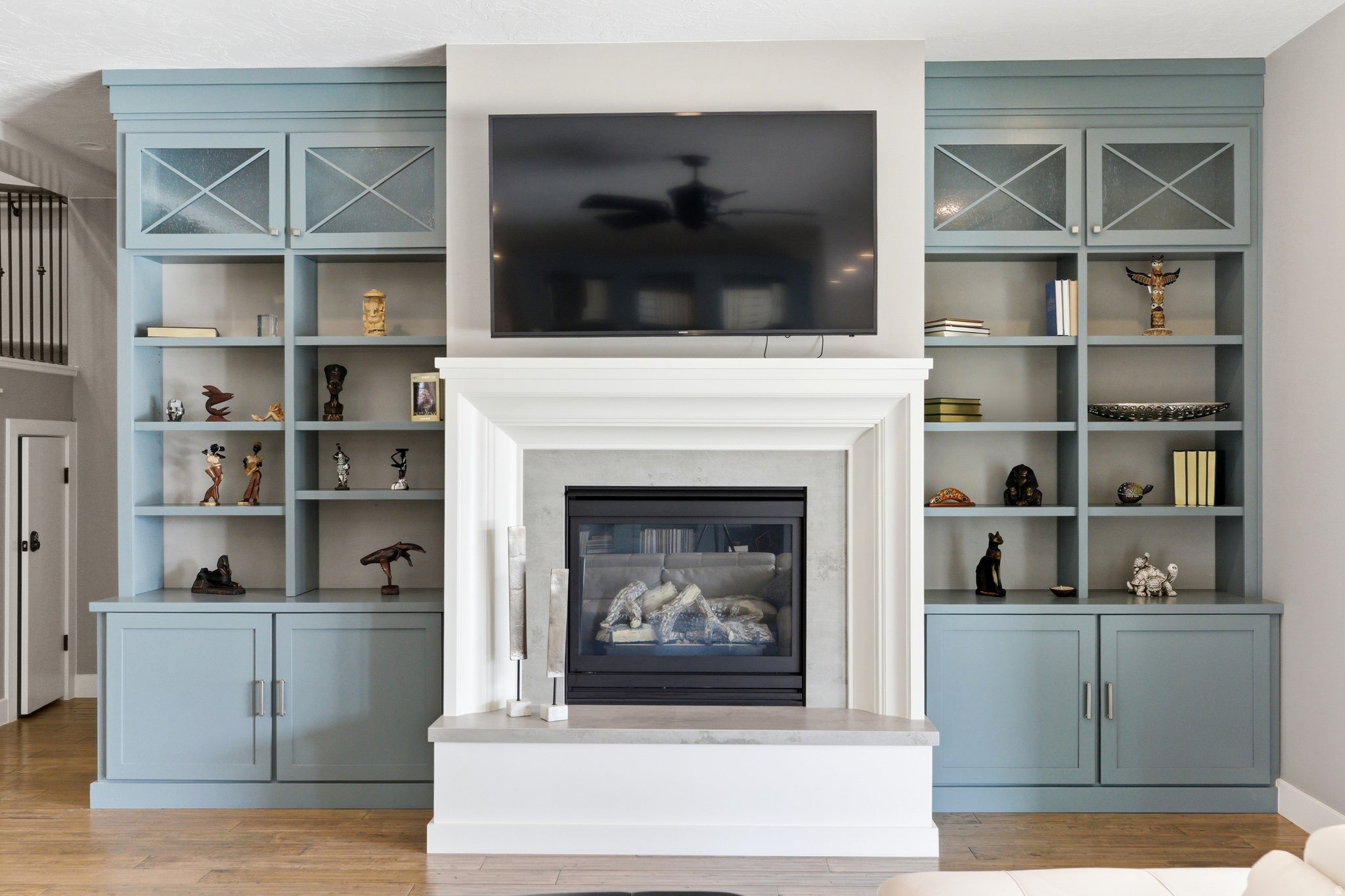 Custom California Ranch-Style Estate featuring a symmetrical faade, circular paver driveway, stacked-stone accents, and meticulous landscaping. Double iron-and-glass entry doors opens to a light-filled interior framed by floor-to-ceiling windows and wood-trimmed architectural columns, leading seamlessly into the formal living and dining rooms.
