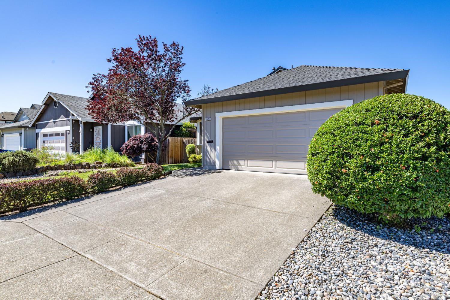 Single-level home in a well-established northwest neighborhood offering 3 bedrooms and 2 full bathrooms across approximately 1,335 sq ft, built in 1990. The kitchen features vaulted ceilings, ample cabinet space, and a breakfast nook. The living and dining areas also have vaulted ceilings, a fireplace, and a sliding door that opens to a private back patio. The primary suite is spacious with vaulted ceilings, and the laundry room is conveniently located just off the garage with additional cabinetry for storage. The two-car garage includes built-in workbenches and cabinets. Fresh interior and exterior paint. The backyard is designed for easy upkeep, with a large patio, wisteria-covered trellis, and a storage shed. Conveniently located near Olivers Market, A Place to Play Park, and just a short drive to Sebastopol for additional shopping and dining. Easy access to Highways 12 and 101. The home also has a certified clear pest report.