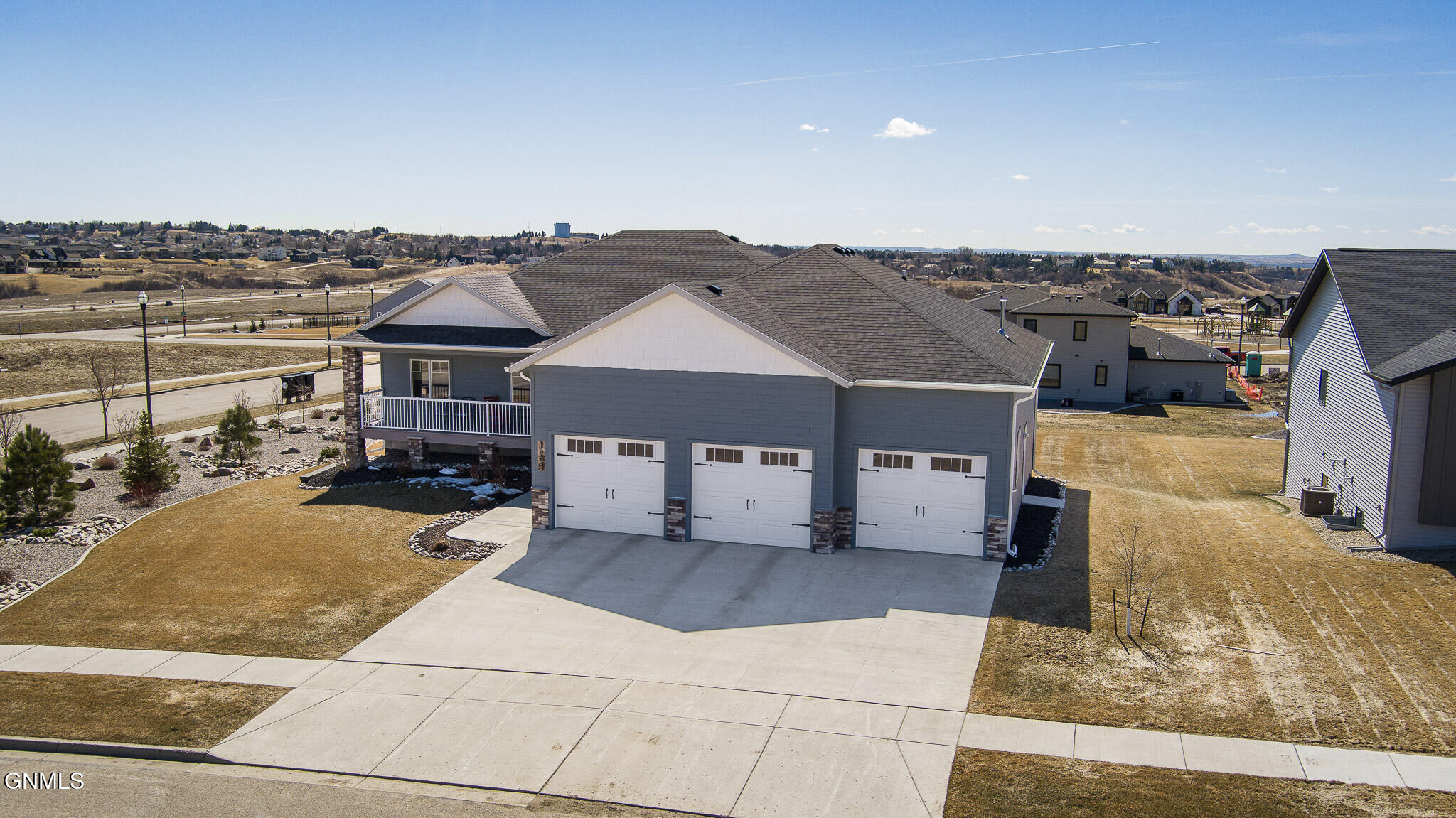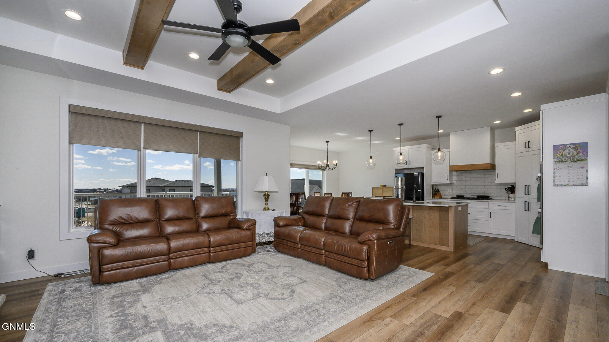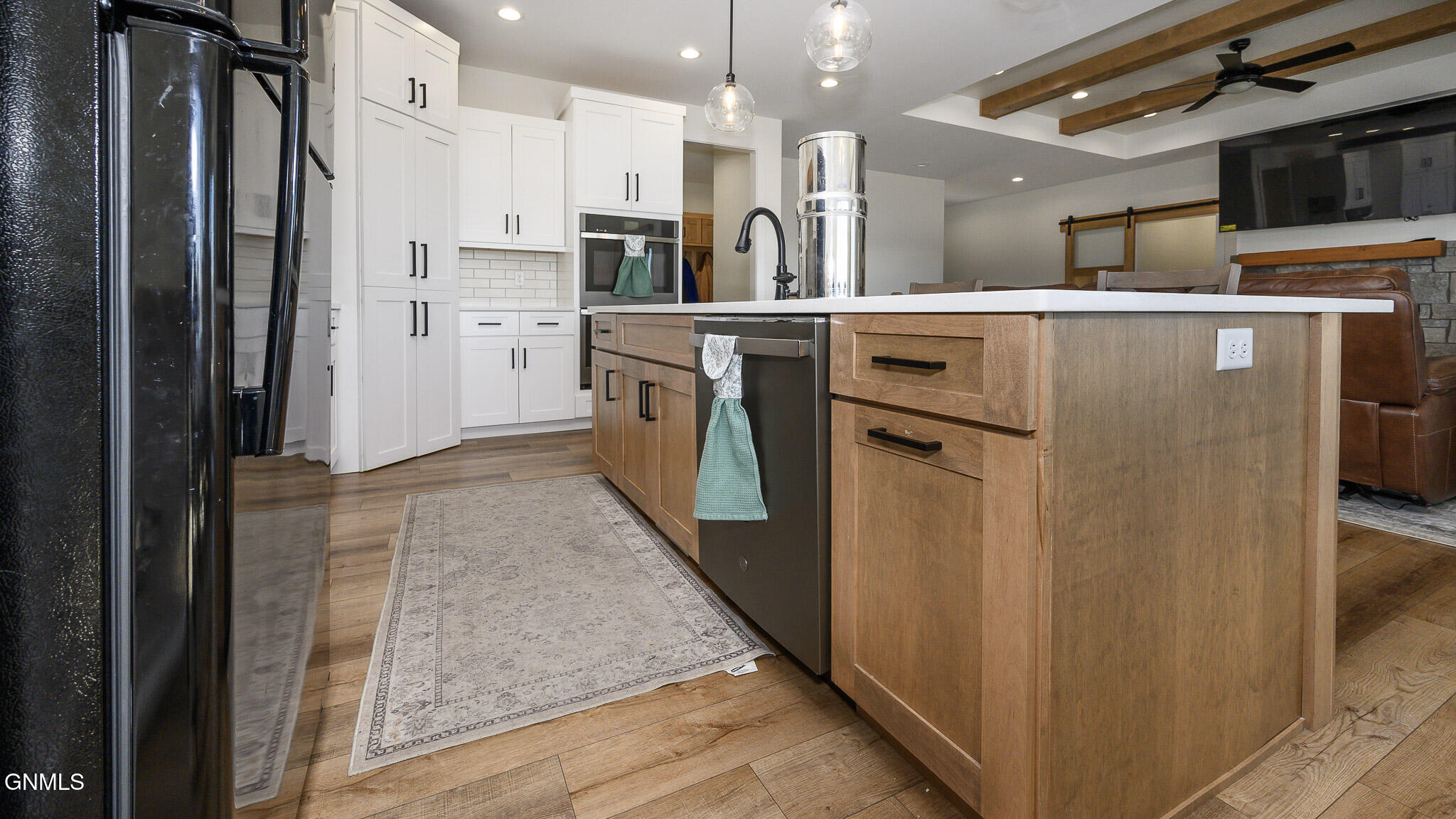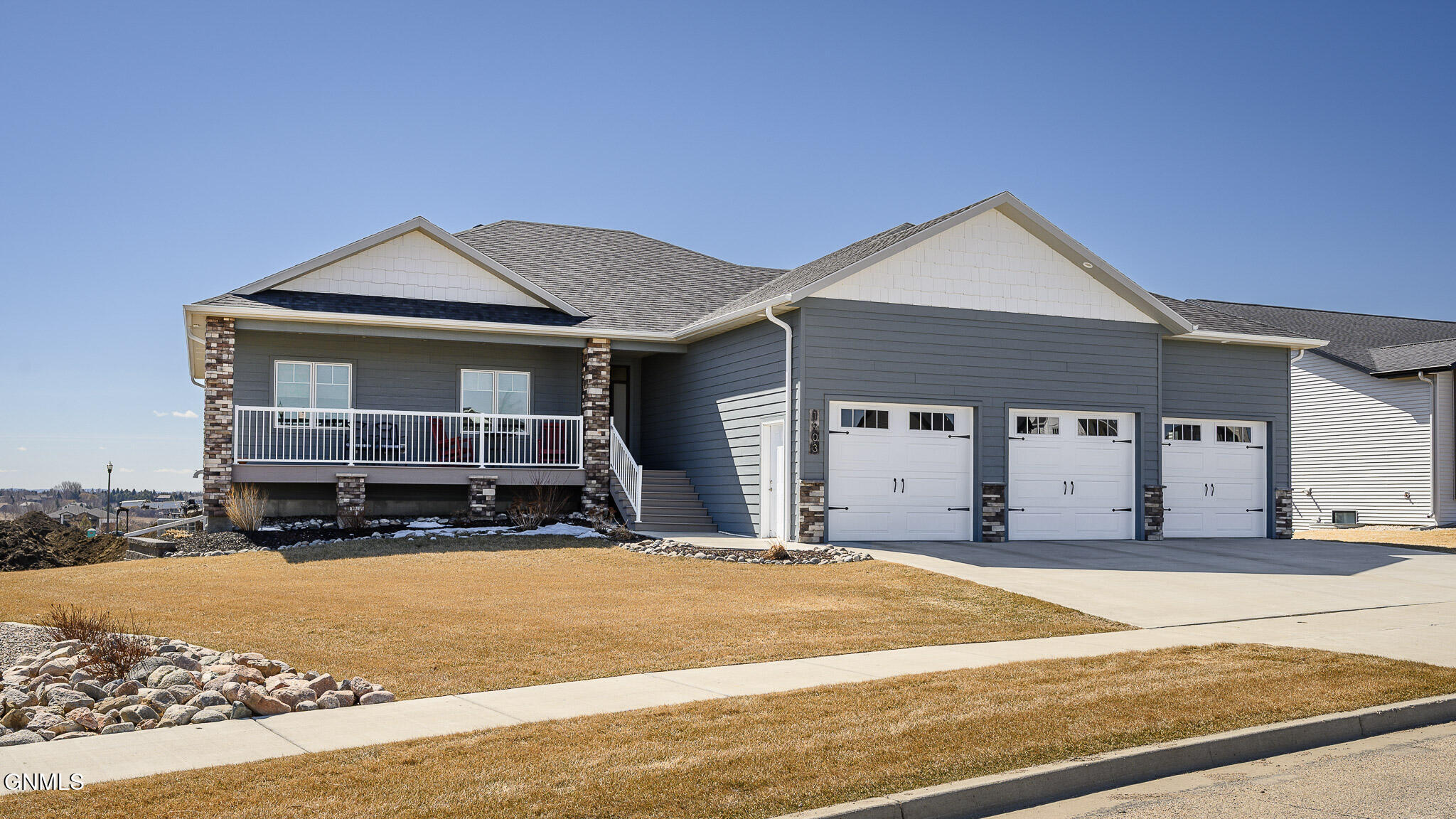This farmhouse-inspired ranch walk-out offers a thoughtful blend of modern finishes and functional design, located across from Elk Ridge Elementary School in the desirable Elk Ridge neighborhood. A maintenance-free, southern-style front porch creates a charming first impression and provides a comfortable setting for enjoying morning coffee or unwinding in the evening. Inside, the main living area features a gas fireplace with natural stone surround, boxed ceiling, and wood beam accents that bring warmth, character, and an inviting atmosphere. The kitchen is designed with both style and efficiency in mind, showcasing an oversized island with quartz countertops, with a backdrop of white cabinets, custom vent hood, black stainless-steel appliances, gas cooktop, double ovens, tile backsplash, soft-close cabinetry, under-cabinet lighting, and a hidden walk-in pantry. The dining area connects to a 15 x 13 covered, maintenance-free deck equipped with recessed lighting, prewiring for a ceiling fan, and a gas line, creating an ideal space for outdoor dining, entertaining, or simply enjoying the changing seasons. A wide staircase provides access to the lower patio and partial fenced in backyard. A sliding barn door leads to the main-level bedroom wing. The primary suite includes ceiling beam accents, a private bathroom with dual sinks and tiled shower, and a large walk-in closet, offering a comfortable and well-designed space. Two additional bedrooms and a full bathroom are also located on the main floor. Additional main-level features include a mudroom with built-in bench and hooks, a half bathroom, and a conveniently located laundry room near the garage entry. The finished walk-out lower level expands the living space with a spacious family room featuring a second gas fireplace and access to the patio. Two additional bedrooms, both with walk-in closets, a full bathroom, and a flexible-use room suitable for a variety of needs are also included. Storage is available in both a dedicated storage room and the utility area. The heated 1,298 sq. ft. garage is equipped with hot and cold water, a utility sink, floor drains, workbench space, and built-in shelving, providing excellent functionality for a variety of uses. The oversized corner lot is fully landscaped, established plants, decorative rock, and a sprinkler system with drip lines. A black aluminum fence surrounds portion of the yard, creating a clean and finished outdoor setting. Additional features include LP siding, double-pane Pella windows, Hunter Douglas window treatments, and accessible-width doorways on the main level.