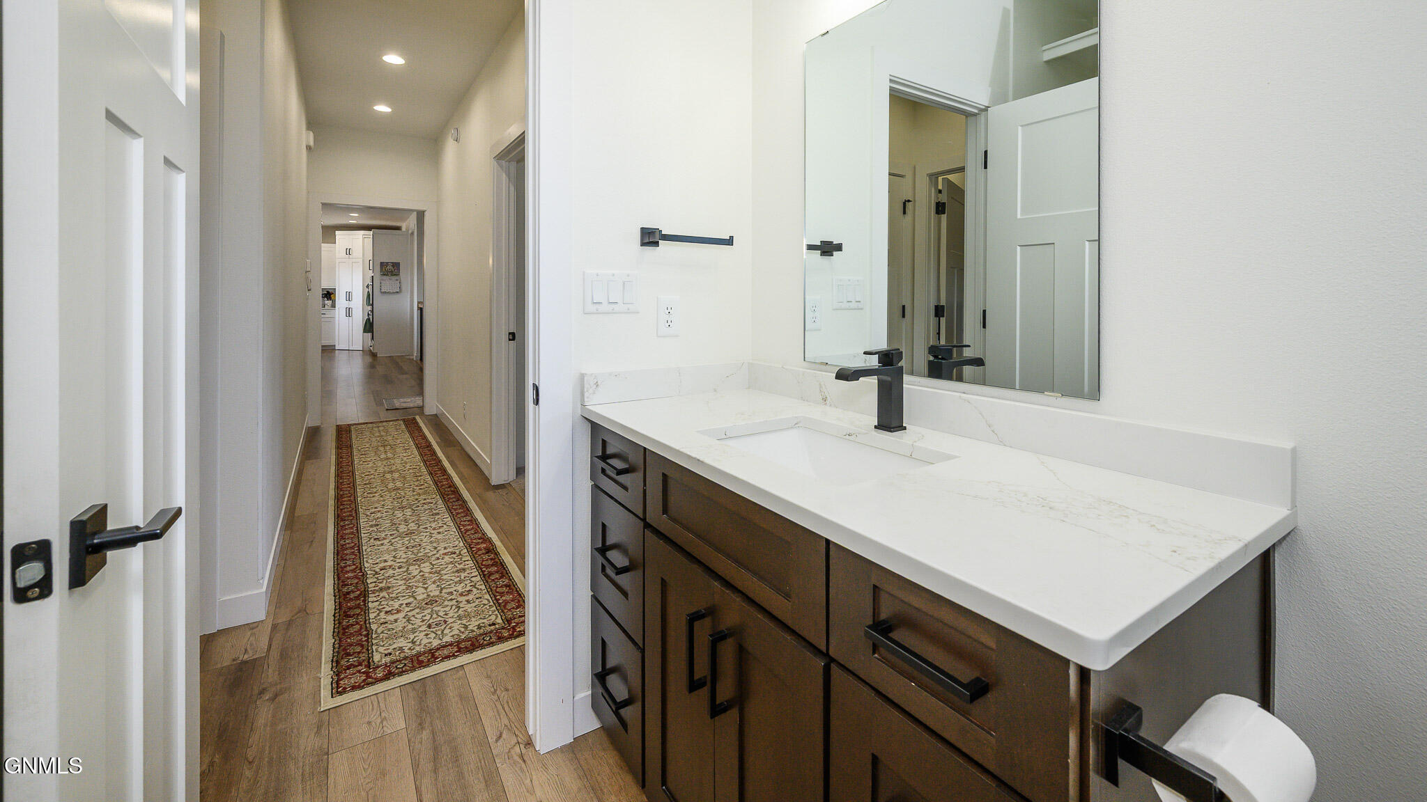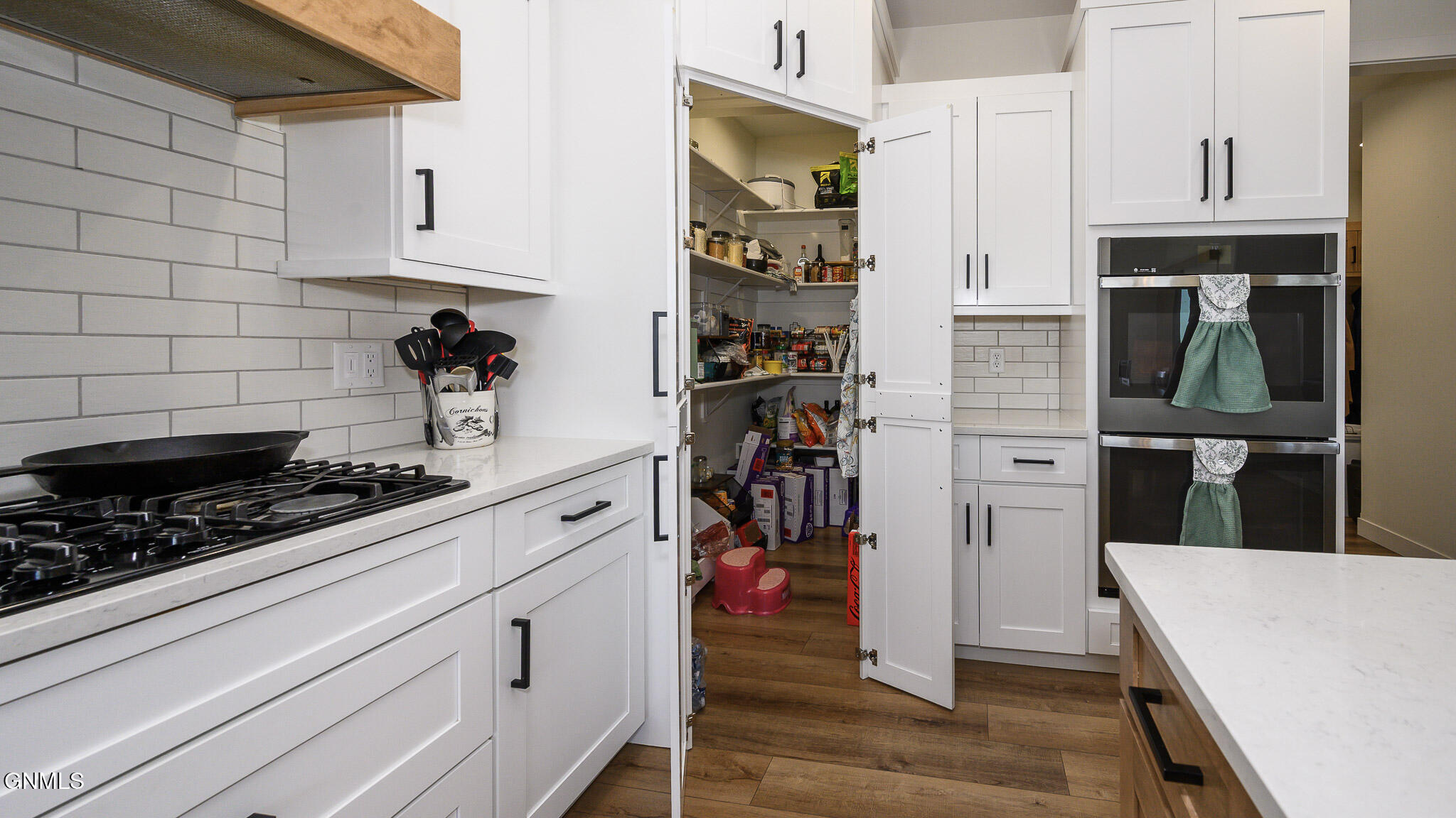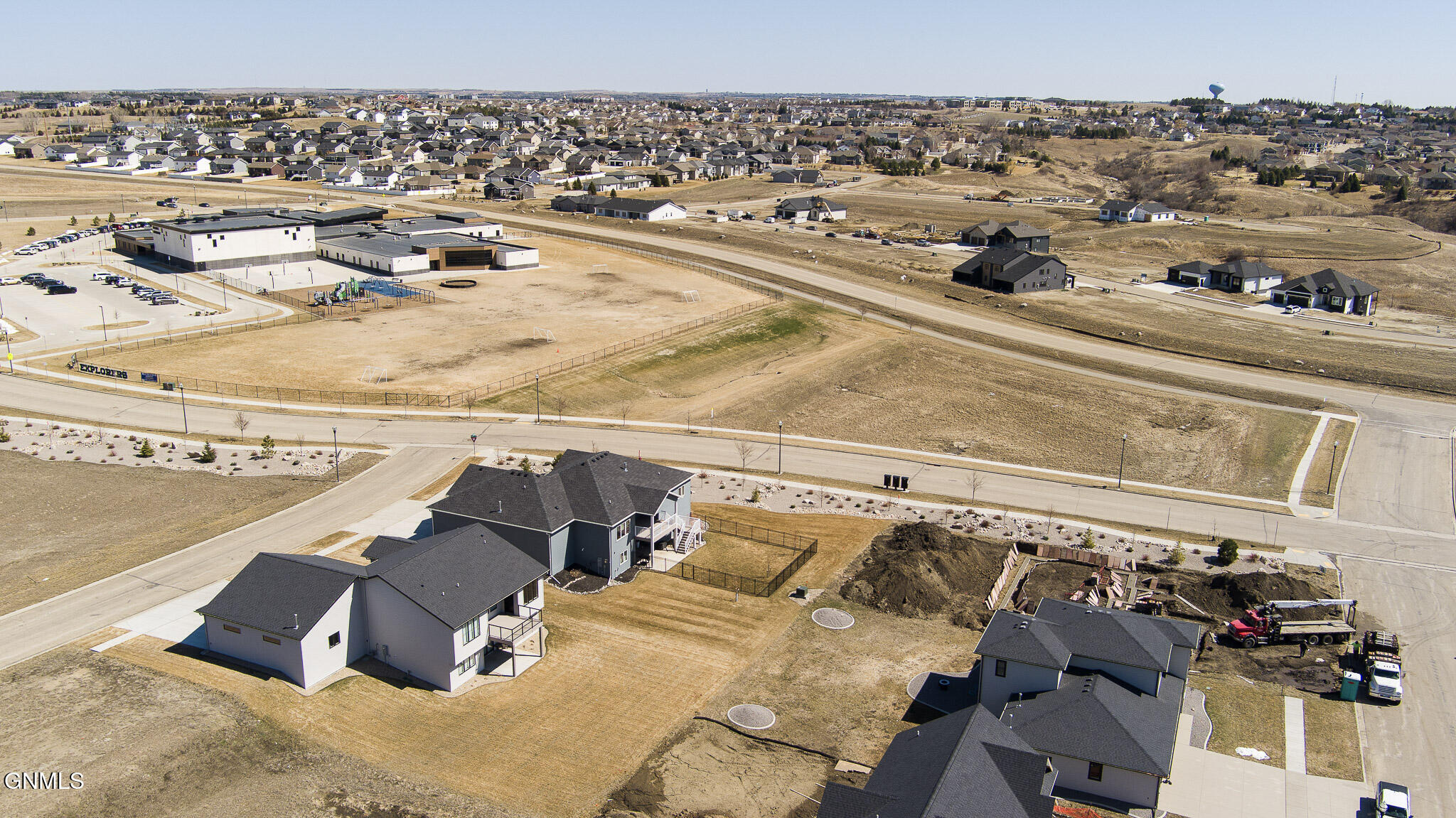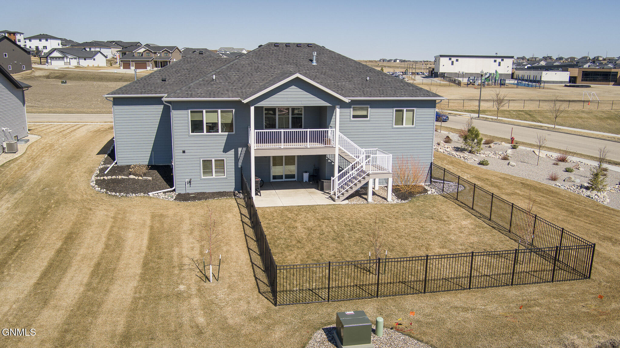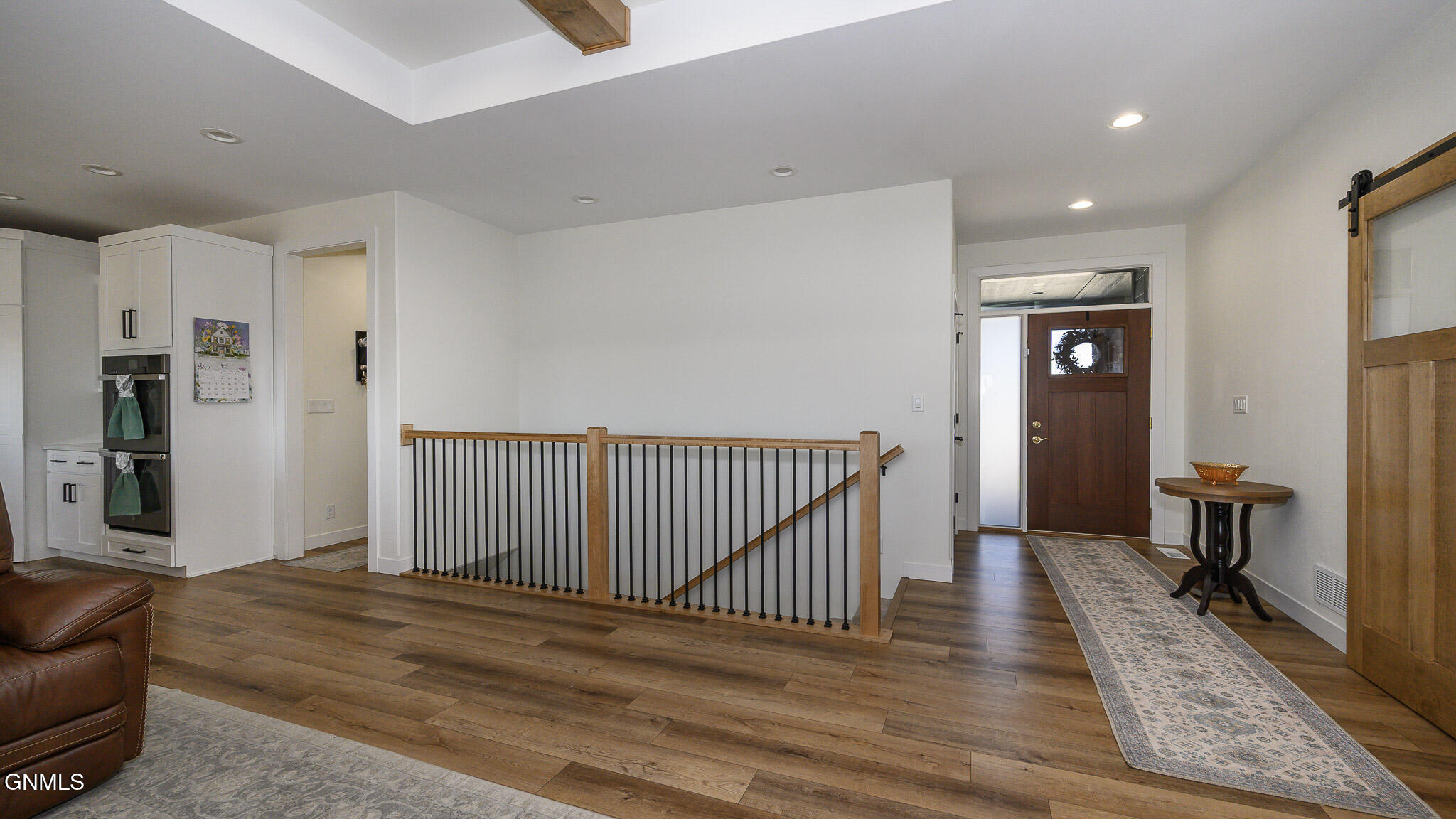 This farmhouse-inspired ranch walk-out offers a thoughtful blend of modern finishes and functional design, located across from Elk Ridge Elementary School in the desirable Elk Ridge neighborhood. A maintenance-free, southern-style front porch creates a charming first impression and provides a comfortable setting for enjoying morning coffee or unwinding in the evening. Inside, the main living area features a gas fireplace with natural stone surround, boxed ceiling, and wood beam accents that bring warmth, character, and an inviting atmosphere. The kitchen is designed with both style and efficiency in mind, showcasing an oversized island with quartz countertops, with a backdrop of white cabinets, custom vent hood, black stainless-steel appliances, gas cooktop, double ovens, tile backsplash, soft-close cabinetry, under-cabinet lighting, and a hidden walk-in pantry. The dining area connects to a 15 x 13 covered, maintenance-free deck equipped with recessed lighting, prewiring for a ceiling fan, and a gas line, creating an ideal space for outdoor dining, entertaining, or simply enjoying the changing seasons. A wide staircase provides access to the lower patio and partial fenced in backyard. A sliding barn door leads to the main-level bedroom wing. The primary suite includes ceiling beam accents, a private bathroom with dual sinks and tiled shower, and a large walk-in closet, offering a comfortable and well-designed space. Two additional bedrooms and a full bathroom are also located on the main floor. Additional main-level features include a mudroom with built-in bench and hooks, a half bathroom, and a conveniently located laundry room near the garage entry. The finished walk-out lower level expands the living space with a spacious family room featuring a second gas fireplace and access to the patio. Two additional bedrooms, both with walk-in closets, a full bathroom, and a flexible-use room suitable for a variety of needs are also included. Storage is available in both a dedicated storage room and the utility area. The heated 1,298 sq. ft. garage is equipped with hot and cold water, a utility sink, floor drains, workbench space, and built-in shelving, providing excellent functionality for a variety of uses. The oversized corner lot is fully landscaped, established plants, decorative rock, and a sprinkler system with drip lines. A black aluminum fence surrounds portion of the yard, creating a clean and finished outdoor setting. Additional features include LP siding, double-pane Pella windows, Hunter Douglas window treatments, and accessible-width doorways on the main level.