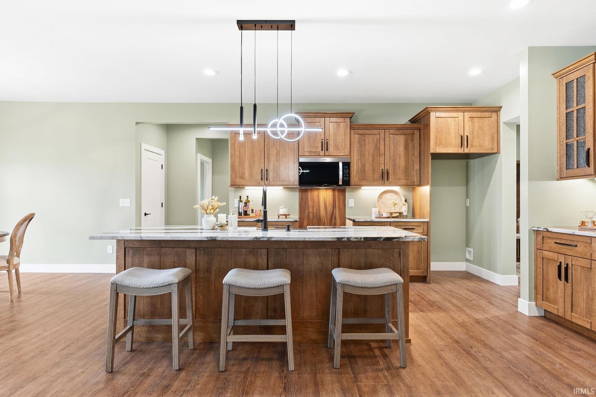 Welcome to this stunning, sprawling 5-bedroom, 3-bath home that offers the perfect blend of space, style, and scenic views. From the moment you step inside, you're greeted by an impressive main living area featuring a dramatic floor-to-ceiling fireplace‹”creating a warm, inviting focal point and the perfect setting for gathering or relaxing. Step out from the dining room onto the suspended stamped concrete patio, where you'll enjoy elevated views overlooking a massive, serene pond. Whether it's morning coffee or evening sunsets, this outdoor space is truly a standout feature designed for relaxation and entertaining alike. The expansive layout provides effortless main-level living, while the full finished basement adds incredible versatility with two additional bedrooms, a spacious living area, and walkout access to the backyard‹”ideal for guests, entertaining, or multi-generational living. Car enthusiasts and hobbyists will love the oversized 26x32 three-car garage, offering ample space for vehicles, storage, and workspace. This home delivers the perfect combination of size, function, and breathtaking surroundings‹”an exceptional opportunity you won't want to miss!