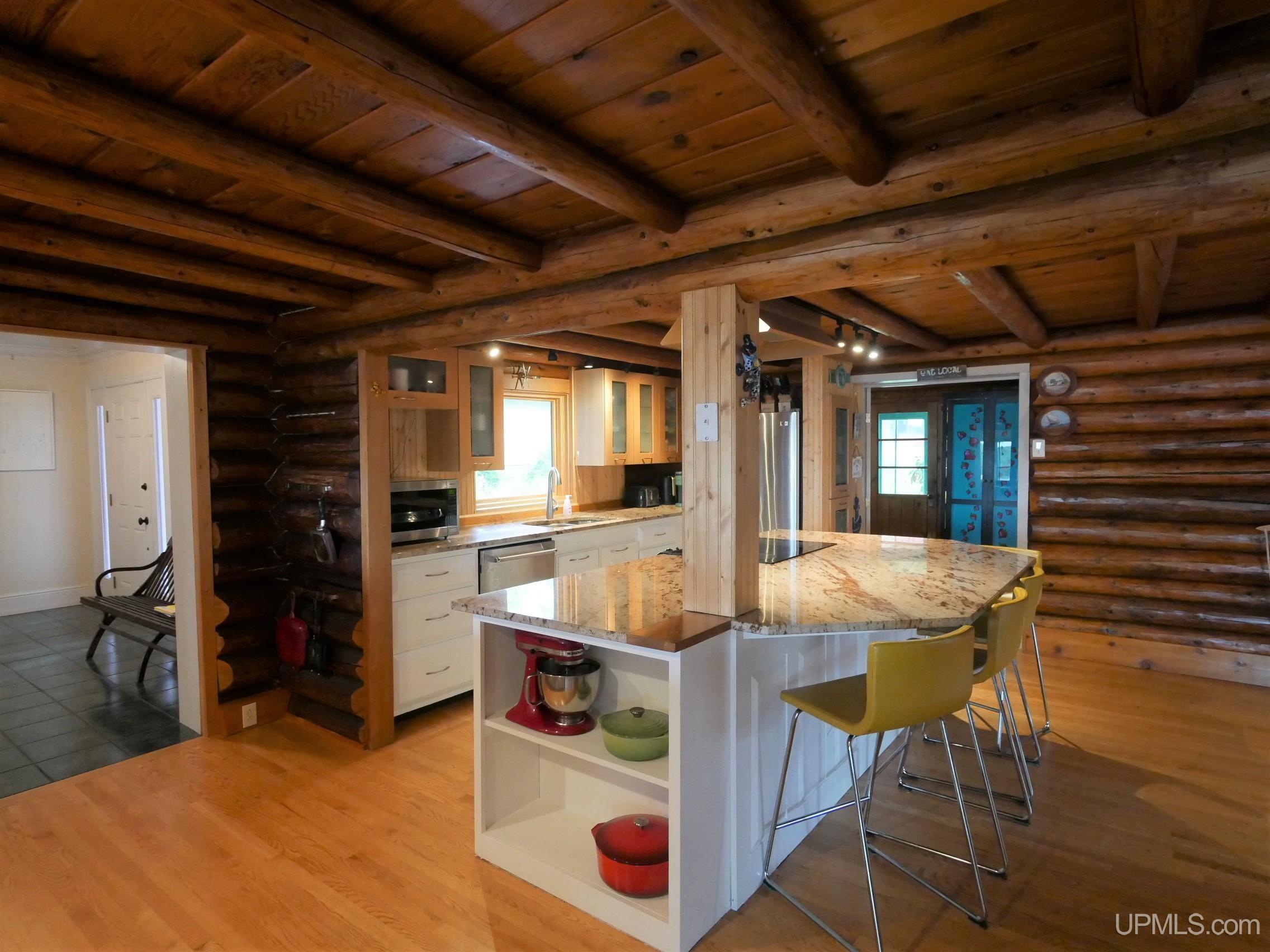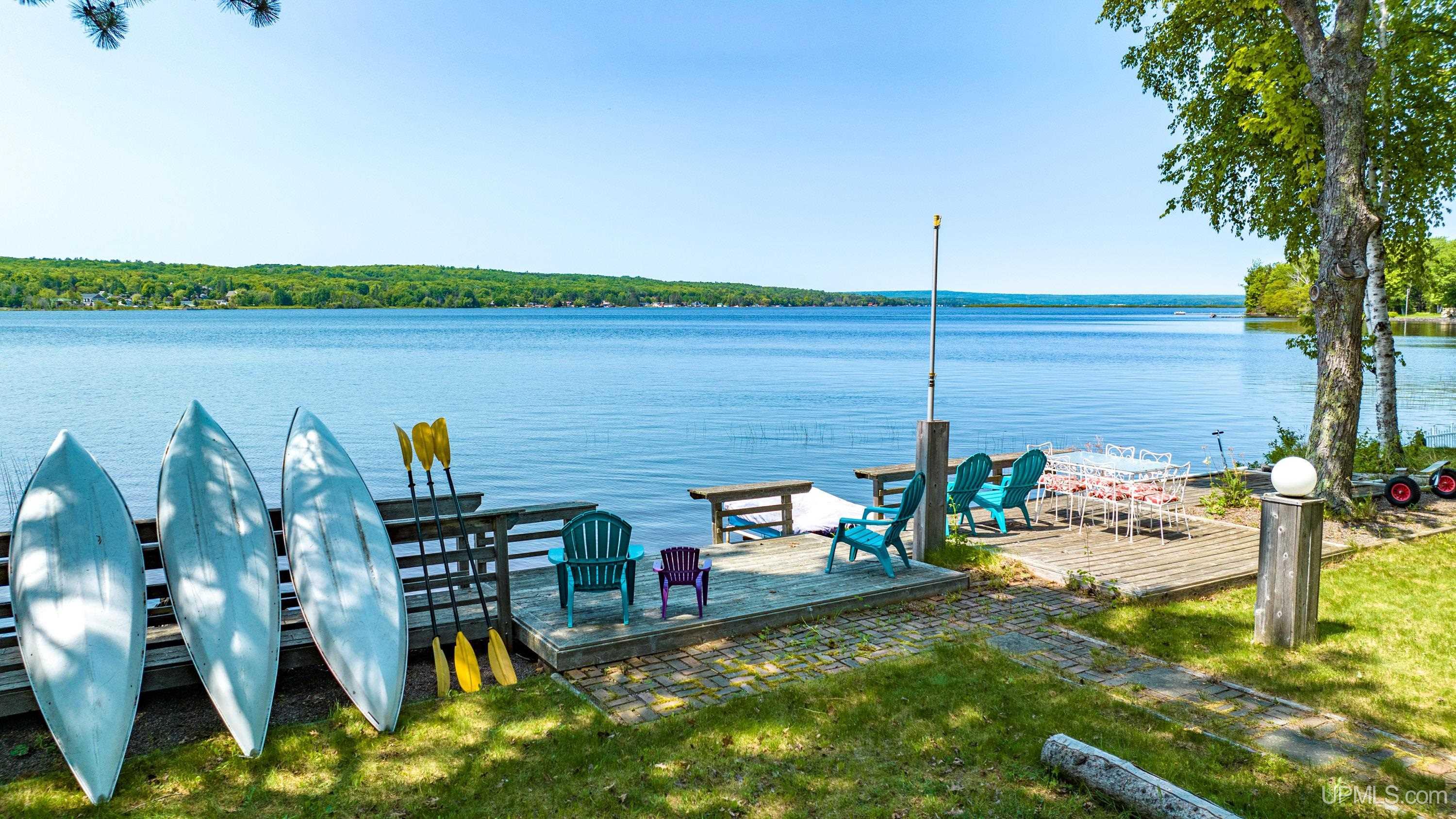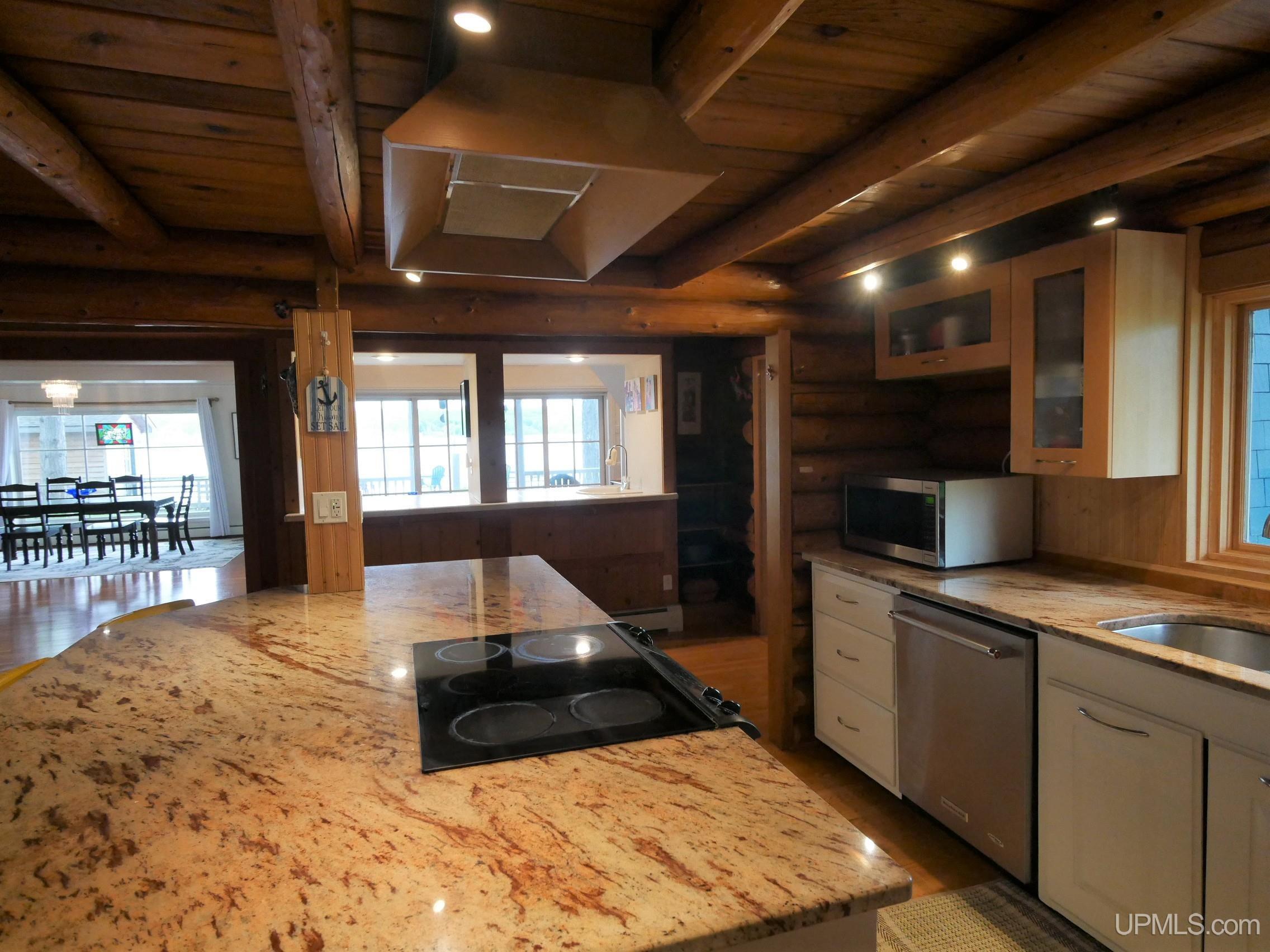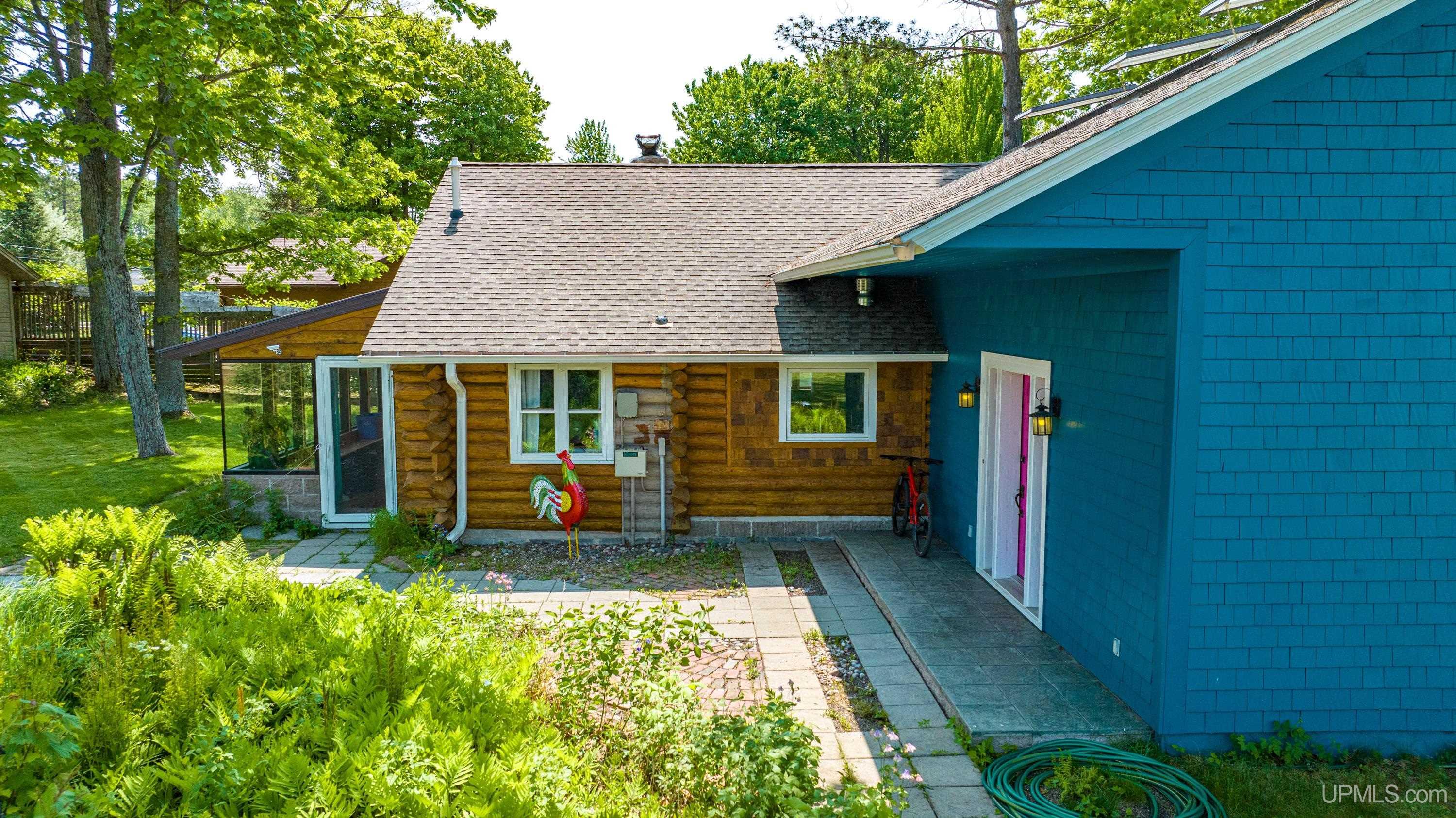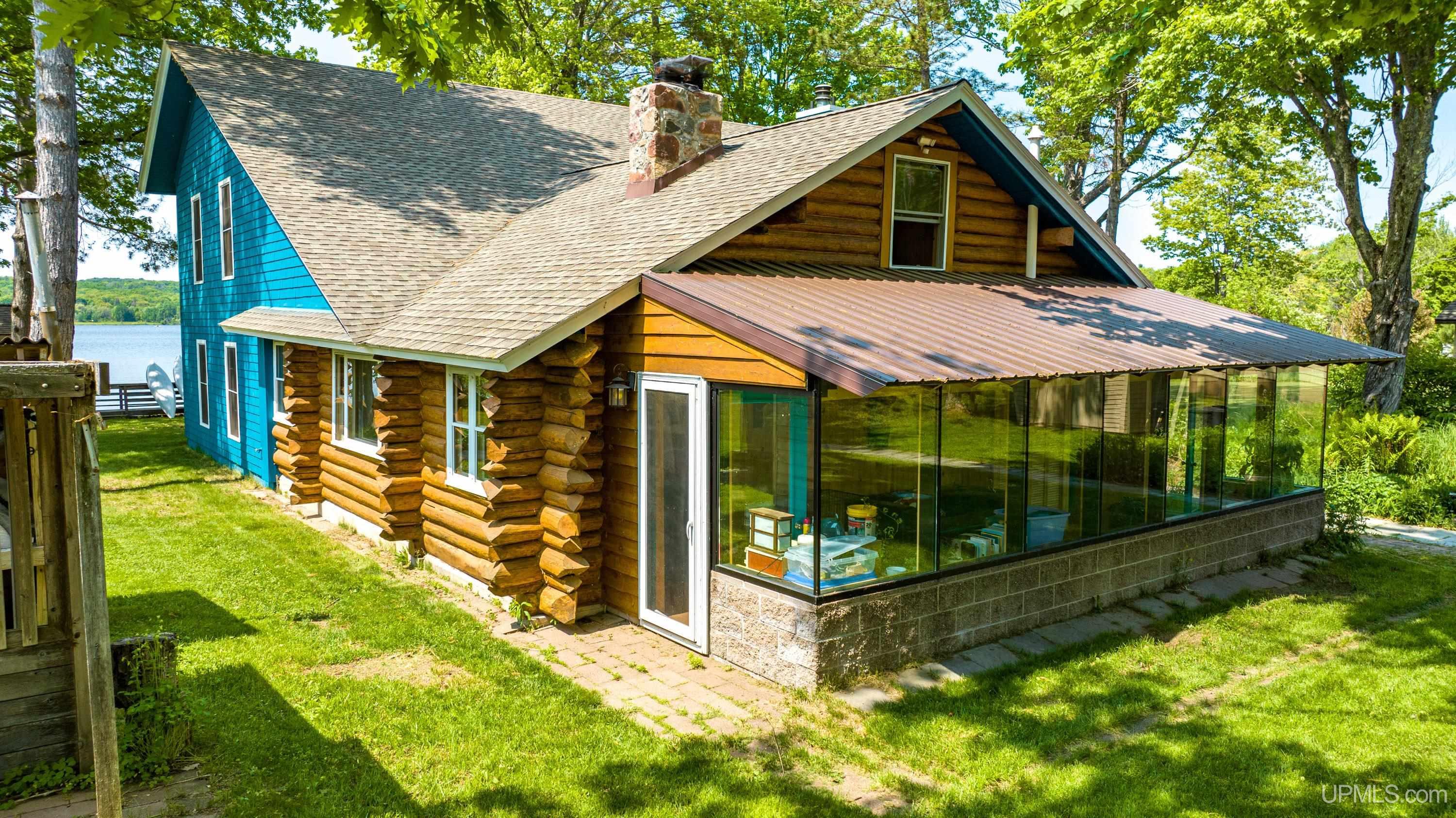 This property presents an exceptional fusion of contemporary design and classic log cabin architecture, set on approximately 100 feet of Portage Lake waterfront at Half Moon Beach‹“Chassell Bay, just 9/- miles from Houghton and Michigan Tech University. The main floor showcases the original log cabin structure integrated with a modern kitchen and comfortable sitting area featuring a wood-burning fireplace. The kitchen seamlessly connects to a modern addition, offering abundant natural light and picturesque water views. The flexible open floor plan is ideal for living and dining arrangements, facilitating both relaxation and entertaining. Additional main level amenities include a formal living room with a white marble fireplace, office, foyer, three-quarter bath, sunroom, and laundry area. A curved, open staircase leads to the upper level, where the primary bedroom suite boasts a full bath, supplemental vanity, and spacious closet. The second bedroom includes a half bath, while the third shares a full bathroom; two bedrooms provide direct balcony access with tranquil lake vistas. Some of the notable finishes throughout the home consist of granite countertops, solid cherry flooring bordered with Birdseye maple and walnut, crown and picture molding, and extensive water views. Outdoor amenities feature lakeside decking and a cedar sauna (2016). Positioned near the road is a detached 2 car garage (constructed in 2019) with workshop potential and loft storage, complemented by a tandem two-car garage, garden shed, and additional storage building for recreational equipment. The owners have meticulously maintained the residence, including restoration and sealing of logs and exterior paint on the addition in 2019. The property is located on a quiet street with direct access to the trail from Chassell to Houghton. ---- NOTICE: Information is believed accurate but not guaranteed. Buyers must inspect & verify all property details. Buyers accept all risks of inaccuracies, including but not limited to, acreage, lot size/location, square footage, & utility availability/costs. Real estate taxes will be reassessed & may change significantly after sale; do not assume your tax bills will match the sellers. Taxes are not zero. GIS, apps and plat book pages/maps are not surveys. Audio/video recording may occur on the property; entry implies consent to recording. Buyer pre-approval or proof of funds documentation to be provided upon request. -----OFFERS: Please allow 72 hours for a response. Seller may set or change offer deadlines at any time with or without notice.
