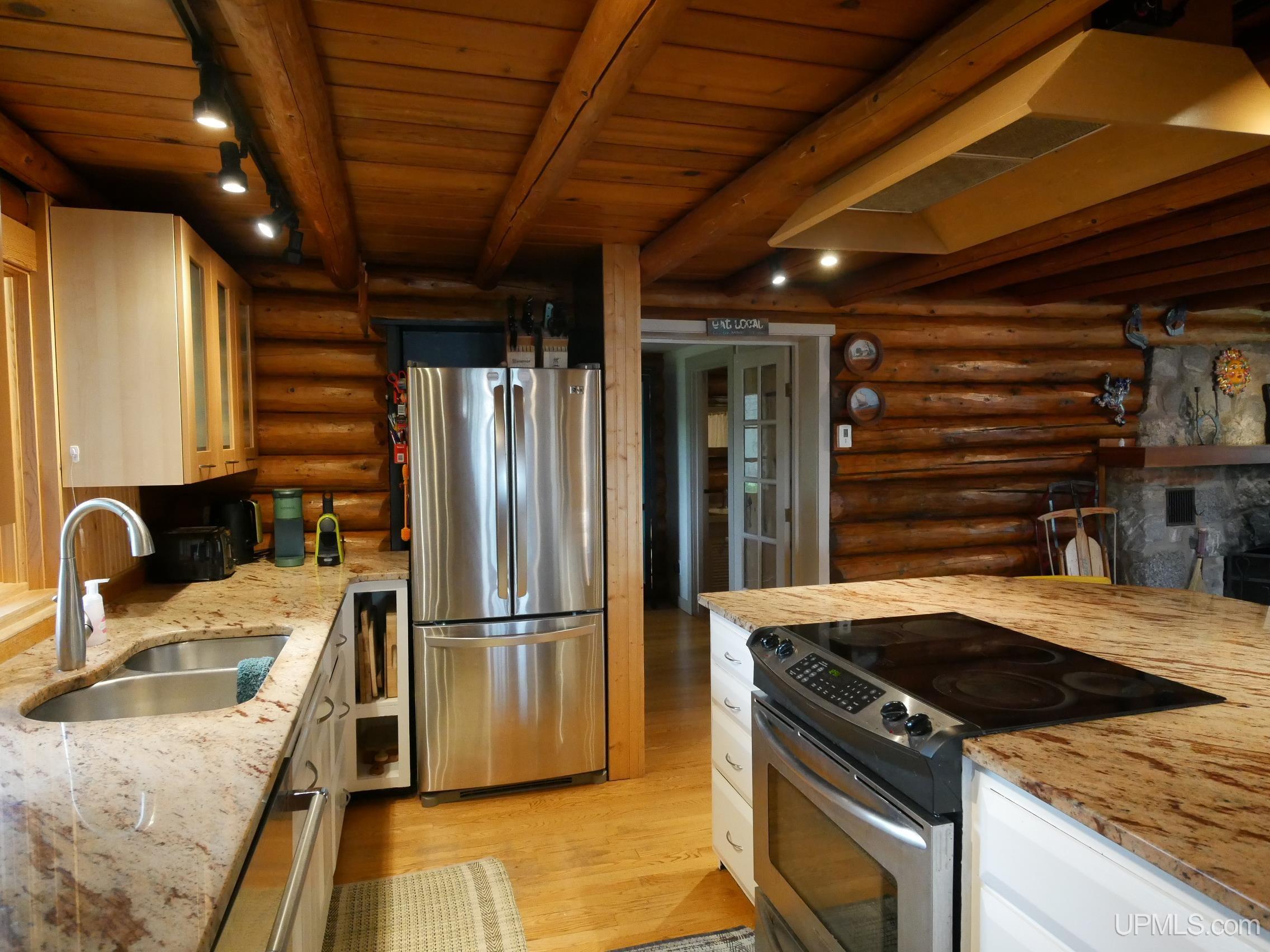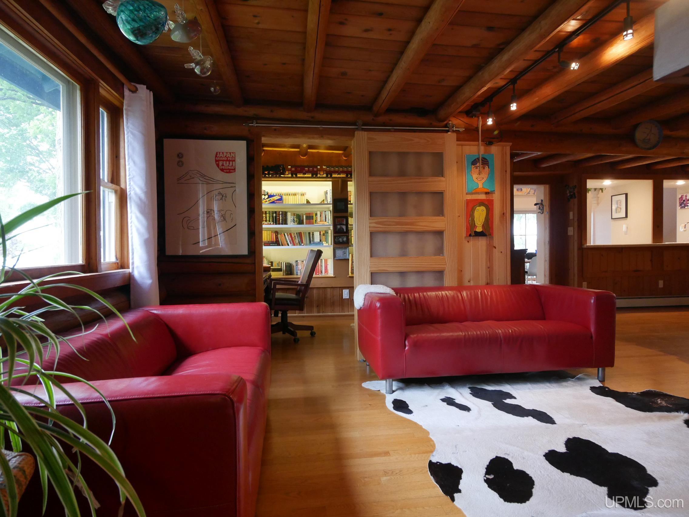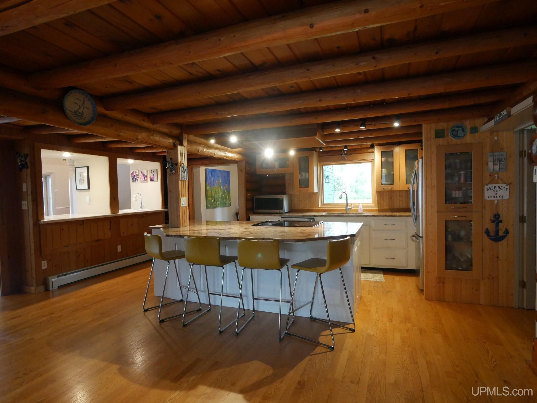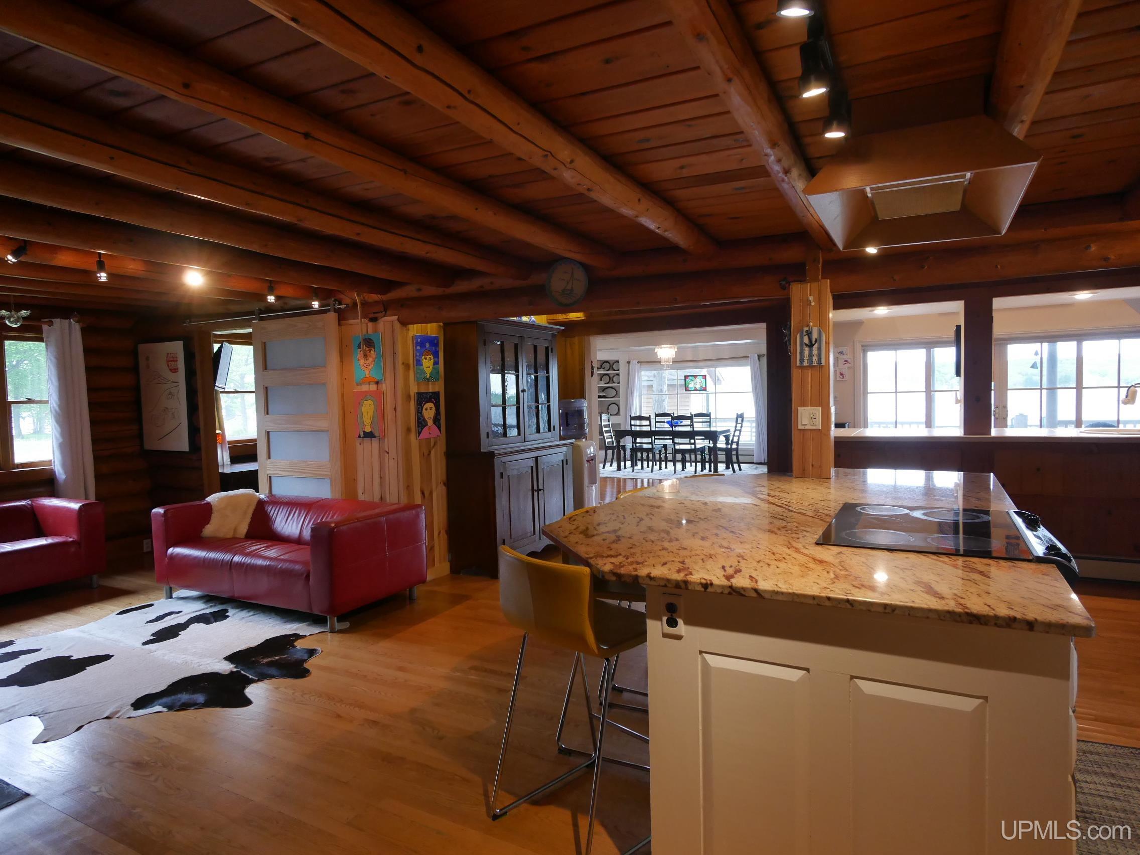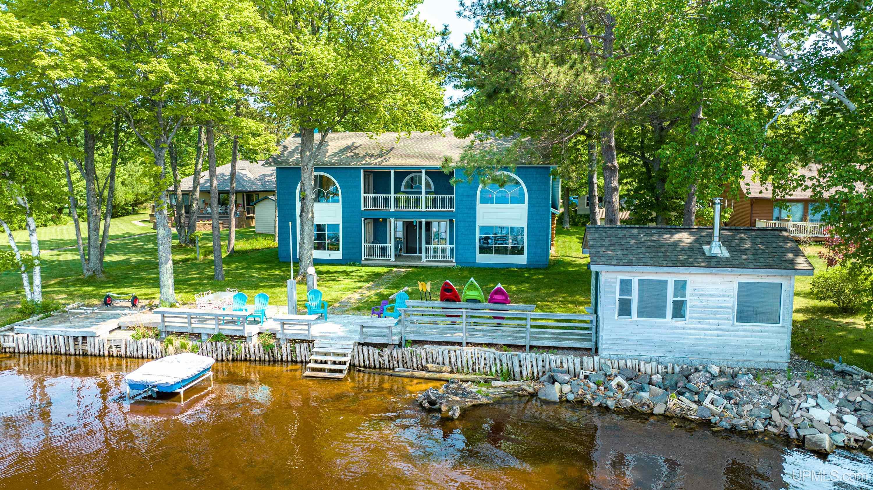 This property presents an exceptional fusion of contemporary design and classic log cabin architecture, set on approximately 100 feet of Portage Lake waterfront at Half Moon Beach‹“Chassell Bay, just 9/- miles from Houghton and Michigan Tech University. The main floor showcases the original log cabin structure integrated with a modern kitchen and comfortable sitting area featuring a wood-burning fireplace. The kitchen seamlessly connects to a modern addition, offering abundant natural light and picturesque water views. The flexible open floor plan is ideal for living and dining arrangements, facilitating both relaxation and entertaining. Additional main level amenities include a formal living room with a white marble fireplace, office, foyer, three-quarter bath, sunroom, and laundry area. A curved, open staircase leads to the upper level, where the primary bedroom suite boasts a full bath, supplemental vanity, and spacious closet. The second bedroom includes a half bath, while the third shares a full bathroom; two bedrooms provide direct balcony access with tranquil lake vistas. Some of the notable finishes throughout the home consist of granite countertops, solid cherry flooring bordered with Birdseye maple and walnut, crown and picture molding, and extensive water views. Outdoor amenities feature lakeside decking and a cedar sauna (2016). Positioned near the road is a detached 2 car garage (constructed in 2019) with workshop potential and loft storage, complemented by a tandem two-car garage, garden shed, and additional storage building for recreational equipment. The owners have meticulously maintained the residence, including restoration and sealing of logs and exterior paint on the addition in 2019. The property is located on a quiet street with direct access to the trail from Chassell to Houghton. ---- NOTICE: Information is believed accurate but not guaranteed. Buyers must inspect & verify all property details. Buyers accept all risks of inaccuracies, including but not limited to, acreage, lot size/location, square footage, & utility availability/costs. Real estate taxes will be reassessed & may change significantly after sale; do not assume your tax bills will match the sellers. Taxes are not zero. GIS, apps and plat book pages/maps are not surveys. Audio/video recording may occur on the property; entry implies consent to recording. Buyer pre-approval or proof of funds documentation to be provided upon request. -----OFFERS: Please allow 72 hours for a response. Seller may set or change offer deadlines at any time with or without notice.