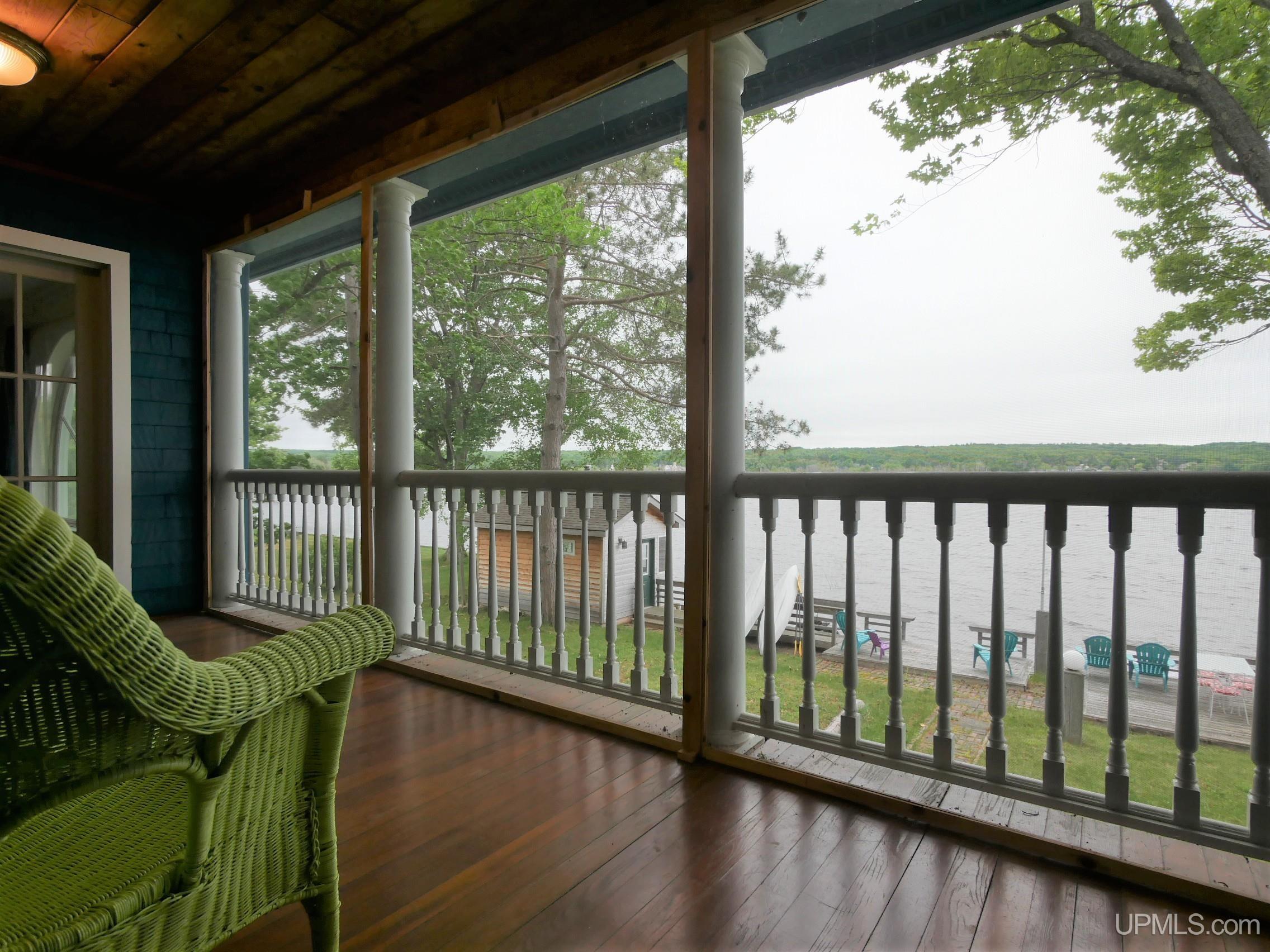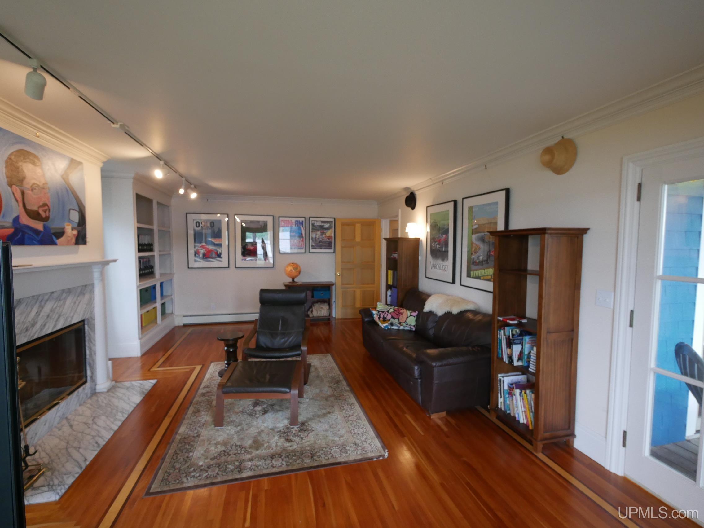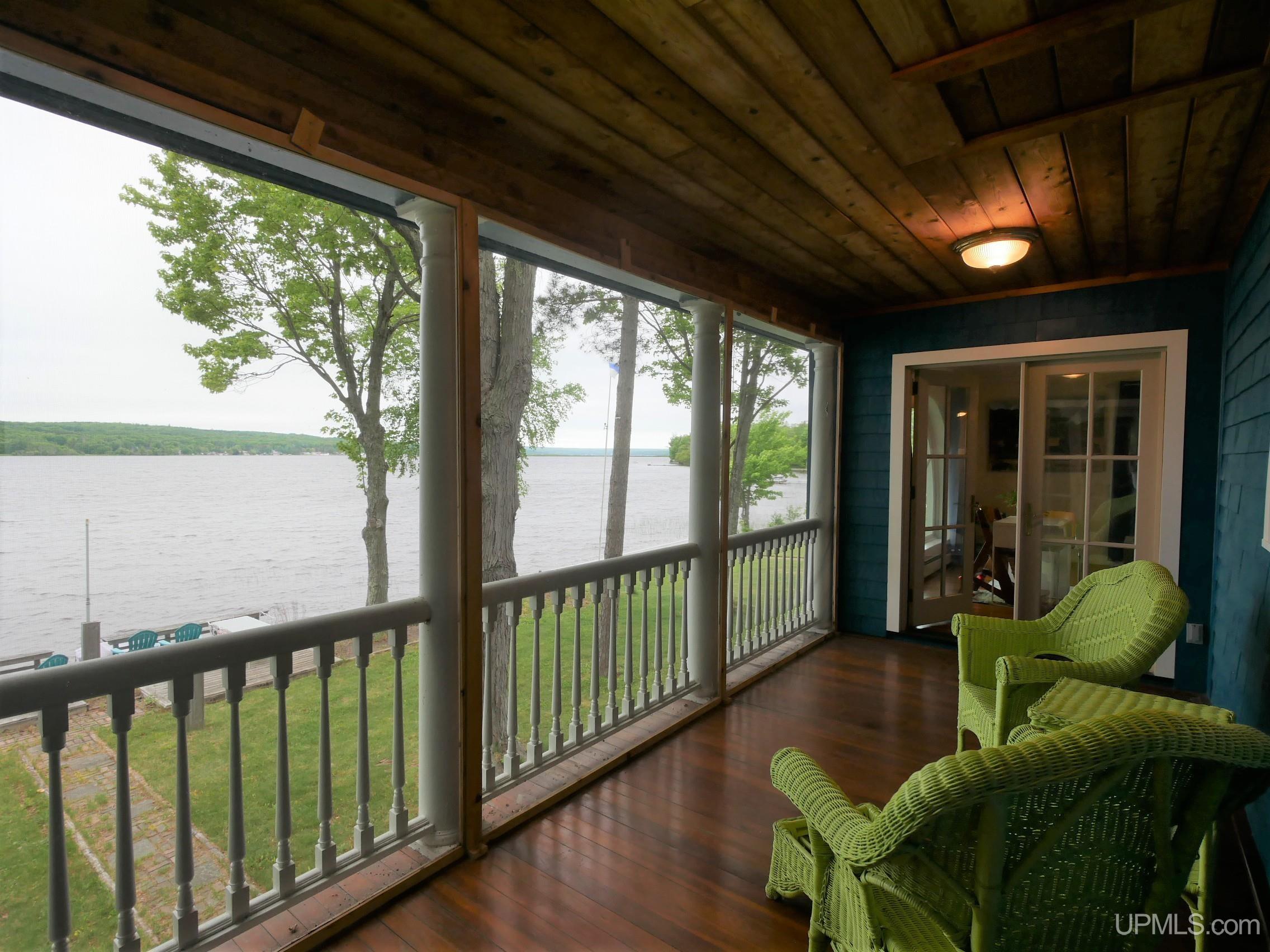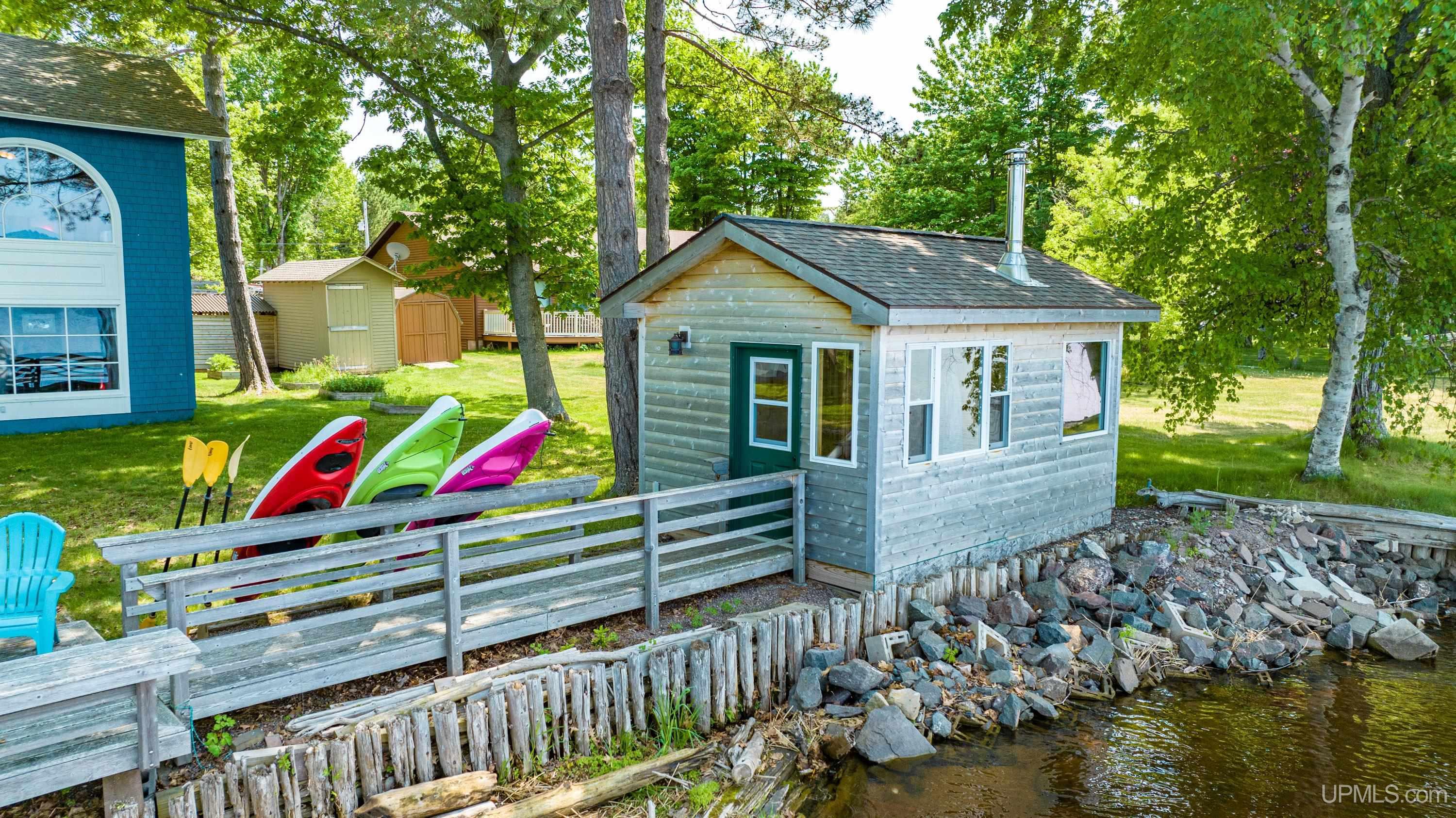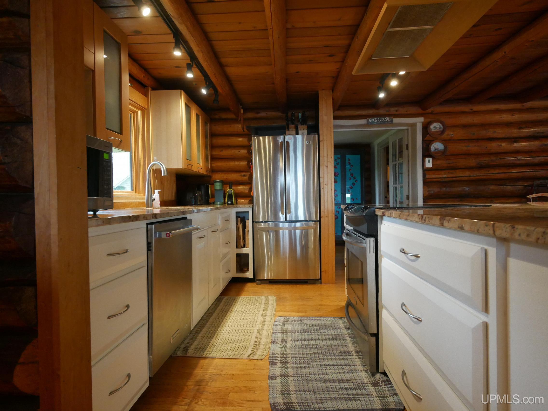 This property presents an exceptional fusion of contemporary design and classic log cabin architecture, set on approximately 100 feet of Portage Lake waterfront at Half Moon Beach‹“Chassell Bay, just 9/- miles from Houghton and Michigan Tech University. The main floor showcases the original log cabin structure integrated with a modern kitchen and comfortable sitting area featuring a wood-burning fireplace. The kitchen seamlessly connects to a modern addition, offering abundant natural light and picturesque water views. The flexible open floor plan is ideal for living and dining arrangements, facilitating both relaxation and entertaining. Additional main level amenities include a formal living room with a white marble fireplace, office, foyer, three-quarter bath, sunroom, and laundry area. A curved, open staircase leads to the upper level, where the primary bedroom suite boasts a full bath, supplemental vanity, and spacious closet. The second bedroom includes a half bath, while the third shares a full bathroom; two bedrooms provide direct balcony access with tranquil lake vistas. Some of the notable finishes throughout the home consist of granite countertops, solid cherry flooring bordered with Birdseye maple and walnut, crown and picture molding, and extensive water views. Outdoor amenities feature lakeside decking and a cedar sauna (2016). Positioned near the road is a detached 2 car garage (constructed in 2019) with workshop potential and loft storage, complemented by a tandem two-car garage, garden shed, and additional storage building for recreational equipment. The owners have meticulously maintained the residence, including restoration and sealing of logs and exterior paint on the addition in 2019. The property is located on a quiet street with direct access to the trail from Chassell to Houghton. ---- NOTICE: Information is believed accurate but not guaranteed. Buyers must inspect & verify all property details. Buyers accept all risks of inaccuracies, including but not limited to, acreage, lot size/location, square footage, & utility availability/costs. Real estate taxes will be reassessed & may change significantly after sale; do not assume your tax bills will match the sellers. Taxes are not zero. GIS, apps and plat book pages/maps are not surveys. Audio/video recording may occur on the property; entry implies consent to recording. Buyer pre-approval or proof of funds documentation to be provided upon request. -----OFFERS: Please allow 72 hours for a response. Seller may set or change offer deadlines at any time with or without notice.