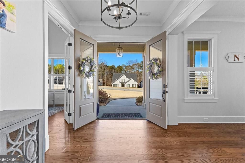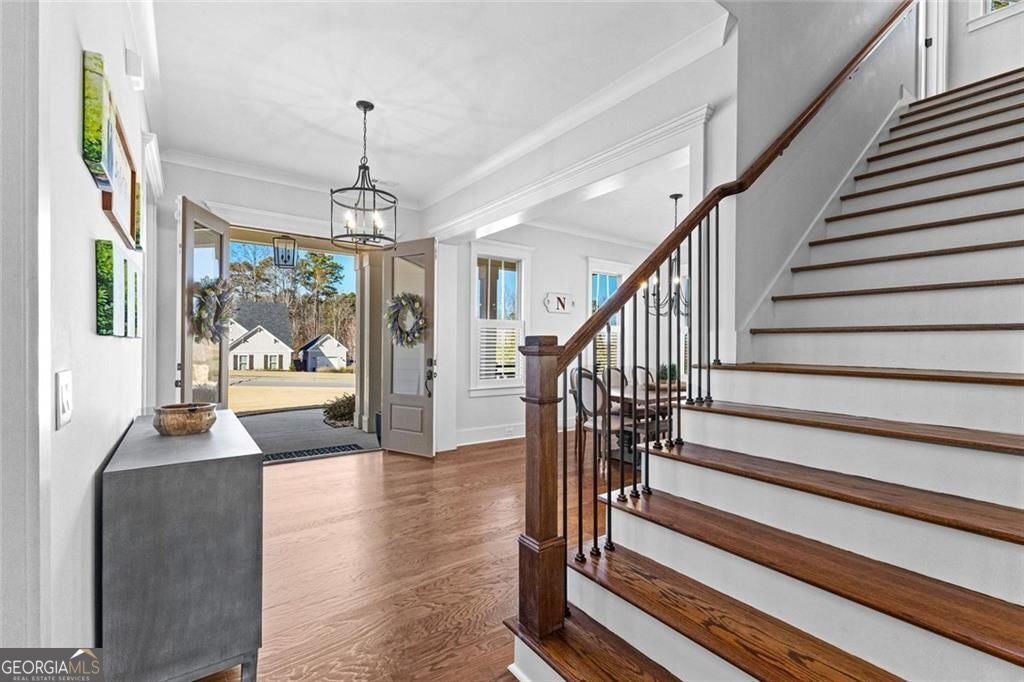 Welcome to this 1.5 story home with 5 bedrooms, 5 bathrooms, formal and casual living areas, an oversized 4 car garage, fresh landscaping, a huge deck all sitting on a 1.6 acre lot on the Preserve. A bubbling rocks water feature is in landscaping by front door. Double entry doors welcome you to 2 story open foyer with 2 coat closets, wood floor & staircase.