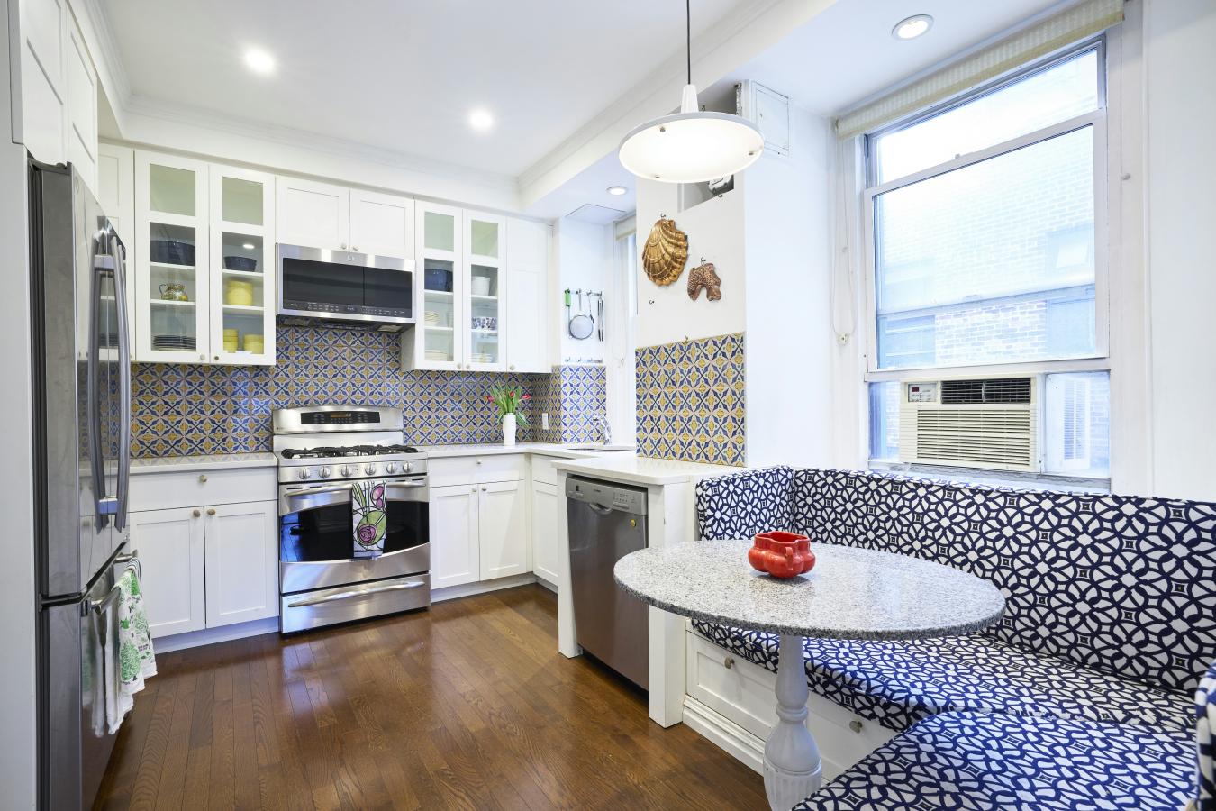 This spacious 3 bedroom plus den/office apartment has been masterfully combined weaving pre-war details into modern living. The entrance gallery opens to the living room and dining room with a wall of windows, lots of light and space for both formal dining as well as casual living. The eat-in kitchen features custom cabinetry, granite countertops, banquette seating and top of the line appliances.
