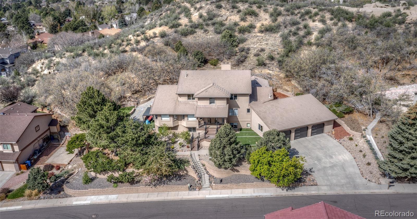 Welcome to your own custom-built private sanctuary, perfectly situated on a large, private lot offering exceptional luxury, privacy, and breathtaking city and mountain views. This completely professionally remodeled and updated home is a rare opportunity for elegant living with incredible multi-generational potential. Professionally landscaped front, back, and side yards create a stunning outdoor setting, complete with new front decking, a fenced area, a spacious 20x12 second patio, and an oversized attached three-car garage. The backyard features a private staircase with direct access to the Sunset Mesa trails, allowing you to enjoy gorgeous panoramic views of Colorado Springs and the surrounding mountains right from your own property. Inside, a grand foyer welcomes you into a thoughtfully designed floor plan featuring a spacious home office suitable for two. The gourmet kitchen is truly a chefs dream, showcasing custom cabinetry, quartz countertops, a built-in double refrigerator, an eight-burner gas stove, a large center island, and a wine refrigerator. The adjacent dining area features a beautiful bay window overlooking the backyard and offers seamless access to outdoor entertaining with two walkoutsone leading to a covered seating area and the other to the garage entry. The main-level mudroom includes one of two laundry areas, custom tile flooring, and a convenient half bath. The formal living room is warm and inviting with a cozy gas fireplace and two additional walkouts for effortless indoor-outdoor living. The luxurious primary suite offers a private sitting area with one of six fireplaces, a large walk-in closet, a spa-inspired shower, and private outdoor access. Two additional bedrooms and a full bath complete the main level. Upstairs, a bright and versatile flex space offers abundant natural light, generous storage, and a gas fireplace, along with a private bedroom and adjoining 3/4 bathperfect for guests or extended family. The basement is ideal for multi-generational living, featuring its own private entrance, full kitchen, laundry room, seating area, inviting fireplace, and a tranquil five-piece bath. Additional living space, another full bath, and an additional bedroom provide even more flexibility. Behind a concealed bookcase door, discover a private theater room, or relax and rejuvenate in your own infrared sauna. With two kitchens, two laundry areas, six fireplaces (three gas and three electric), abundant living space, and unmatched privacy throughout, this home offers a truly exceptional lifestyle. Conveniently located near Norwood Recreation Center, residents enjoy access to amenities including a pool, tennis courts, and outdoor grilling areas. This extraordinary property is the perfect multi-family home and a must-see opportunity.