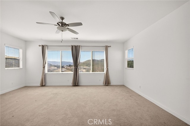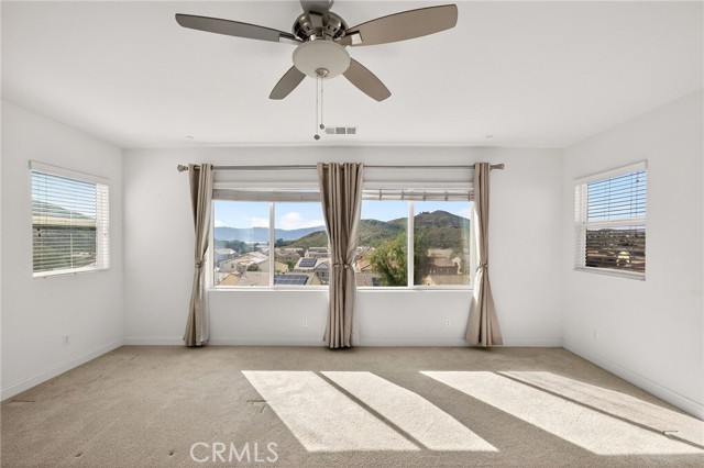 Nestled away within the exclusive, gated Canyon Hills Westridge community, this exceptional residence feels like a private slice of paradise. Perched on a premium lot, it captures breathtaking, panoramic views including Lake Elsinore and Canyon Lake—a daily backdrop that turns every sunrise and sunset into a serene escape. Impeccably maintained and styled like a model home, this 4-bedroom, 3-bath retreat welcomes you with an airy upstairs loft, perfect for relaxation or inspiration. The kitchen is a true culinary sanctuary, adorned with rich espresso cabinetry, gleaming granite countertops, and high-end GE Appliances—including a double oven and an expansive island designed for gathering, entertaining, and creating unforgettable moments. Host elegant dinners in the formal dining room, complete with a butler's pantry and abundant storage, or unwind in your luxurious primary suite—a tranquil haven where spa-like comfort meets everyday living. Soak in the tub as if on vacation, enjoy the separate shower, dual vanities, and a spacious walk-in closet designed for indulgence. Step outside to a beautifully designed, low-maintenance backyard featuring a covered patio—perfect for year-round enjoyment as you take in sweeping views. Inside, thoughtful touches like high ceilings, custom lighting and ceiling fans. Beyond your doorstep, the community invites you to live the resort lifestyle, with amenities including a scenic 2-acre park, a dedicated dog park, sparkling pool and spa, outdoor showers, BBQ areas, fire pits, and sports courts. This is more than a home—it's a destination, ready to welcome its next owners into a life of beauty, comfort, and effortless luxury.