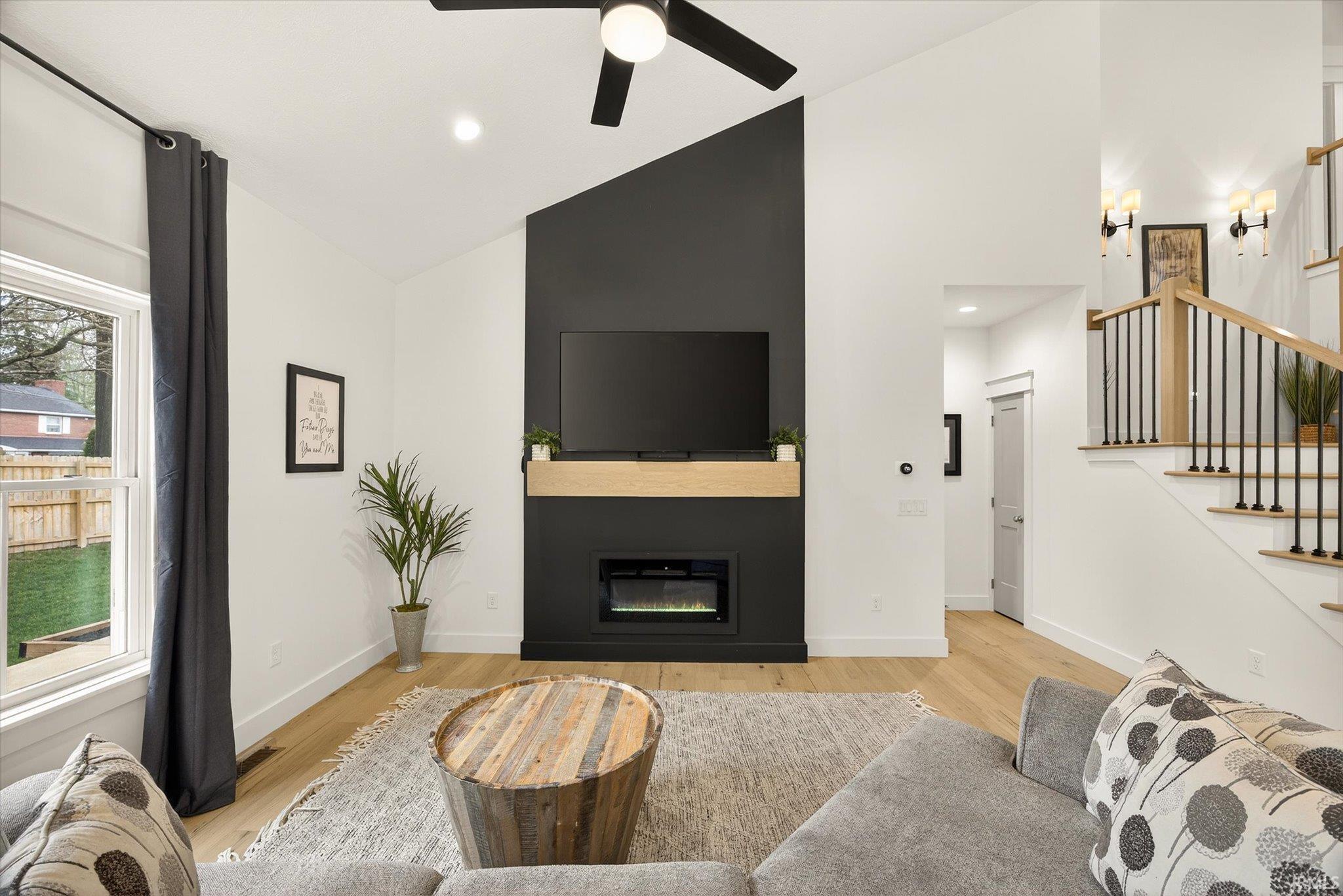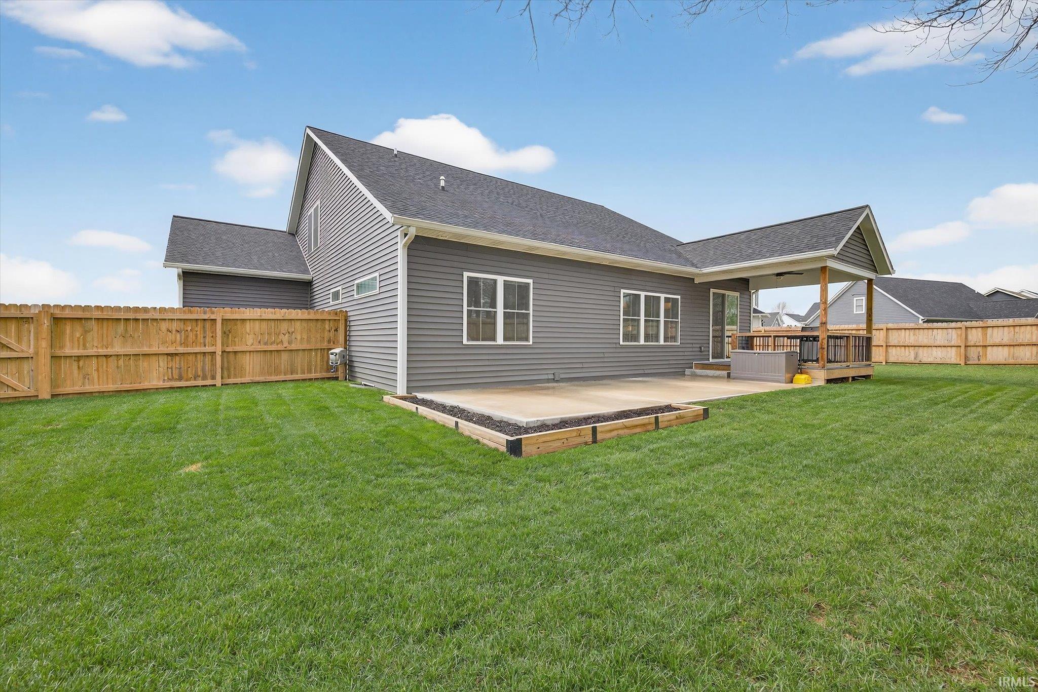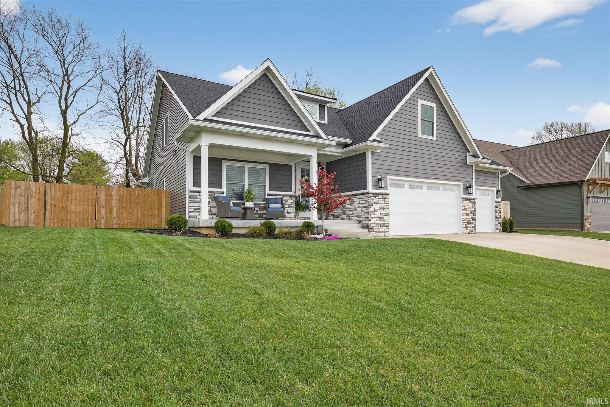 Welcome to this nearly new 5-bed, 3.5-bath home with a 3-car garage in desirable Charlestowne Manor, offering exceptional space and craftsmanship. This rare layout offers two primary suites on the main level, perfect for guests or multi-generational living. Step inside to a spacious entryway with custom trim work. The main living area impresses with soaring vaulted ceilings, engineered hardwood floors, a cozy electric fireplace, and a custom Amish kitchen. The upper level has 3 additional bedrooms, a full bath, and charming balconies overlooking the main living area, giving the home an open feel. Enjoy outdoor living year-round with covered front and back porches, plus an expansive concrete patio that spans the length of the home, ideal for entertaining or relaxing in the fully fenced backyard. Additional upgrades include plantation shutters, room-darkening blinds, and tinted upper-level windows for comfort and efficiency. Located near from Bloomington's west side shopping and dining and less than 15 minutes from IU's campus, this home boasts space and style, and convenience.