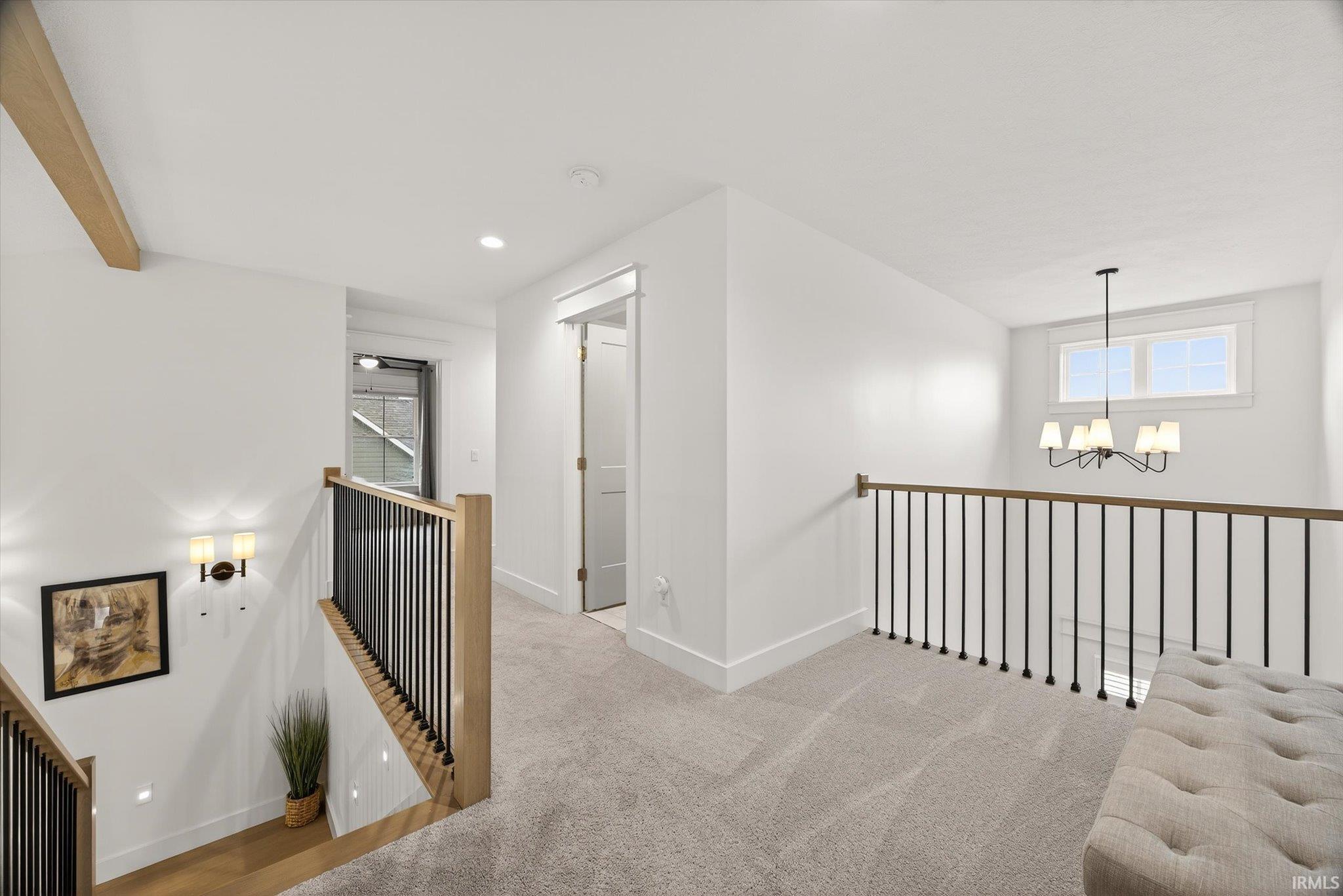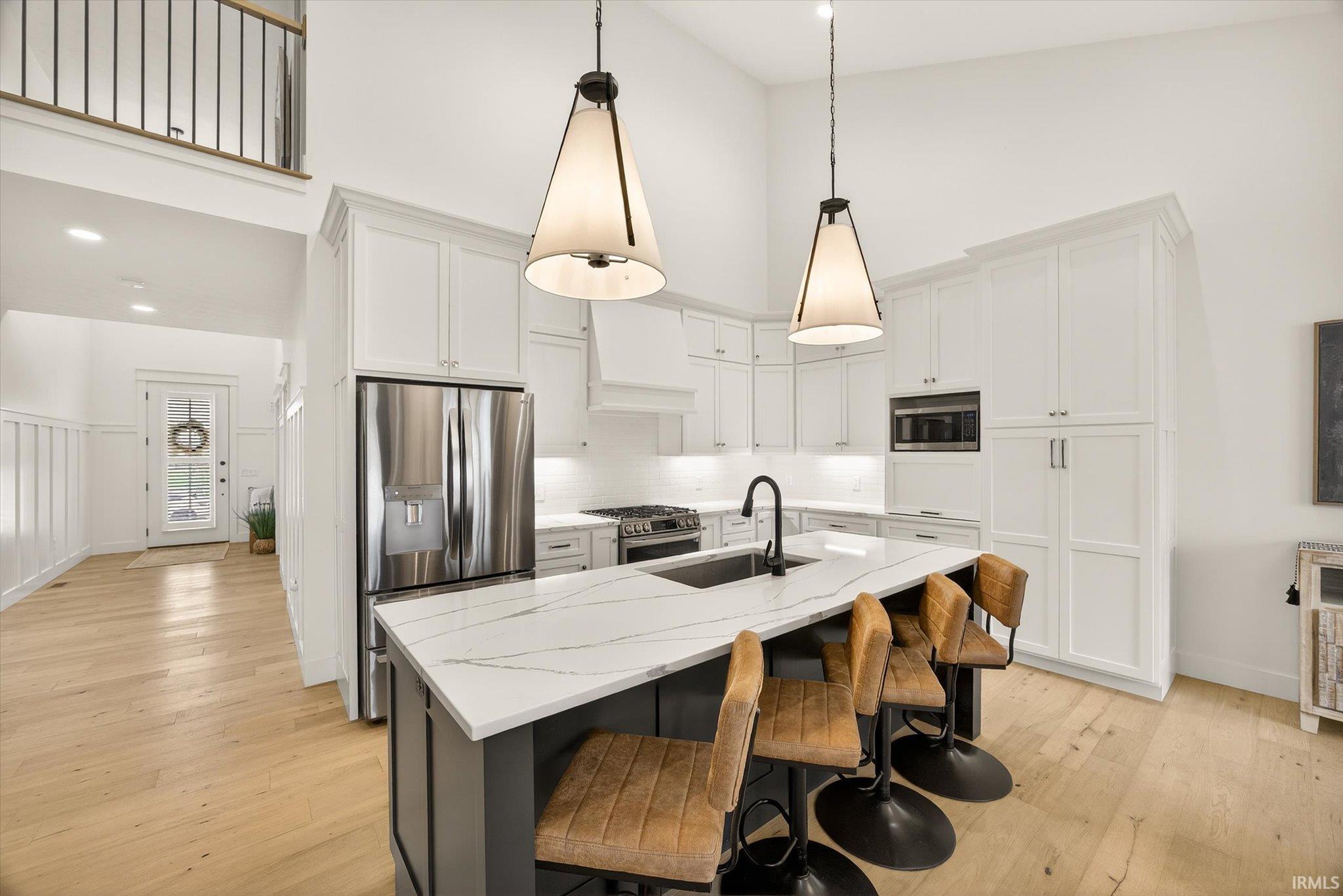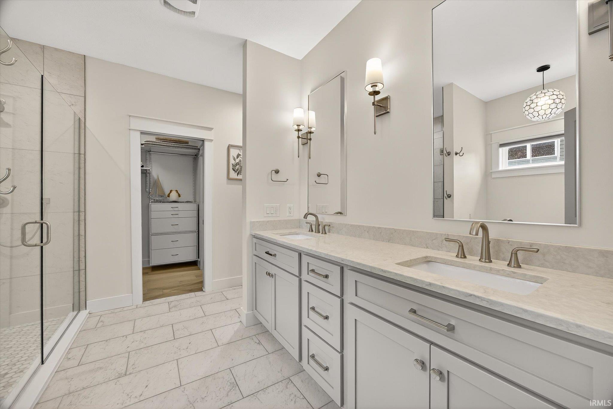 Welcome to this nearly new 5-bed, 3.5-bath home with a 3-car garage in desirable Charlestowne Manor, offering exceptional space and craftsmanship. This rare layout offers two primary suites on the main level, perfect for guests or multi-generational living. Step inside to a spacious entryway with custom trim work. The main living area impresses with soaring vaulted ceilings, engineered hardwood floors, a cozy electric fireplace, and a custom Amish kitchen. The upper level has 3 additional bedrooms, a full bath, and charming balconies overlooking the main living area, giving the home an open feel. Enjoy outdoor living year-round with covered front and back porches, plus an expansive concrete patio that spans the length of the home, ideal for entertaining or relaxing in the fully fenced backyard. Additional upgrades include plantation shutters, room-darkening blinds, and tinted upper-level windows for comfort and efficiency. Located near from Bloomington's west side shopping and dining and less than 15 minutes from IU's campus, this home boasts space and style, and convenience.
